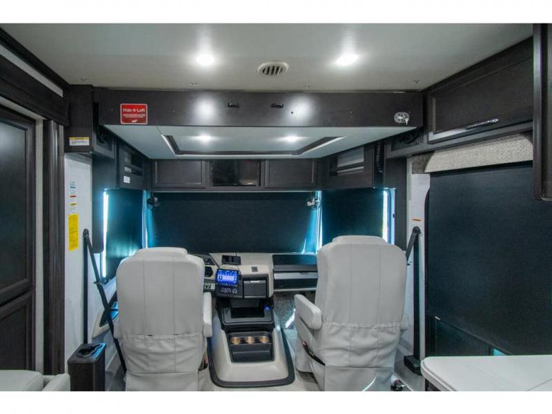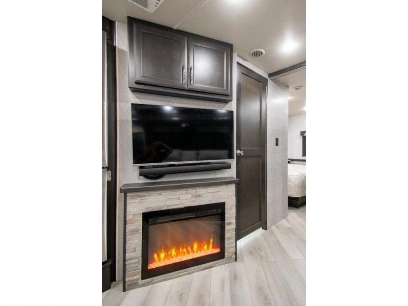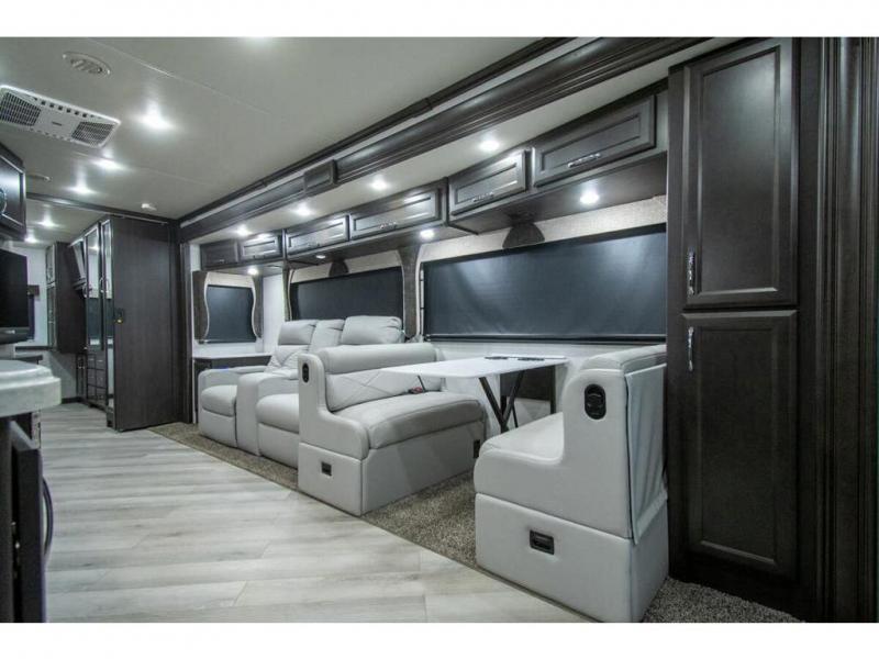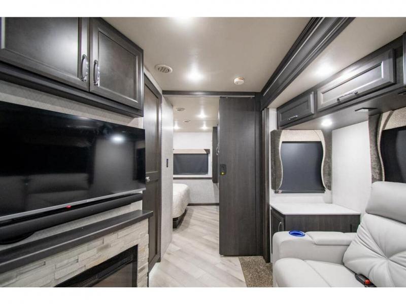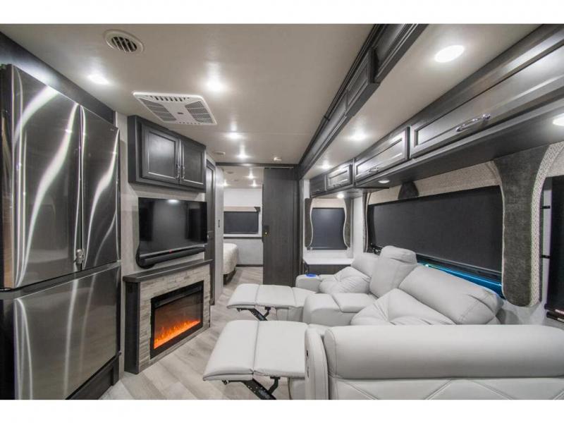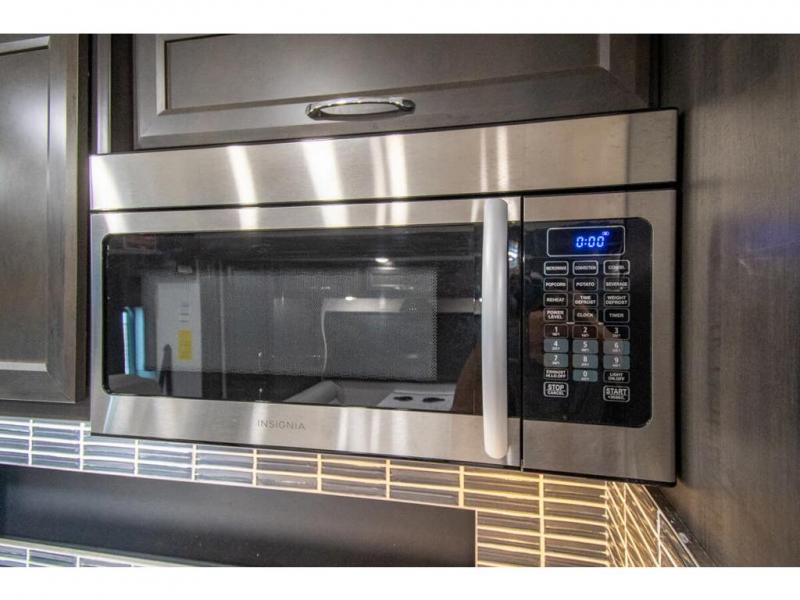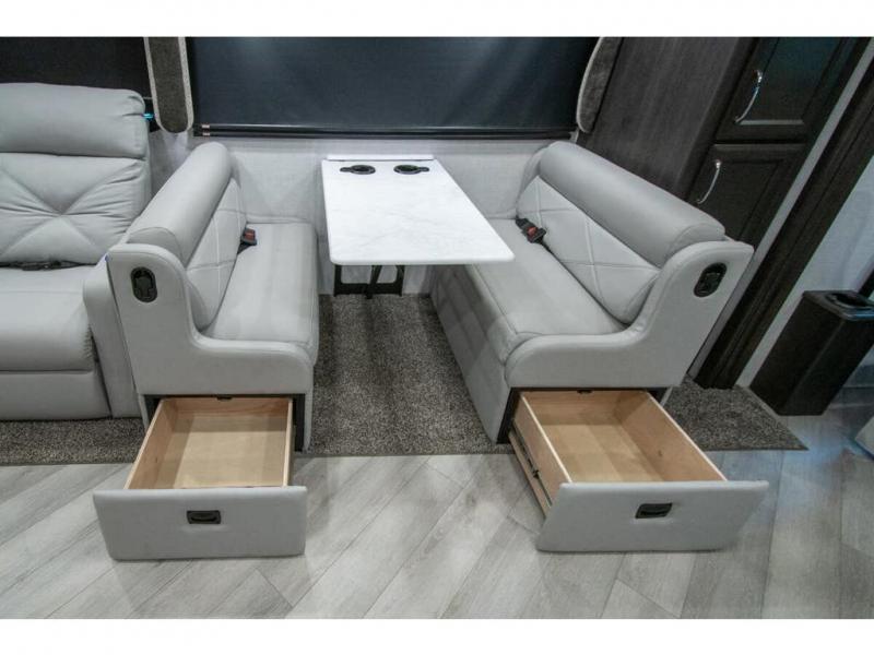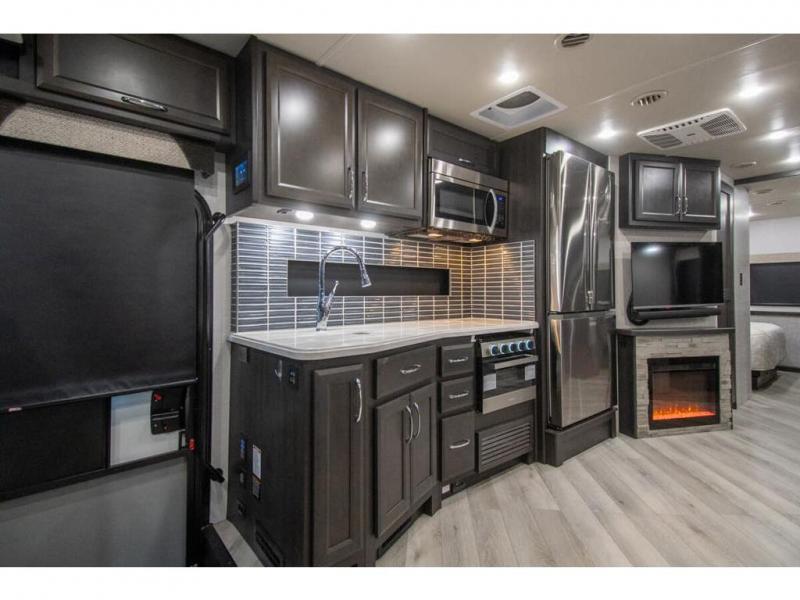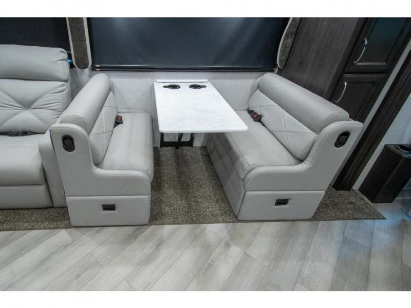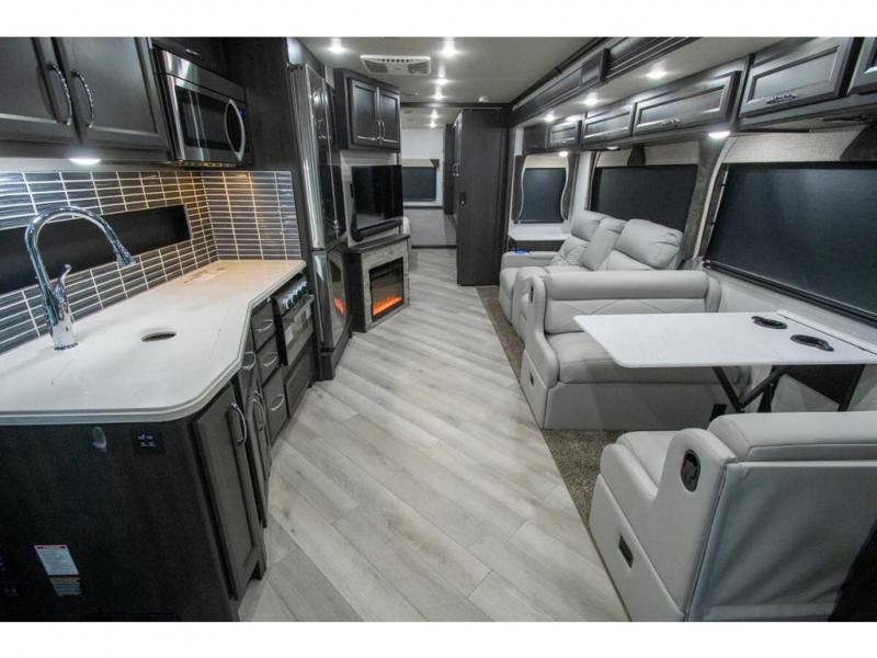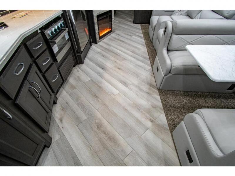 Get ready to live in this coach with all the amenities of home, yet your destination can change when you like! The rear bedroom offers a slide out king bed with CPAP storage above, plus wardrobes, a dresser and an LED TV to watch at night. The full bathroom offers a 24" x 40" shower with a seat so you can relax after shopping in town or hiking the trails. When you get hungry, the full kitchen offers a residential refrigerator, a convection microwave and pantry for all your goodies. The jackknife sofa and end table are across from the LED TV with a fireplace below for a great place to watch your shows, and the rest EZ dinette gives you a place to dine and even work if you need to. You can also enjoy your coffee while sitting in the driver and passenger seats that swivel with a pedestal table in between.