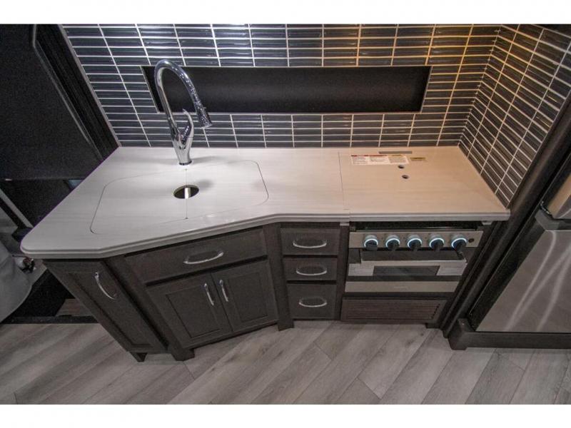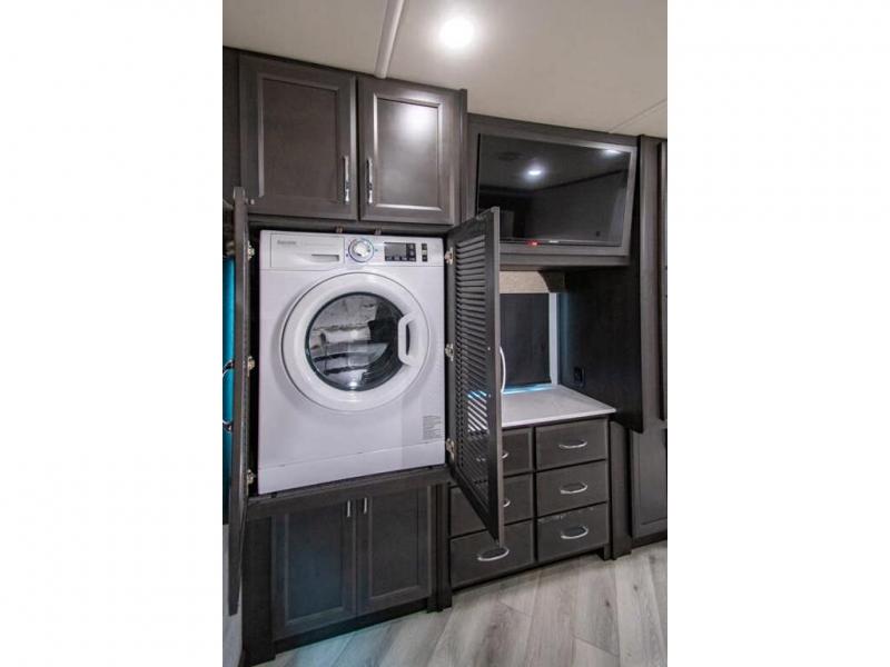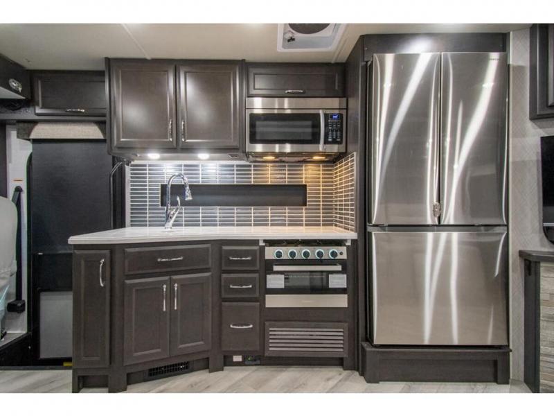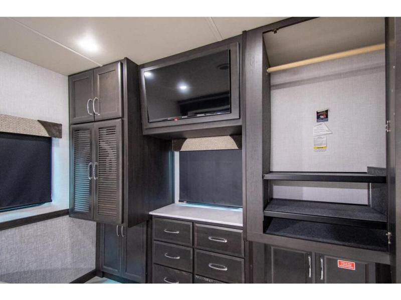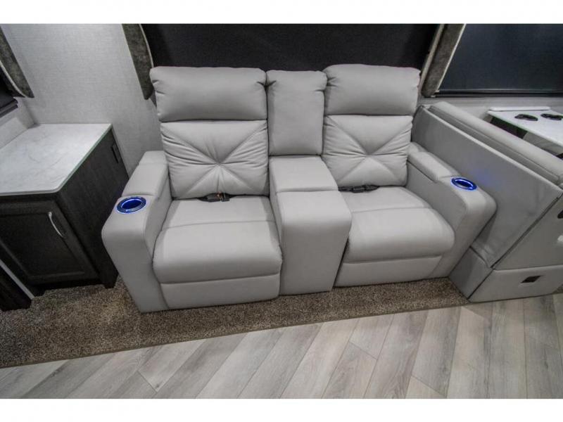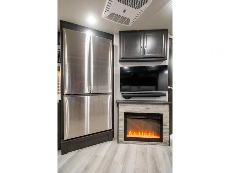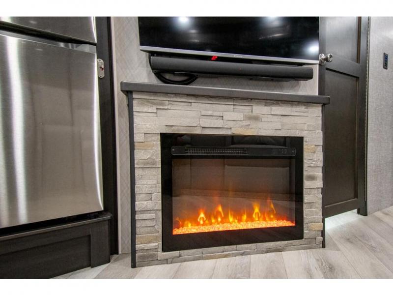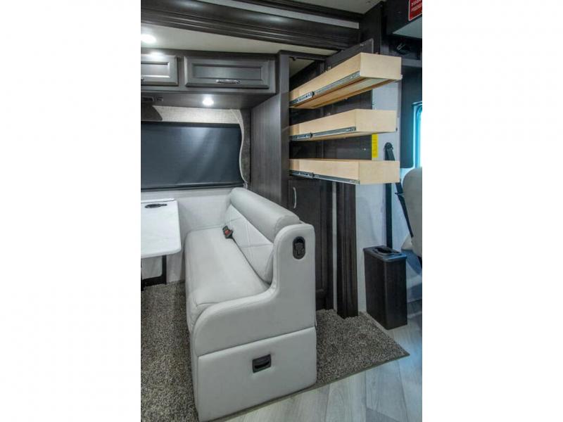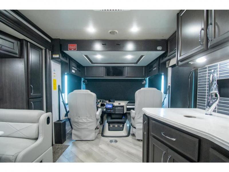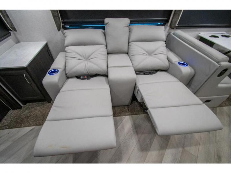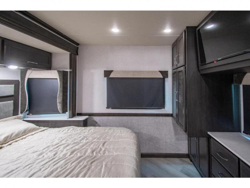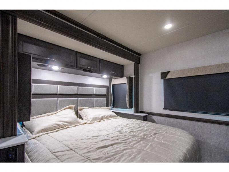 Get ready to live in this coach with all the amenities of home, yet your destination can change when you like! The rear bedroom offers a slide out king bed with CPAP storage above, plus wardrobes, a dresser and an LED TV to watch at night. The full bathroom offers a 24" x 40" shower with a seat so you can relax after shopping in town or hiking the trails. When you get hungry, the full kitchen offers a residential refrigerator, a convection microwave and pantry for all your goodies. The jackknife sofa and end table are across from the LED TV with a fireplace below for a great place to watch your shows, and the rest EZ dinette gives you a place to dine and even work if you need to. You can also enjoy your coffee while sitting in the driver and passenger seats that swivel with a pedestal table in between.