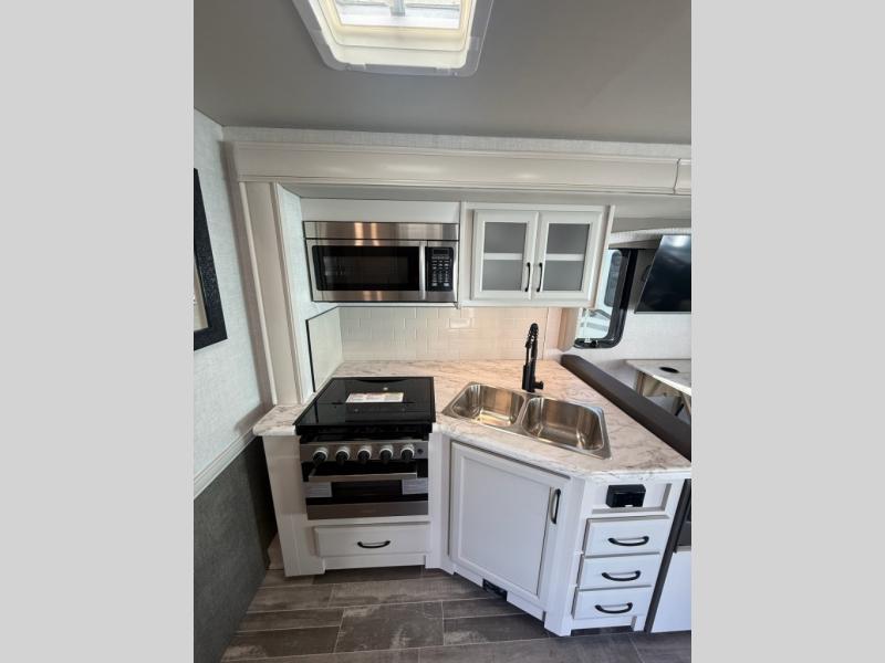 If you're hoping for a luxurious getaway, look no further than this Flair Class A gas motorhome! You can sleep in peace in your own private bedroom, and the full bathroom with shower skylight is directly connected to the bedroom for easy morning routines. Next to the residential refrigerator is a pantry, so you have great kitchen storage, and you also have a three-burner range to cook those foods on. A jackknife sofa gives you lounging and sleeping space, and you have a Wi-Fi Ranger Sky4 to keep connected to the modern world.