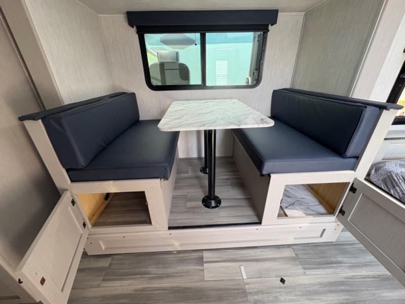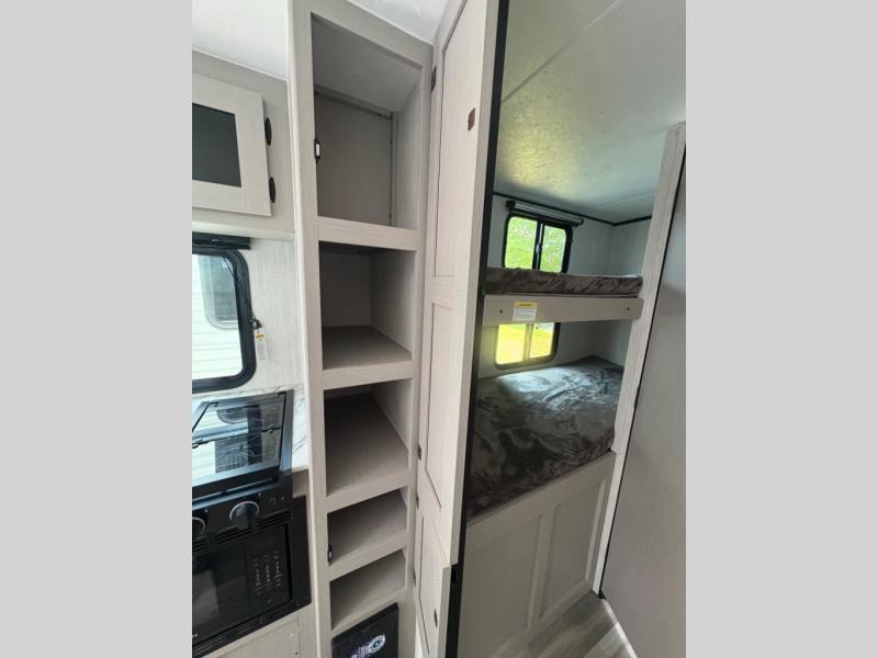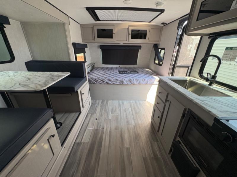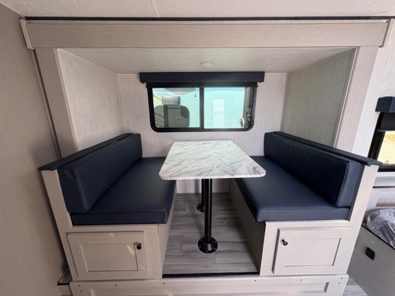 You will have more interior space with a booth dinette slide in this travel trailer! The chef will love cooking indoors with the two burner cooktop, microwave, and 8 cu. ft. 12V refrigerator, as well as outdoors with the exterior camp kitchen. Start each morning feeling clean and refreshed after sleeping on the front queen bed with a headboard and showering in the tub/shower inside the rear corner bathroom, plus the bathroom has a wardrobe to keep your towels close. The kids will love sleeping on the rear corner set of 30" x 74" bunk beds too!