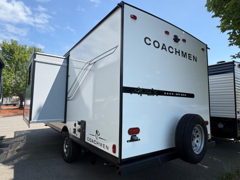 You will find comfort, convenience, and a sturdy construction with each of these Coachmen RV Apex Nano travel trailers! They are held together with an aluma-cage construction, an I-beam chassis, plus vacuum-bonded laminated dual Azdel fiberglass walls for double the protection against the elements. The 200-watt solar panel with a 30 amp control charger is included within the Off-Grid Package, along with two 20 lb. LP tanks, a high velocity power roof vent, plus 12V outlets to keep you powered up. More exterior feature include a hot/cold shower, four stabilizer jacks, a power awning with LED lighting, and magnetic baggage door catches to easily pack and unload your gear. You will love the interior of your Apex Nano with Shaw residential flooring, one-piece seamless edge countertops, matte black hardware in the galley, and a hand-crafted wood medicine cabinet in the bath.