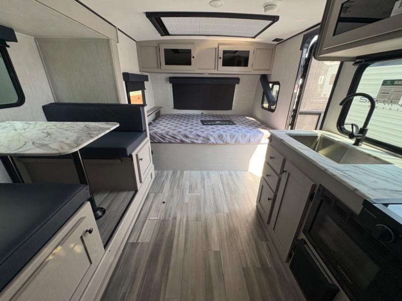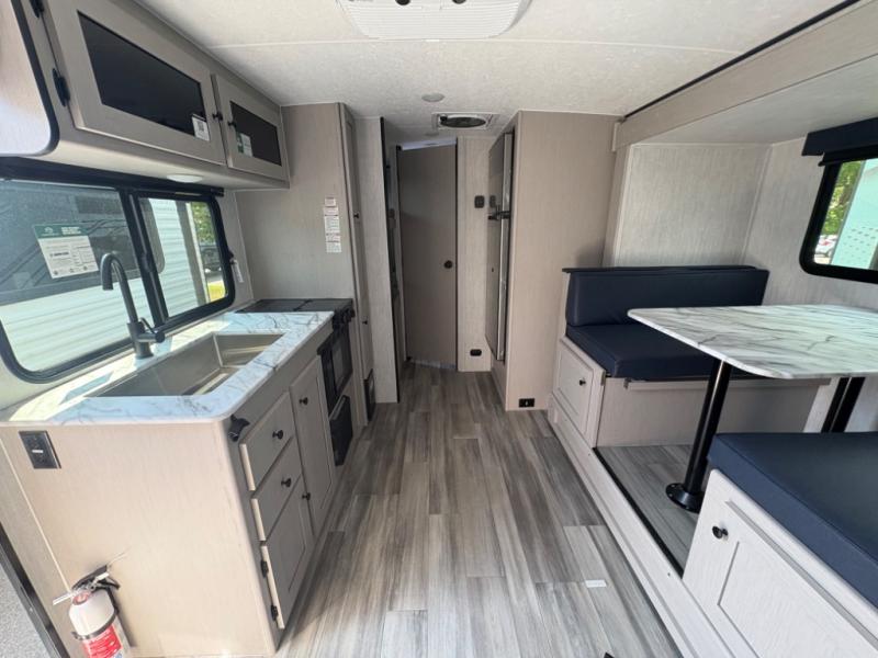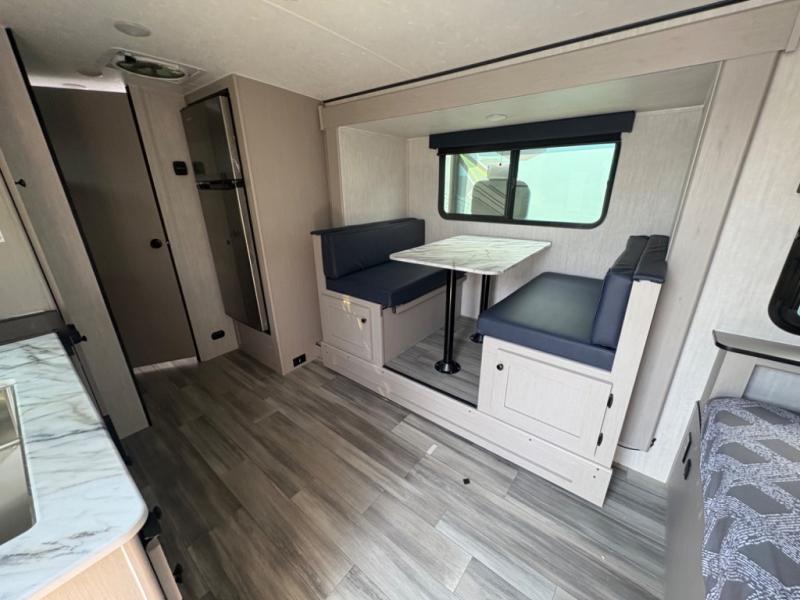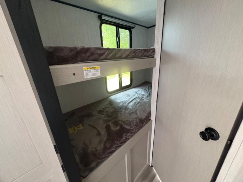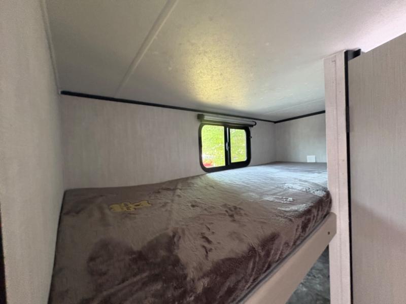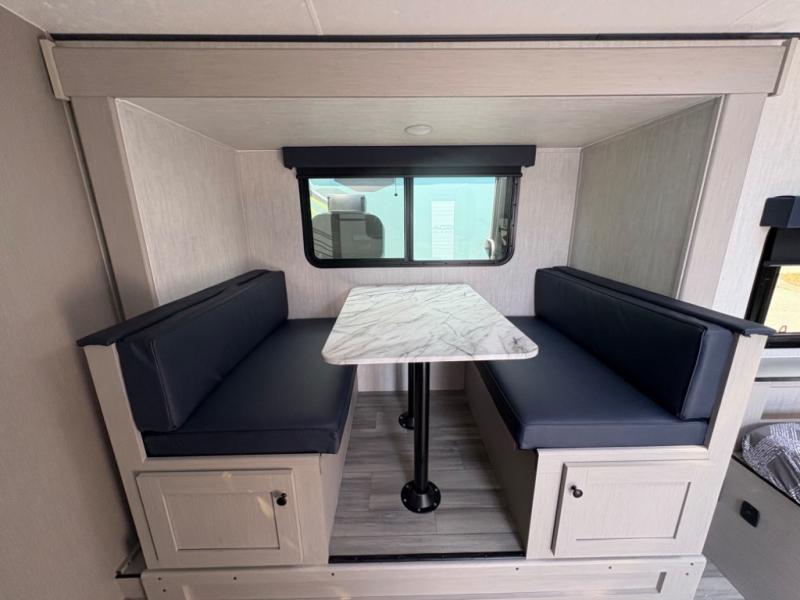 Inside, the front queen bed provides a comfortable place to recharge after a day of exploring, while the rear bunk bedsoffer dedicated sleeping space for kids or guests. The slide-out dinette opens up the living area and easily converts into extra sleeping space, making this layout both practical and versatile.