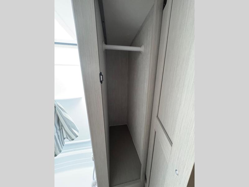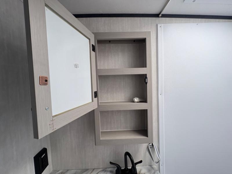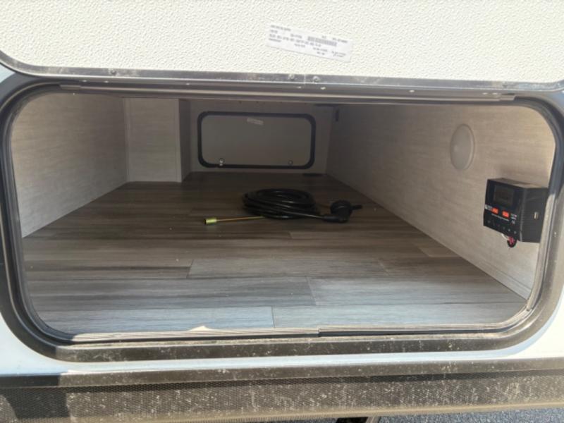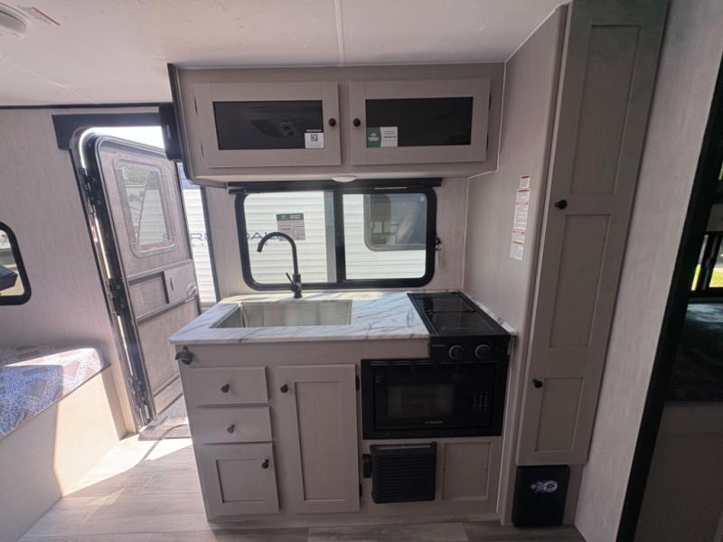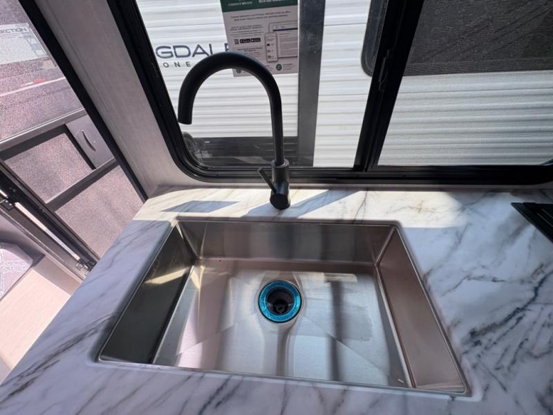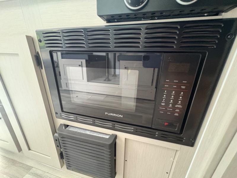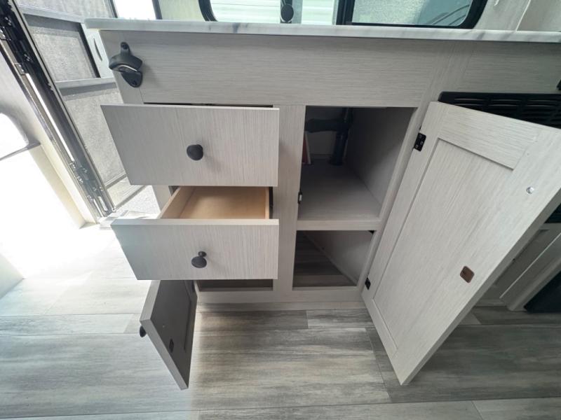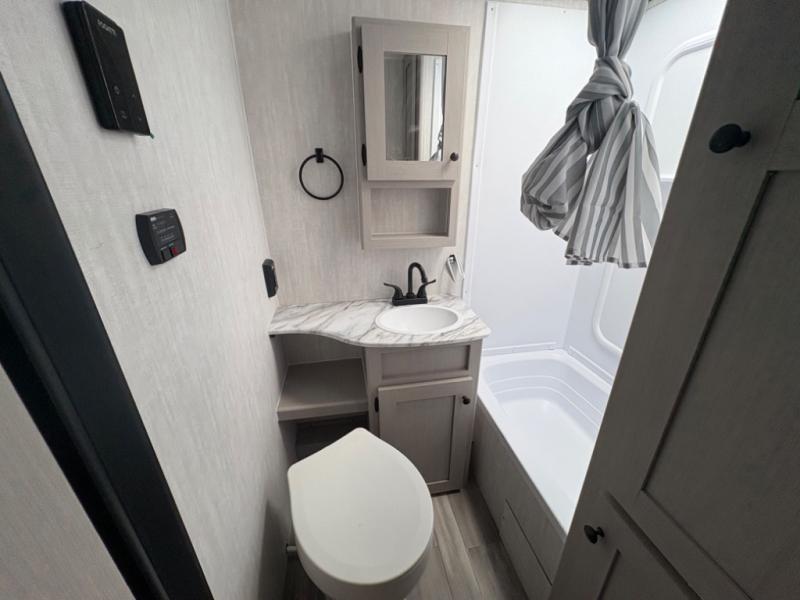 The well-equipped kitchen features a two-burner cooktop, microwave, and refrigerator, plus an exterior camp kitchenthat lets you enjoy cooking outdoors. A rear corner bathroom with a tub/shower, toilet, and vanity adds everyday convenience wherever you travel.
