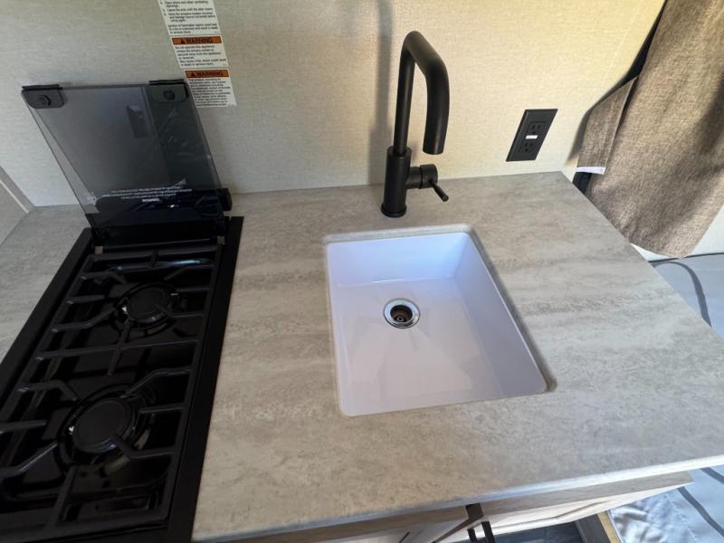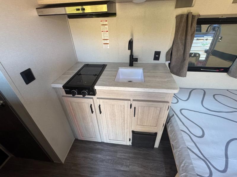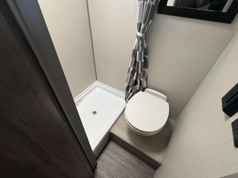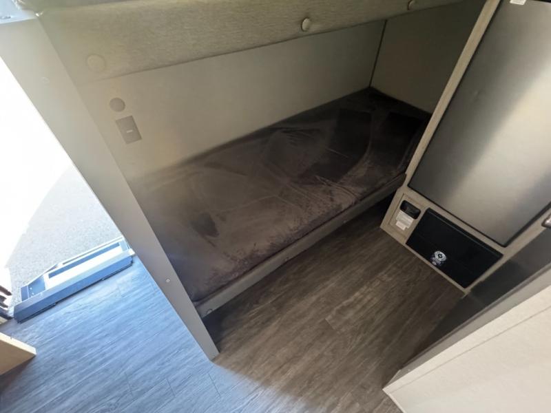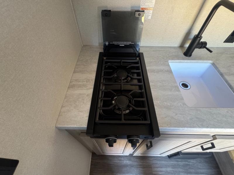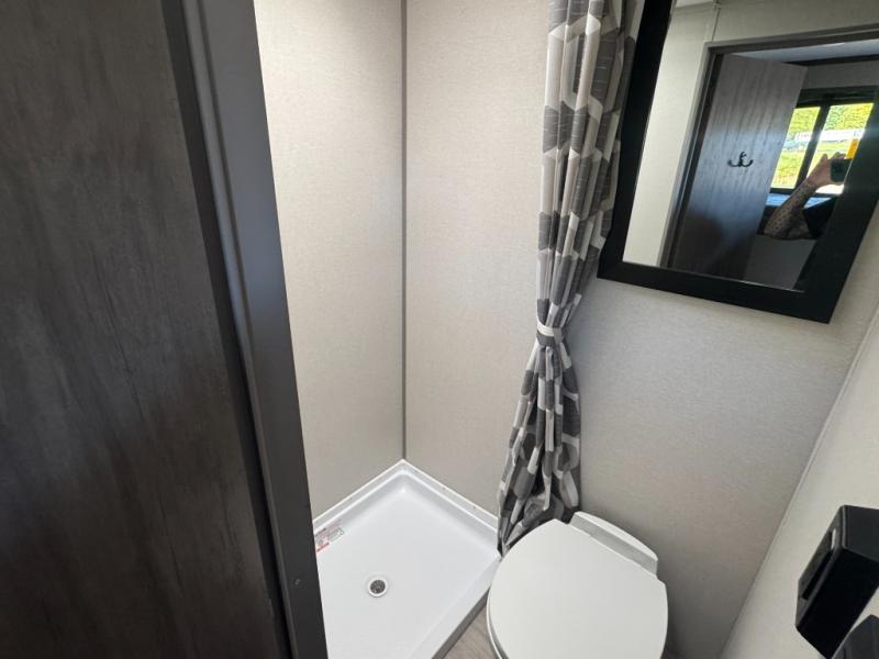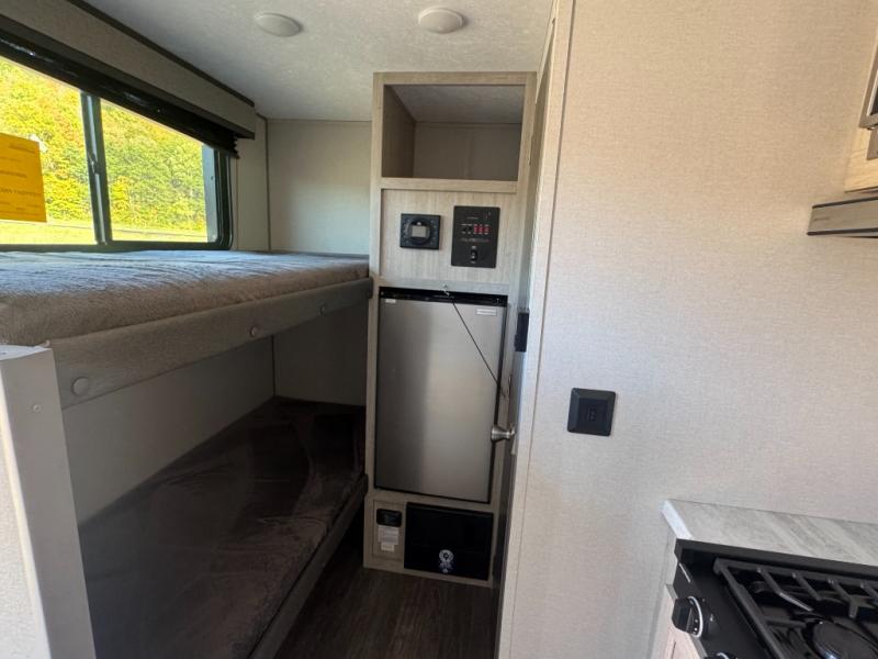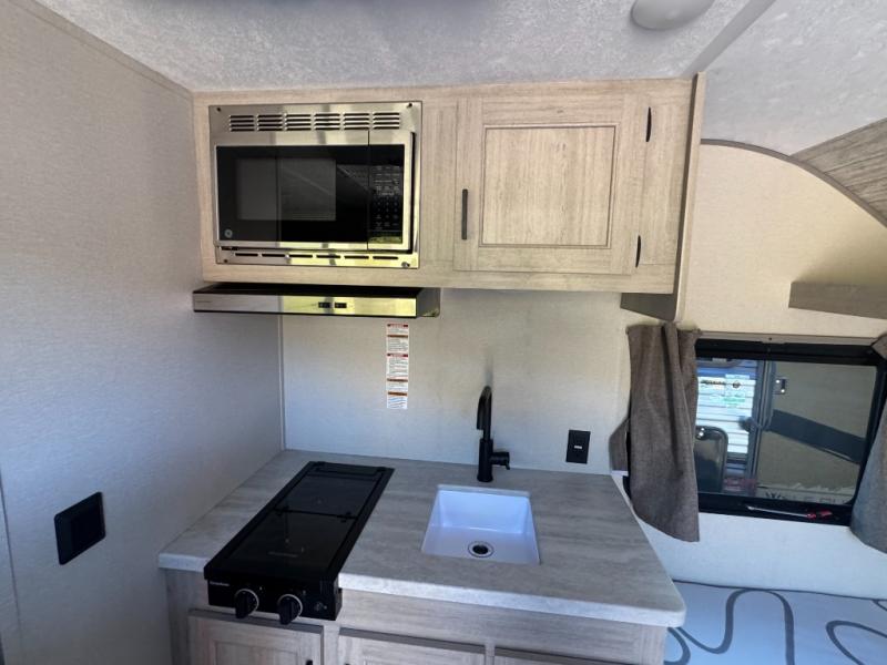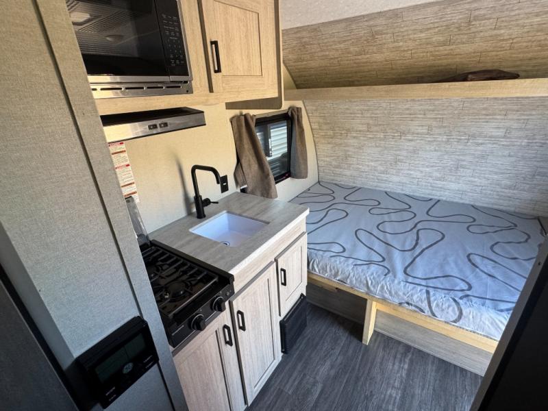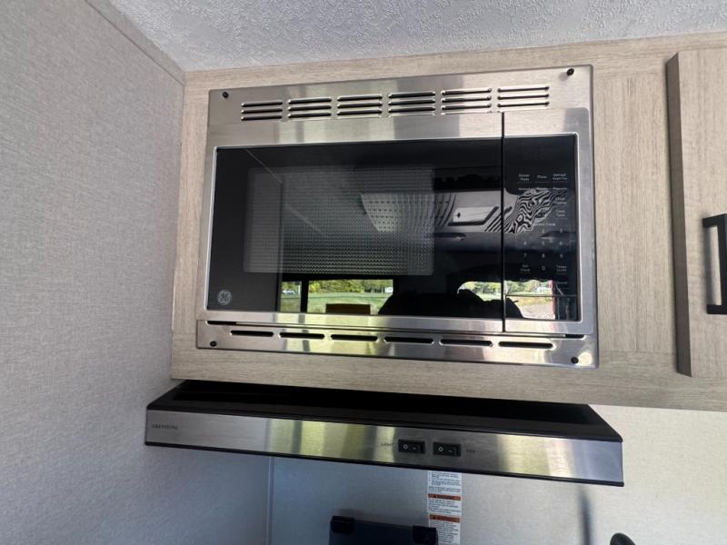 This lightweight travel trailer includes everything you need for comfortable camping trips at the lake. You can make your meals on the two burner cooktop or in the stainless steel microwave, and a 3.3 cu. ft. 12V refrigerator will keep leftovers fresh. A front queen bed provides a great night's rest, and there are 29" x 70" bunk beds for your guests or little ones. And a private bath with a 24" x 32" shower and toilet will let you easily freshen up without having to use the camp's facilities!