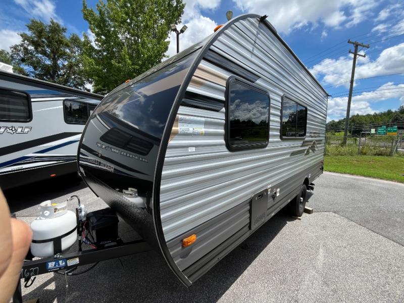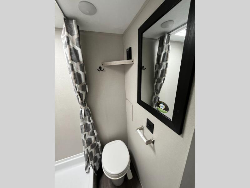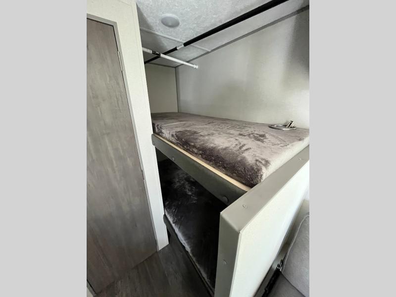 This cozy travel trailer can sleep five, so pack up and head out! You will have a queen bed up front to sleep on each night instead of an air mattress, and the little ones can take the 28" x 70" bunk beds! There is also a 60" sofa here that can sleep an additional guest and is perfect for relaxing during the day. The two burner cooktop and microwave oven means you won't have to cook over a campfire, and the private toilet and shower lets you clean up after a day outdoors. This model includes plenty of storage space, including bedroom storage, an exterior pass-through, plus additional outside storage beneath the bunks for hiking gear!