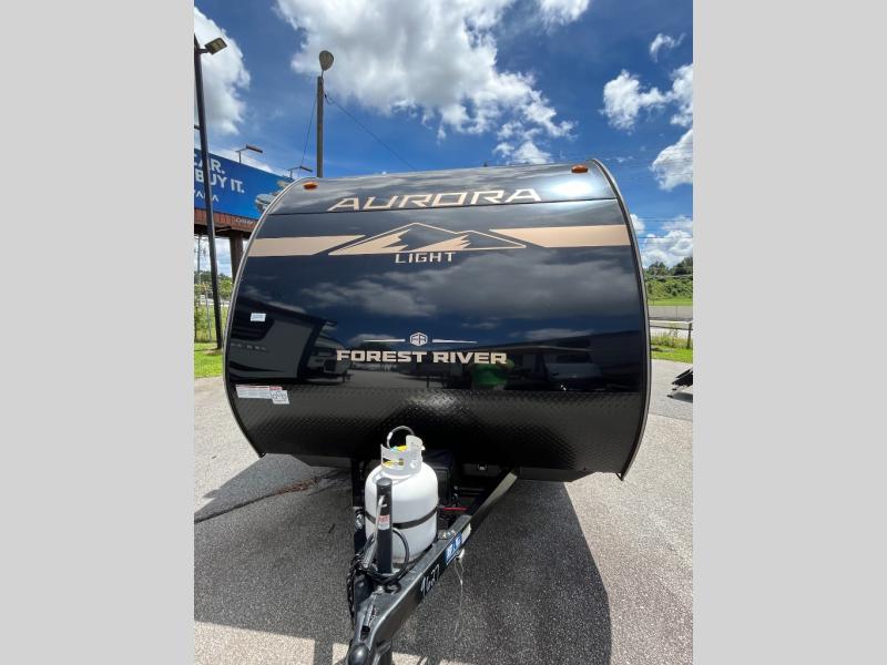 Comfortability, usability, and quality is what you will find in each one of these Forest River Aurora Light travel trailers! They are designed with a superior build and packed full with industry leading, functional, and distinctive standard features. The diamond plate rock guard will protect your unit from road debris and the nitrogen filled radial tires, which keep their pressure longer, offer better fuel economy. You will also find upgraded JBL Elite exterior speaker outside, an electric awning with multicolor lights and remote, plus flush mount baggage doors for easy packing. The interiors are beautifully designed with matte black kitchen and bath faucets, black nightshades in the living room, and GE kitchen appliances!