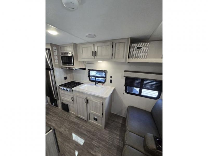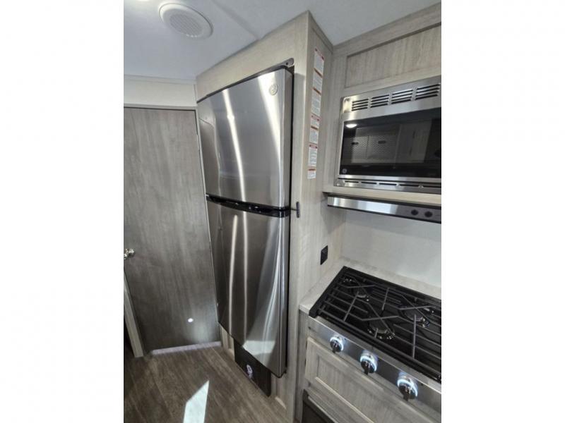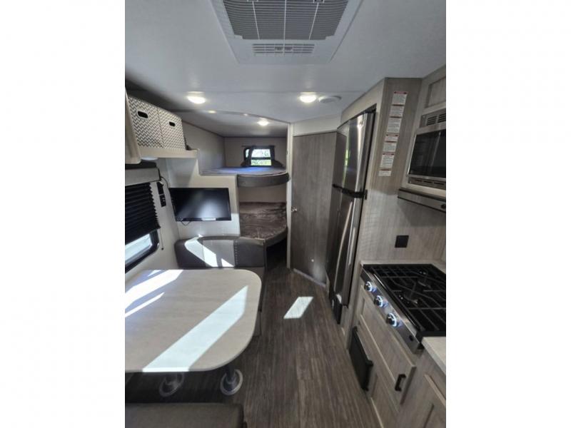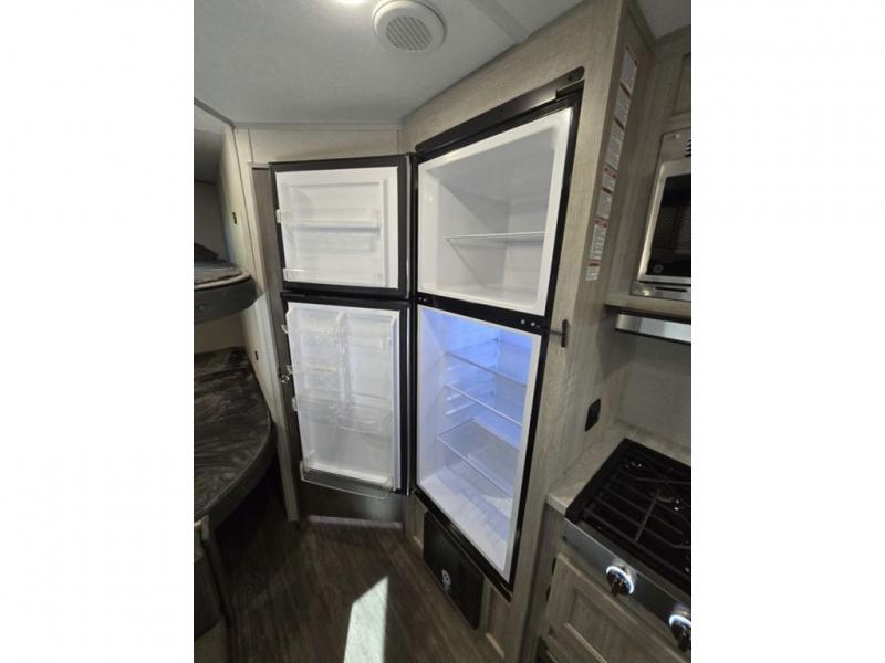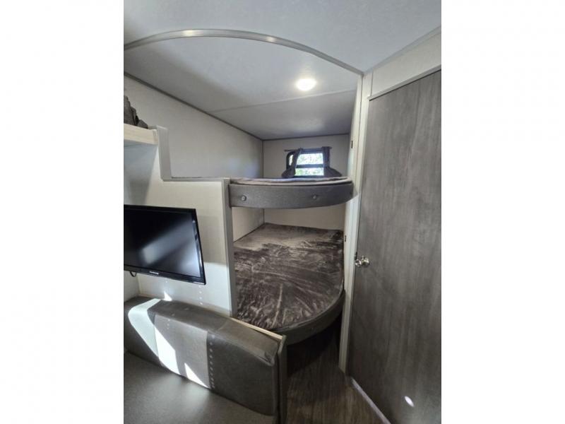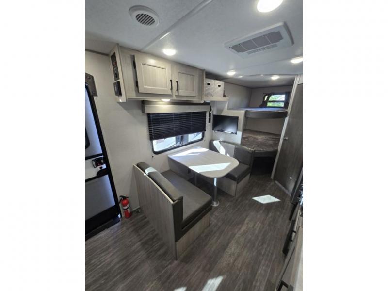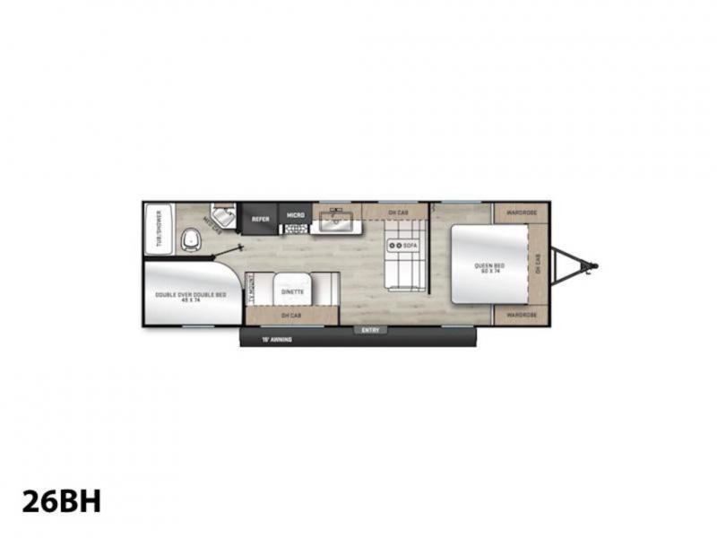 Pack your bags and head out on a fun weekend camping trip with this travel trailer! Whether you have a small family or a few guests wanting to come along, there will be enough sleeping spaces between the double-size bunk beds, the 60" x 74" queen bed in the front semi-private bedroom, and even the booth dinette. The chef can prepare meals indoors using the three burner cooktop or microwave oven, and there is a 12V 10.7 cu. ft. refrigerator for perishables. There is plenty of storage throughout with the overhead cabinets and wardrobes, as well as outside with the front pass-through storage area!