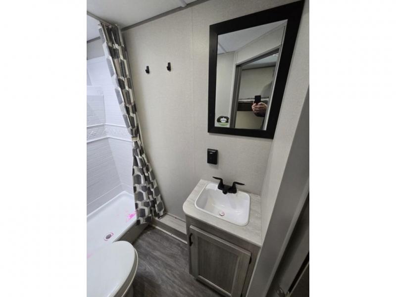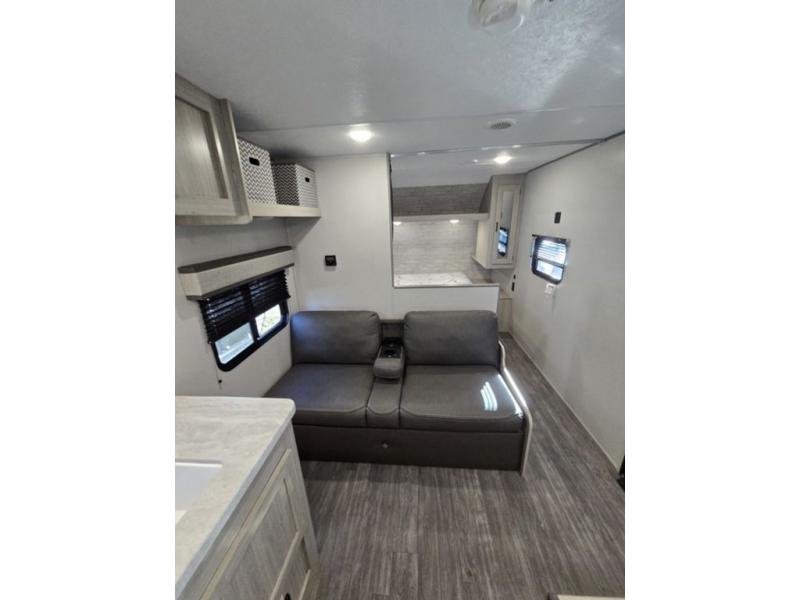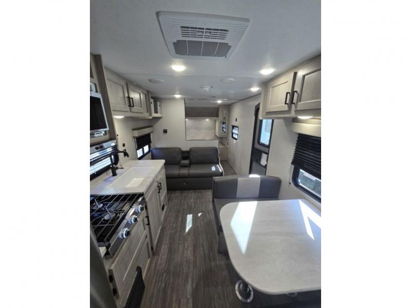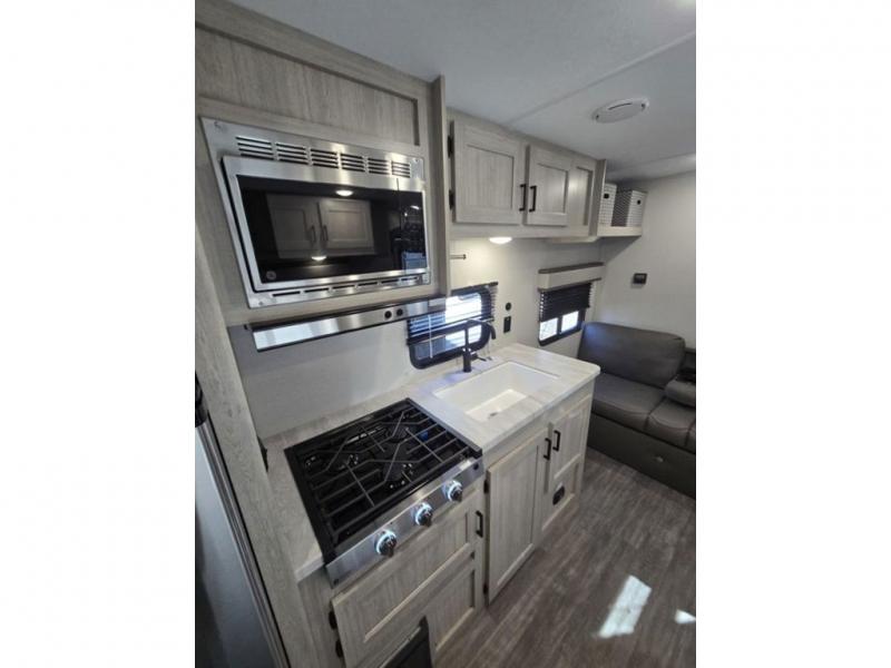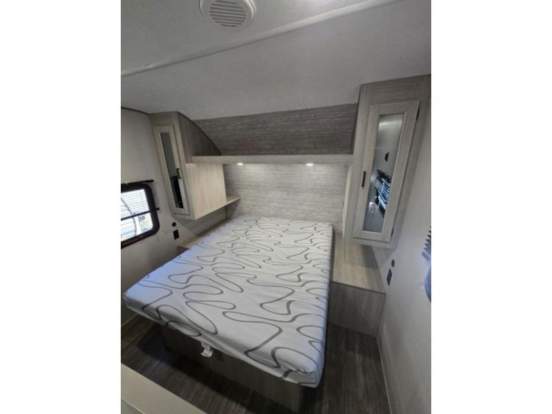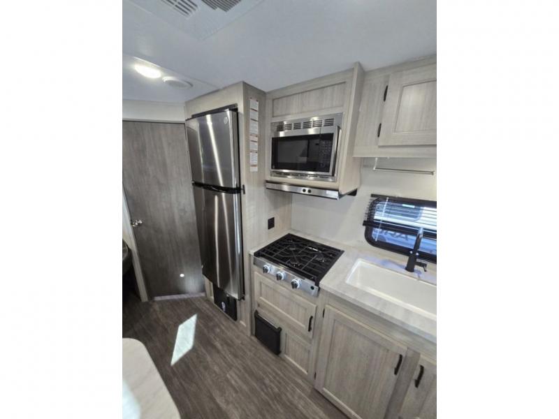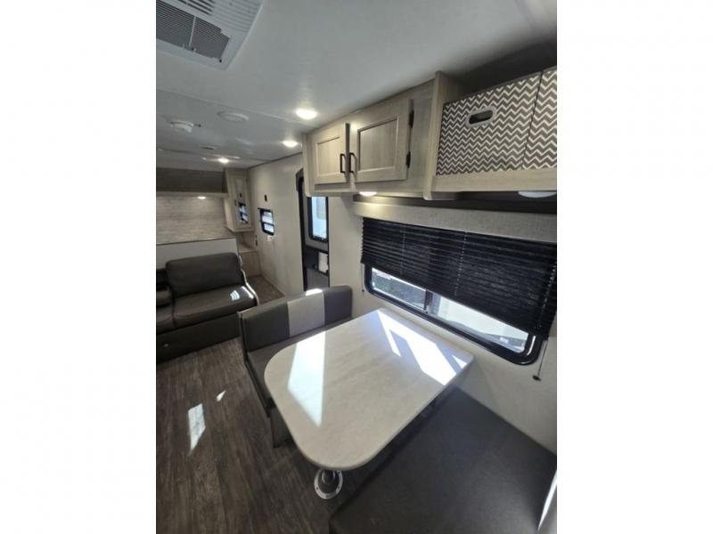 Pack your bags and head out on a fun weekend camping trip with this travel trailer! Whether you have a small family or a few guests wanting to come along, there will be enough sleeping spaces between the double-size bunk beds, the 60" x 74" queen bed in the front semi-private bedroom, and even the booth dinette. The chef can prepare meals indoors using the three burner cooktop or microwave oven, and there is a 12V 10.7 cu. ft. refrigerator for perishables. There is plenty of storage throughout with the overhead cabinets and wardrobes, as well as outside with the front pass-through storage area!