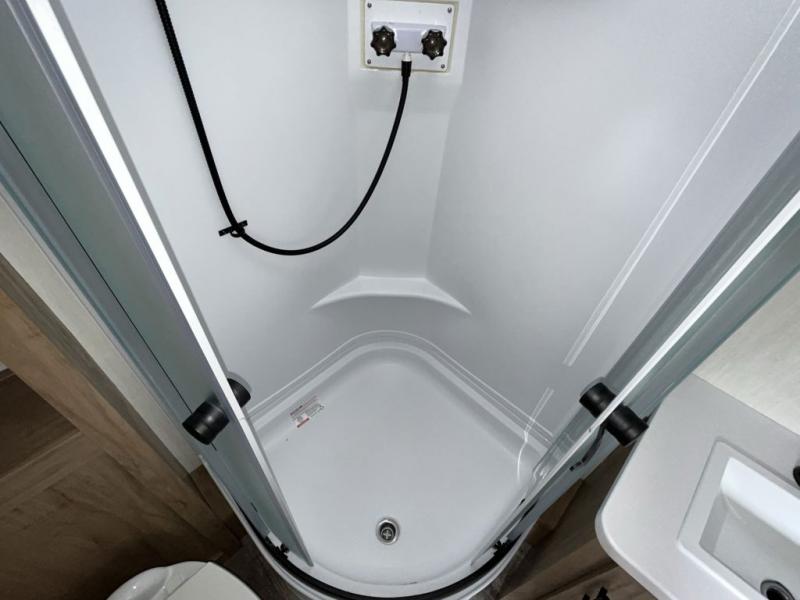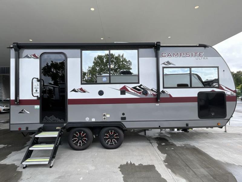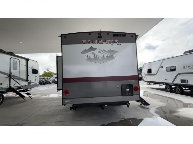 The dinette space offers a comfortable area for dining, planning your next adventure, or catching up on your favorite shows. The rear bathroom includes a roomy shower, vanity, and extra storage options that make longer trips more convenient. With modern construction, sleek exterior styling, and practical features throughout, the 2025 Campsite Reserve 19KB brings a perfect balance of lightweight towing and full-featured comfort.