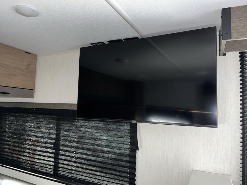 Inside, the spacious king-size bed steals the spotlight, offering premium comfort in a smaller footprint. Whether you’re relaxing after a long day of exploring or settling in for a peaceful night’s sleep, this roomy sleeping area transforms the camping experience into true rest and relaxation. The full kitchen provides ample functionality with quality appliances, a refrigerator, cooktop, microwave, and generous storage solutions so you can prepare meals with ease.