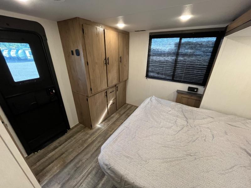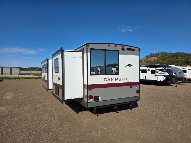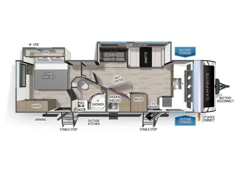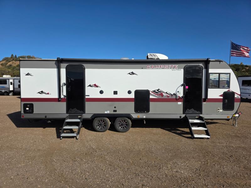 LIKE NEW FRONT KITCHENThe Campsite Ultra 26BW a front kitchen floorplan that will thrill the cook among your crew with the natural light alone. Yes, those rear windows keep everything open and bright, and the hidden pantry behind the entertainment center reaffirms the fact that this front kitchen has everything your camp chef needs to store goods and prep delicious camping meals.