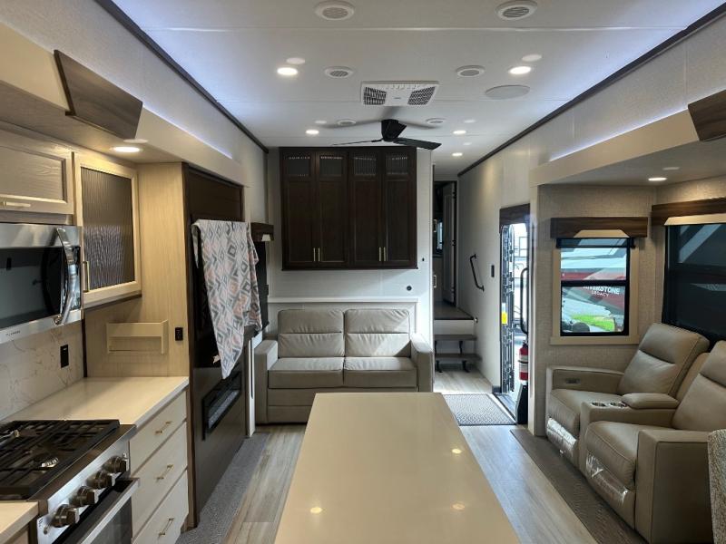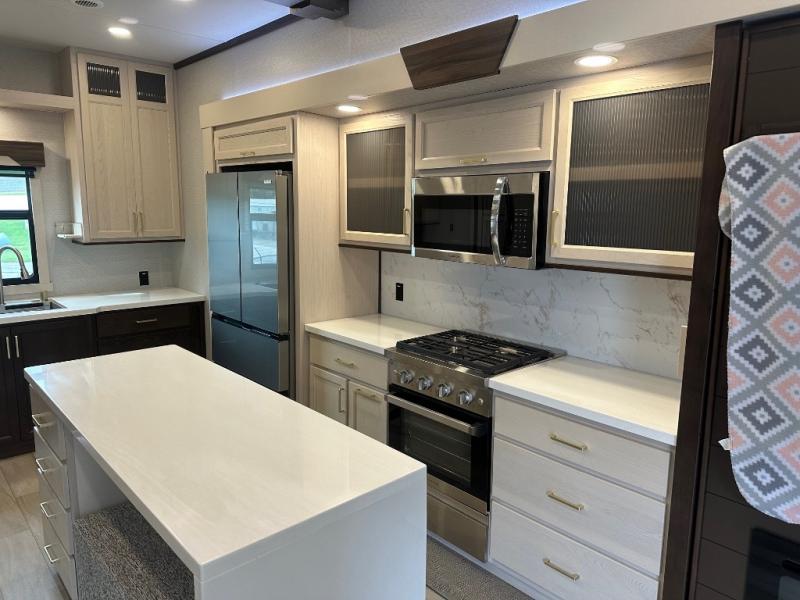 It will feel like coming home each time you take this fifth wheel out! The dual opposing slides in the main living area make your space open, and the waterfall island with swivel chairs will be the perfect place to prep meals, dine together, or set out snacks for movie night! You will also love the rear counter space with a large sink to clean up each day and there is a dishwasher option if you want the option to make the process even easier. A tri-fold sofa in the main living area will provide a place for a guest or two to sleep, and the Murphy pantry hidden behind the entertainment center and fireplace will keep snacks stocked up. The full bath includes a shower with a seat, dual bath sinks, plus a linen closet to keep towels tidy. What could make this fifth wheel better than a king bed slide out in the front bedroom?! How about a large wardrobe with washer/dryer prep, a dresser with a TV above, and overhead storage for belongings!