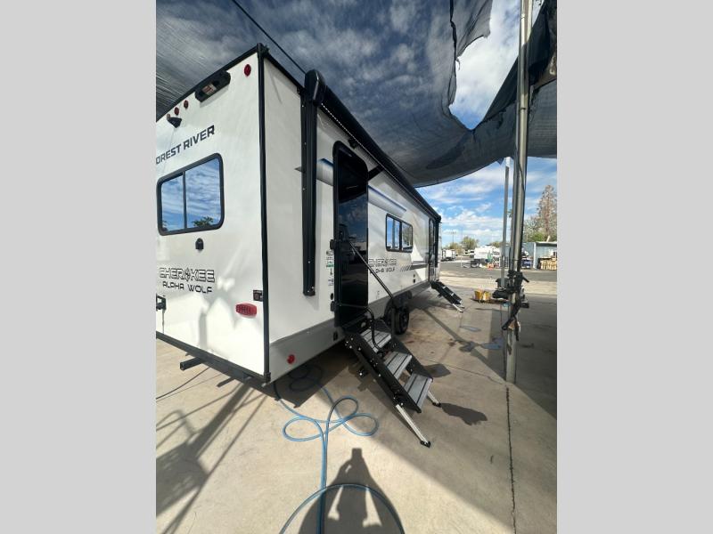 With any Cherokee Alpha Wolf travel trailer by Forest River you'll enjoy outstanding amenities, quality construction, and an affordable price. Each model features a "ToughBend" rigid skirt metal design, 5/8" tongue and groove plywood floor decking, and a "SuperTruss" roof structure that will hold up through years of camping memories. There is a pet friendly "clean sweep" floor design with no heat vents indoors, along with a super lumen lighting system, a 15,000 BTU quick cool central air conditioning, and many more comforts. There are many convenient exterior features such as, Leash Latch pet safety technology, an outside shower with hot and cold water, On The Go rear ladder prep, and exterior steps with oversized landing and quick release. The Weather Guard Package will add protection against the elements with an armored underbelly tank enclosure and forced air heat, thermo-control reflective safety glass windows, and upgraded laminated walls with block foam insulation!