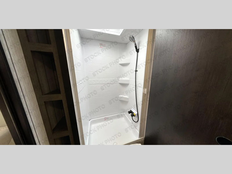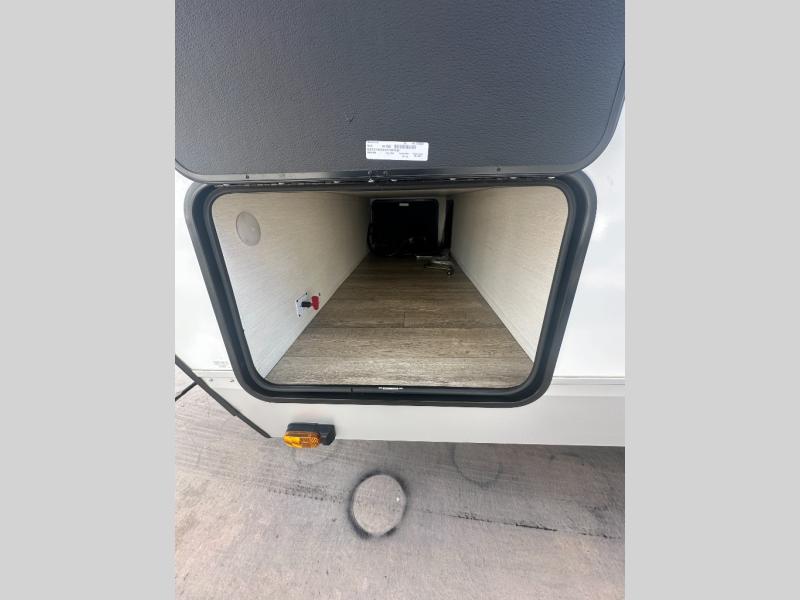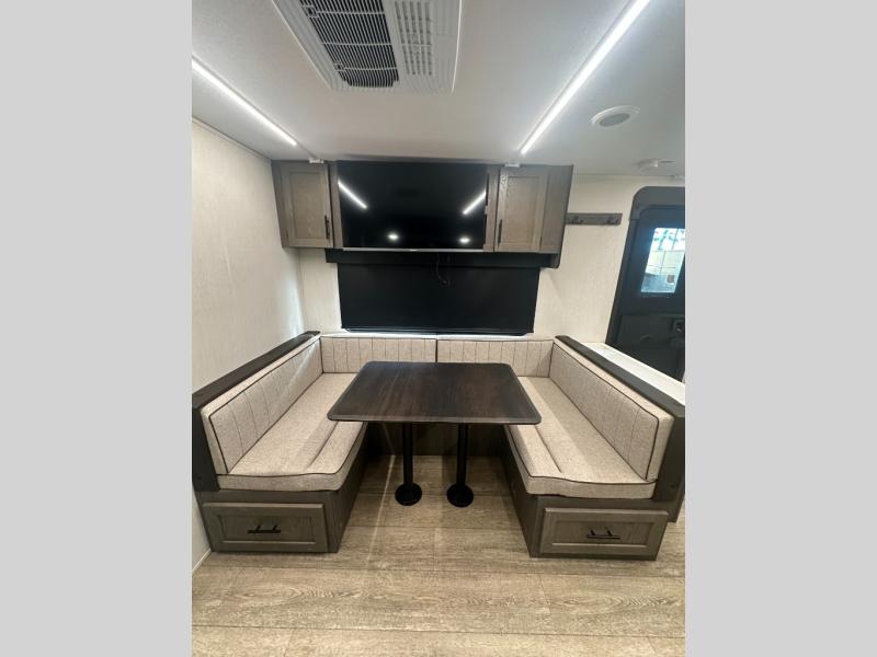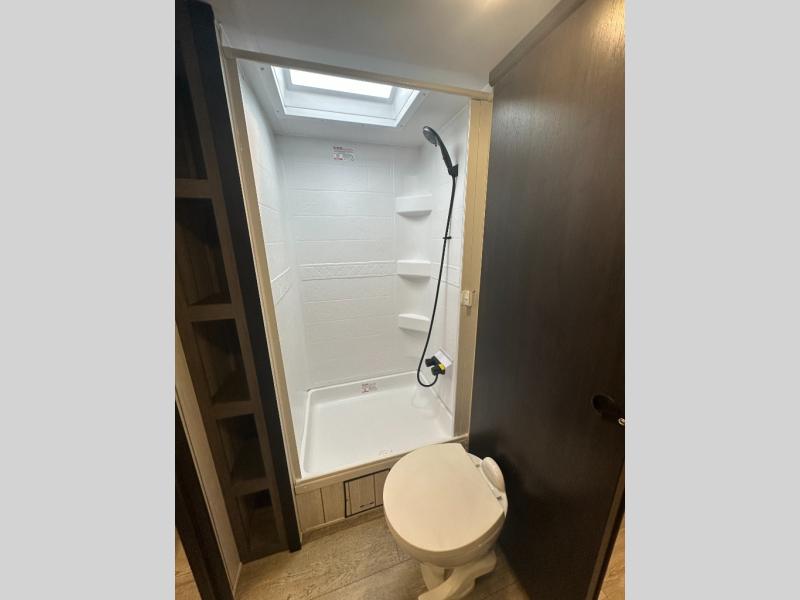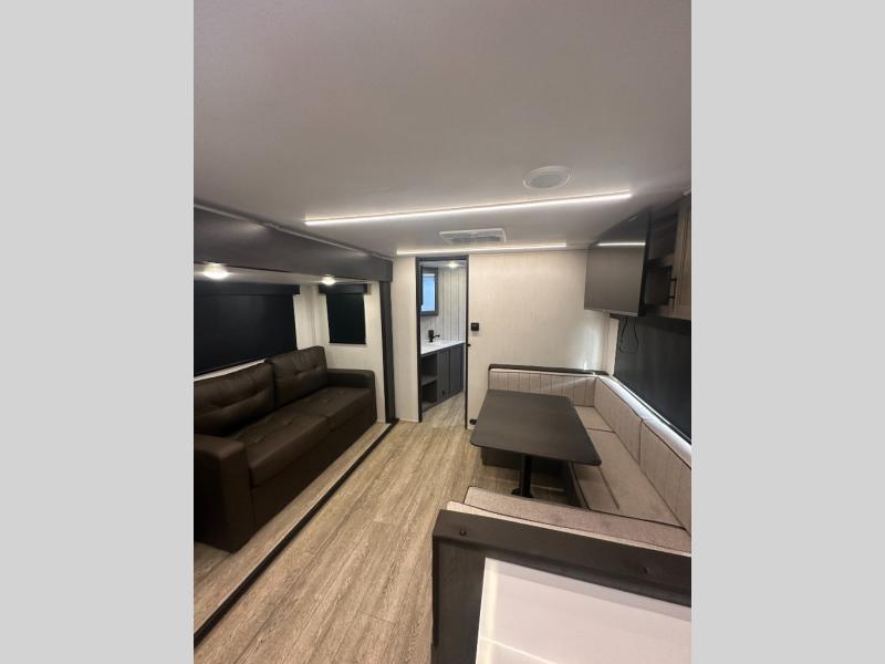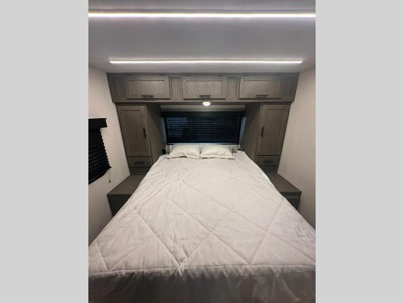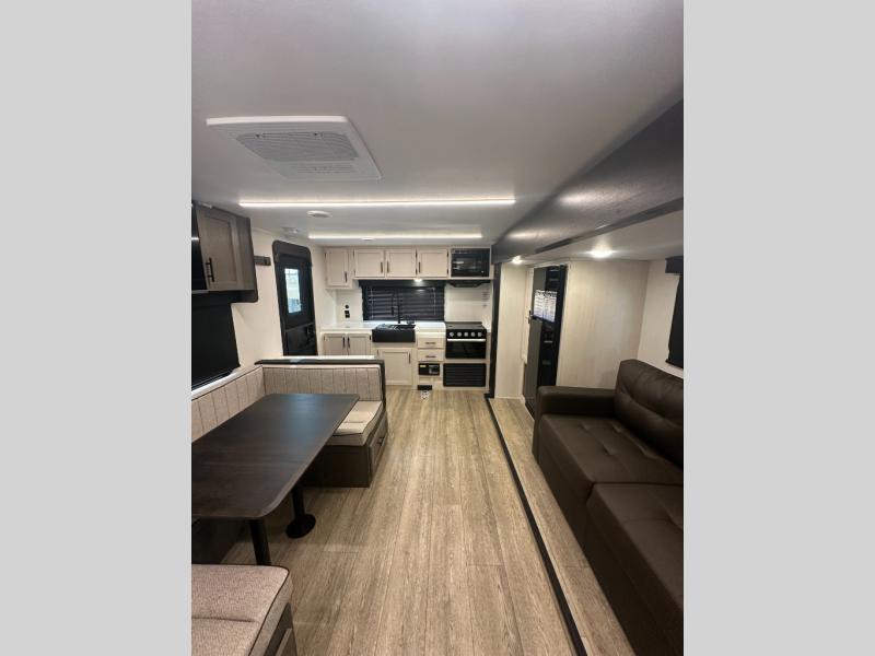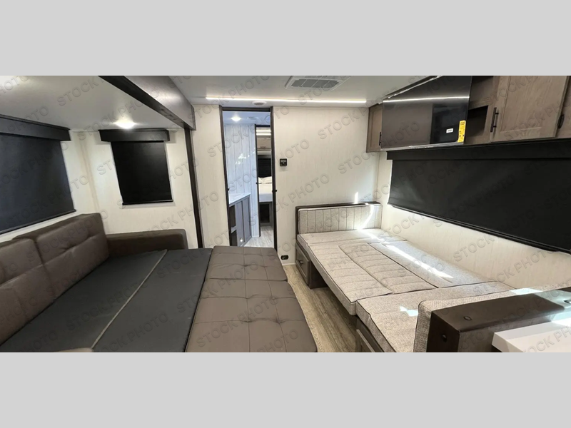 You and your spouse will have a comfortable time camping in this travel trailer! The front private bedroom has a queen bed with wardrobes on either side of it, plus one of the dual entry doors to the unit. As you leave the bedroom, you will enter the walk-through bathroom which has a shower with a skylight above for more head space and natural lighting. The chef can prepare their best home cooked meals in the rear kitchen, and you can enjoy them around the U-shaped dinette before storing any leftovers in the 12V refrigerator. And the tri-fold sofa within the large slide out will provide additional seating and sleeping space!