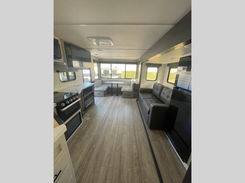 You will love all that this travel trailer has to offer! The rear living area includes a U-shaped dinette with a rear Pano-Vision window plus a tri-fold sofa across from the entertainment center with a fireplace. The kitchen has everything needed for food prep and serving, and the outside kitchen with ice and a refrigerator will be a favorite as well. The 20' awning will provide an outdoor living area; just grab your camping chairs from the outside storage areas. When you want to call it a night, fall quickly to sleep on the queen bed in the front bedroom with easy access to the walk-through bathroom, plus the bedroom has one of the dual entry doors to the unit.