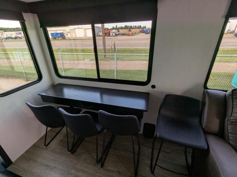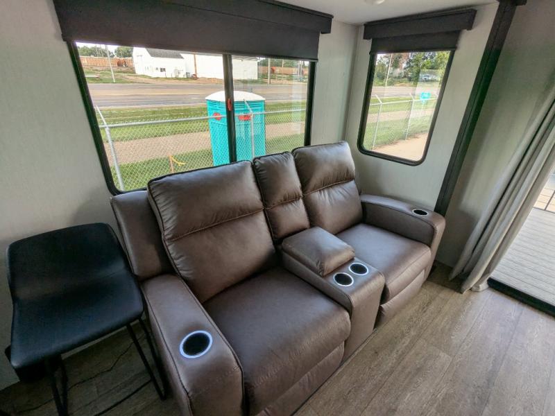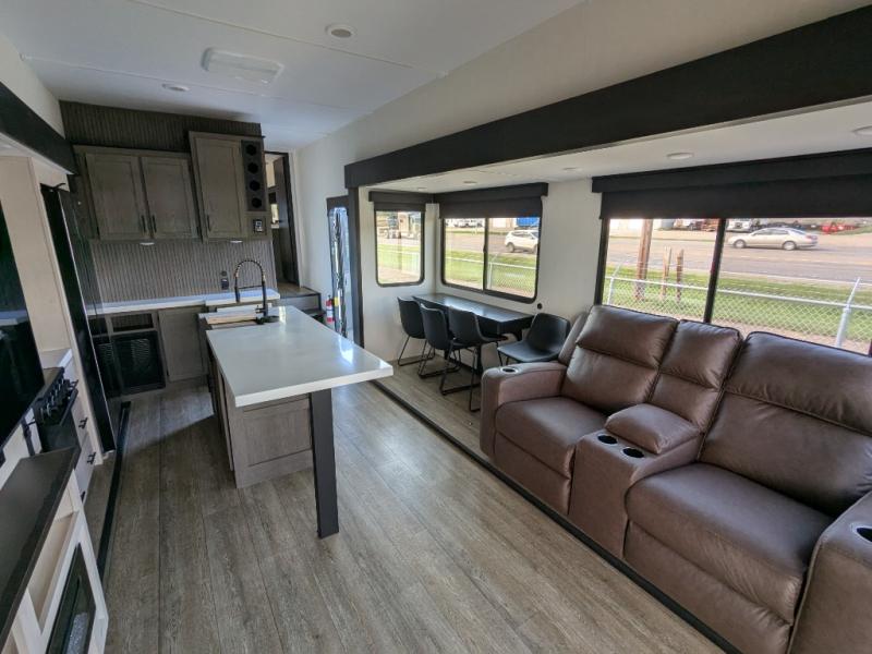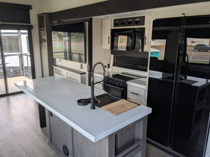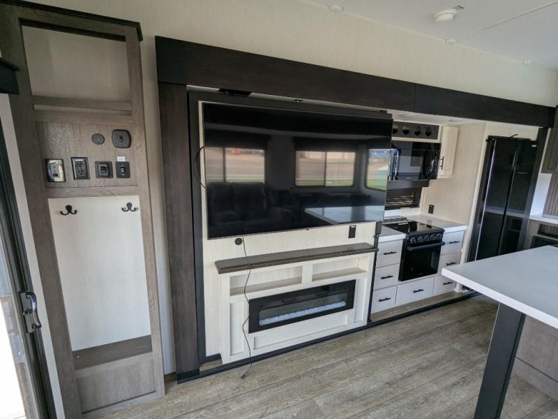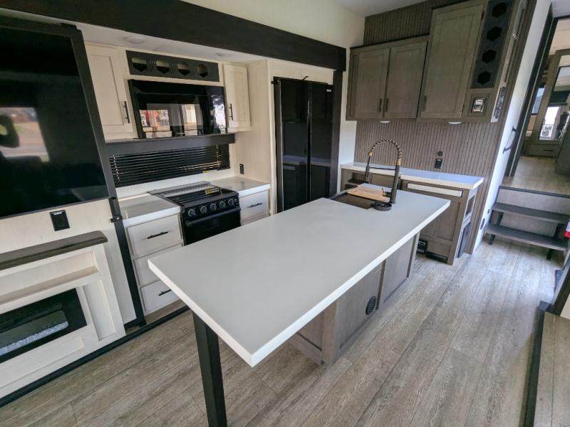 You're going to love camping in this triple slide out fifth wheel that is packed with amenities! The rear deck with a covered patio will provide a place to visit with campground neighbors, and inside, there is an L-shaped tri-fold sofa where guests can sleep. You'll find a king bed slide in the front master bedroom for you, along with a front bench seat, a bedroom fireplace, plus washer and dryer prep if you choose to add these appliances. The kitchen is any chef's dream with its large island with two chairs, pull-out countertop extension, spacious 16 cu. ft. refrigerator, plus a hidden pantry behind the TV for all the dry goods.