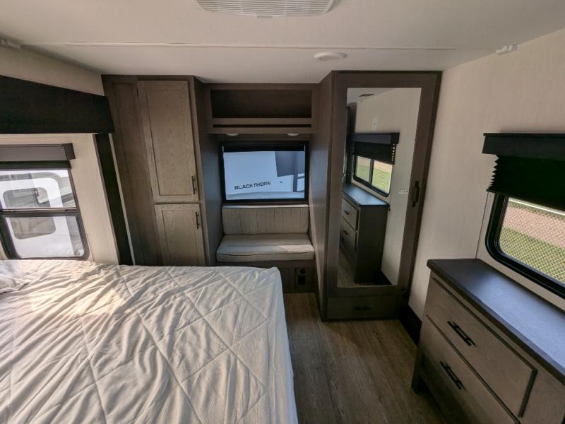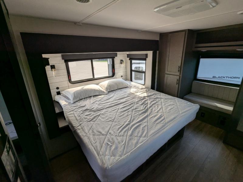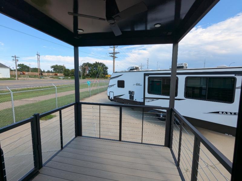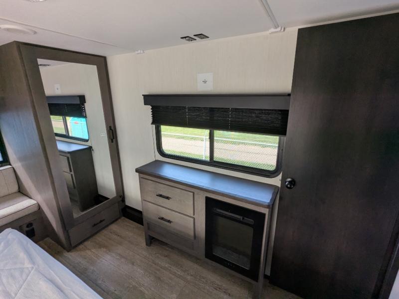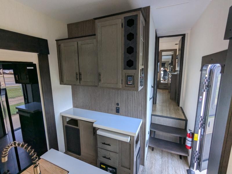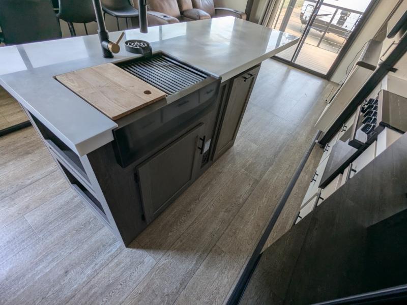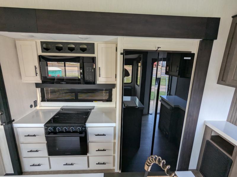 You're going to love camping in this triple slide out fifth wheel that is packed with amenities! The rear deck with a covered patio will provide a place to visit with campground neighbors, and inside, there is an L-shaped tri-fold sofa where guests can sleep. You'll find a king bed slide in the front master bedroom for you, along with a front bench seat, a bedroom fireplace, plus washer and dryer prep if you choose to add these appliances. The kitchen is any chef's dream with its large island with two chairs, pull-out countertop extension, spacious 16 cu. ft. refrigerator, plus a hidden pantry behind the TV for all the dry goods.