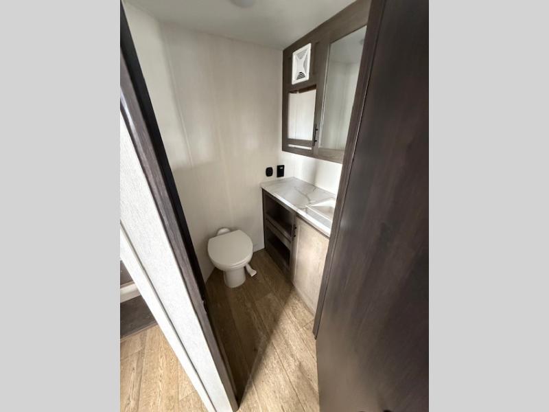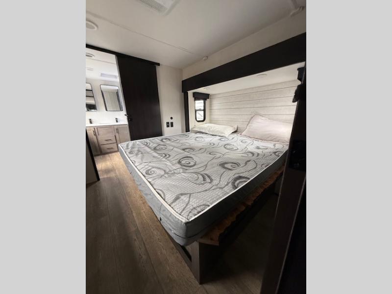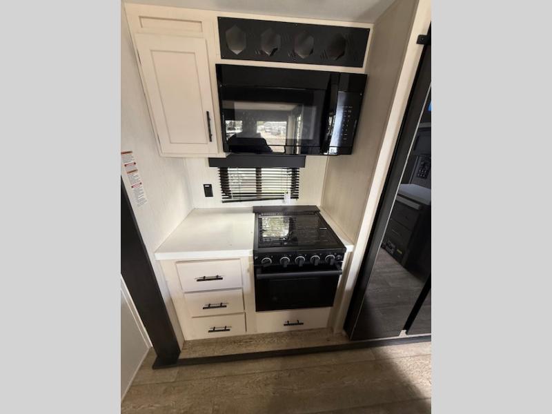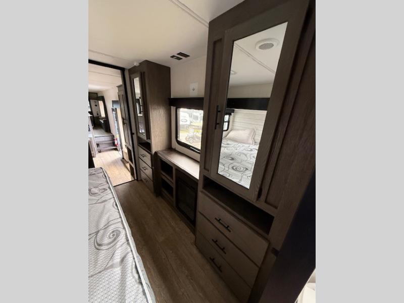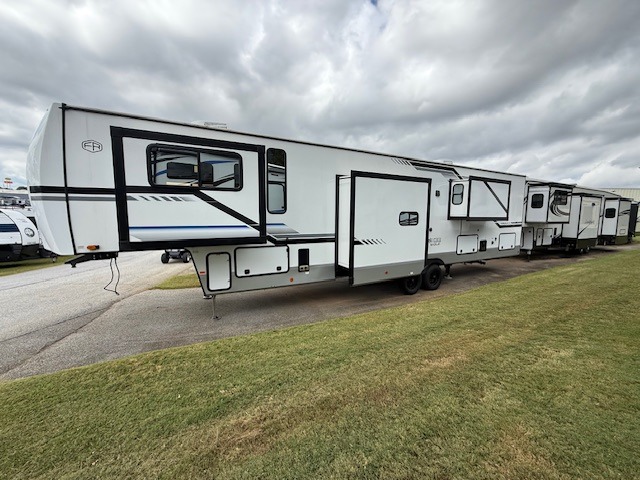Five slides, a bath and a half, plus sleeping space for six make this fifth wheel the perfect choice! Once you arrive at your destination, prepare lunch on the exterior kitchen. Inside, you'll find a kitchen island, plenty of storage space, plus a free-standing table with chairs and a storage ottoman seat. The front living area will be a favorite place to hang out and this room can double as a bedroom with the two tri-fold sofas. There is also theater seating across from the entertainment center and fireplace, plus storage cabinets for movies or board games. When you're ready to call it a night, head to the master bedroom for a great night's rest on the king bed slide out. You will also love the full rear bath with dual sinks, a spacious shower, plus a closet with stackable washer and dryer prep!