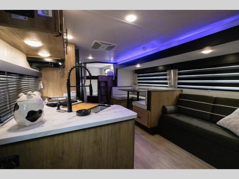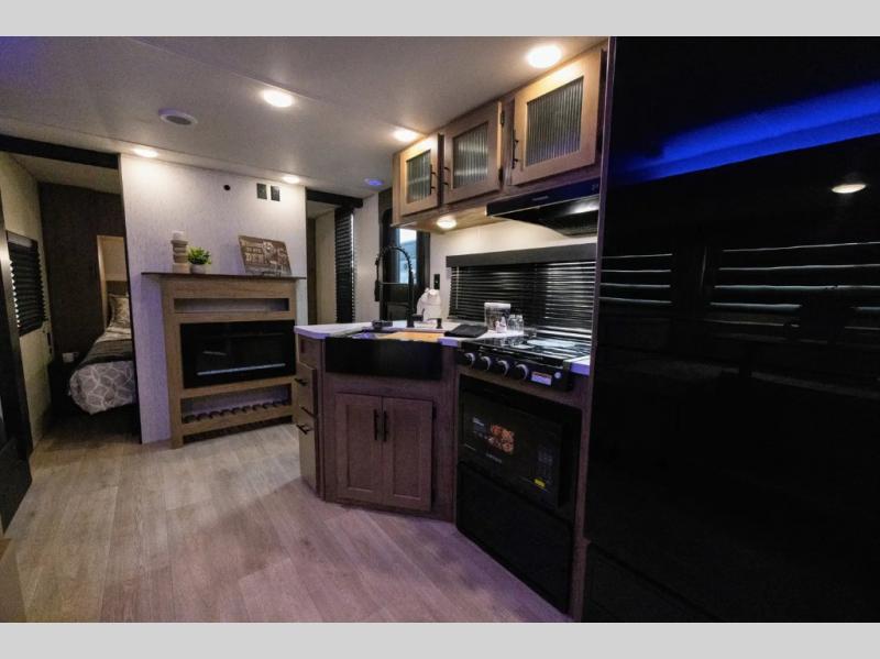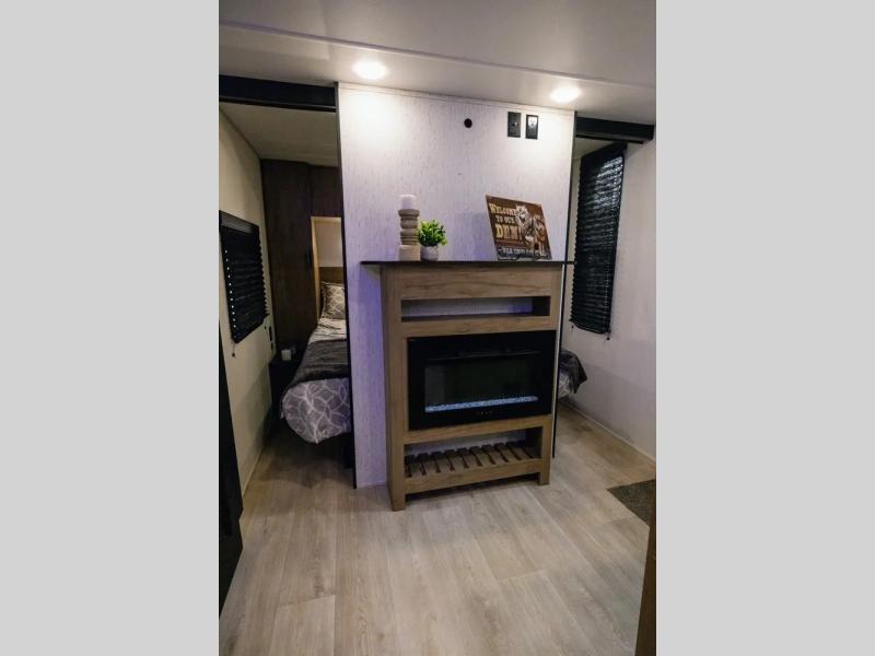 Come on inside this Cherokee Grey Wolf travel trailer and experience the convenience of a smooth flow of traffic in and out with two entry doors. The rear door leads into a full bath which is great for accessibility. Once inside, you will notice the large U-shaped dinette and the sofa which sit on the slide and create a spacious footprint for moving about, as well as great places to play games and socialize with your friends and family. A walk-in pantry provides plenty of storage allowing you to stock up on your favorite snacks and dry goods for your family adventure. At night, there is sleeping space for everyone between the double-size bunks and the RV king bed, plus the furniture.