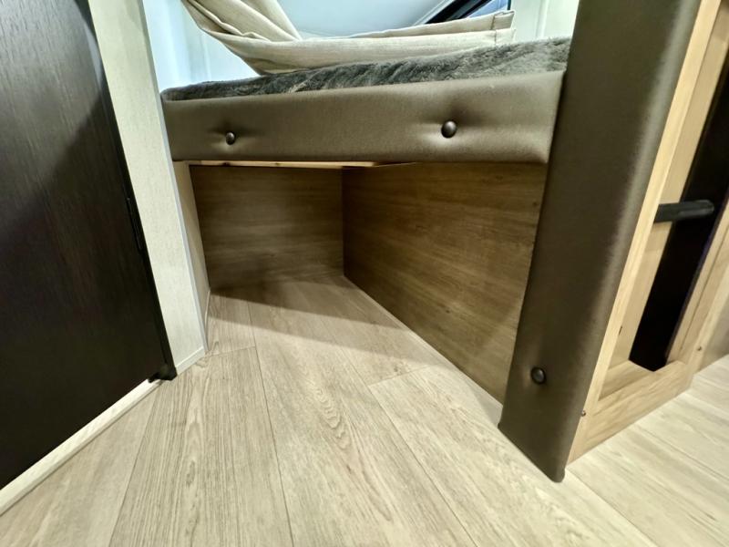 Come on inside this Cherokee Grey Wolf travel trailer and experience the convenience of a smooth flow of traffic in and out with two entry doors. The rear door leads into a full bath which is great for accessibility. Once inside, you will notice the large U-shaped dinette and the sofa which sit on the slide and create a spacious footprint for moving about, as well as great places to play games and socialize with your friends and family. A walk-in pantry provides plenty of storage allowing you to stock up on your favorite snacks and dry goods for your family adventure. At night, there is sleeping space for everyone between the double-size bunks and the RV king bed, plus the furniture.