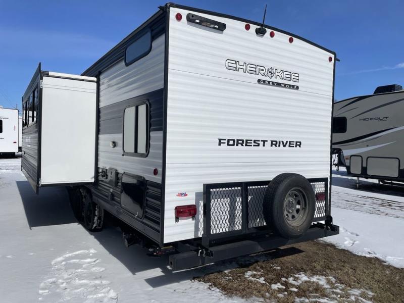 Whether it's a journey that will take you to new locations or a tried-and-true getaway to that favorite and memorable destination, the Forest River Cherokee Grey Wolf travel trailers and toy haulers are going to make the trip worth it every single time! You can travel in confidence with the premium wheel package, seamless roofing membrane with heat reflectivity, Power Gear frame technology with space-saver rail design, and Cherokee back-up camera system. The Cherokee Grey Wolf's interior is highly attractive with its stainless steel kitchen suite package and premium bedding ensemble and comforter. You will also find a black waste tank flush-out kit, an outside shower with hot and cold water, an armored underbelly tank enclosure, and an RV grill quick connect.
