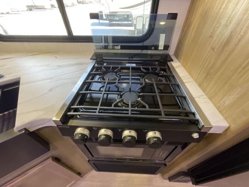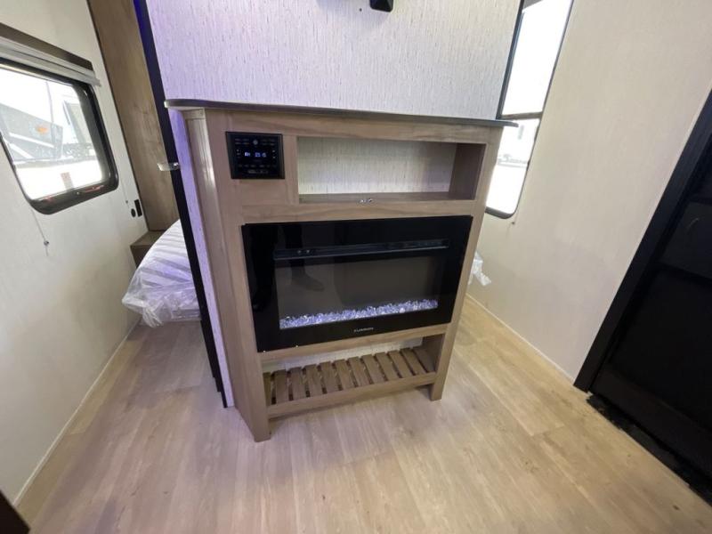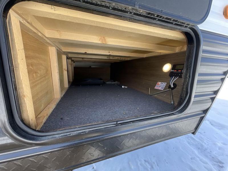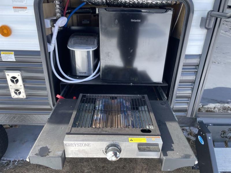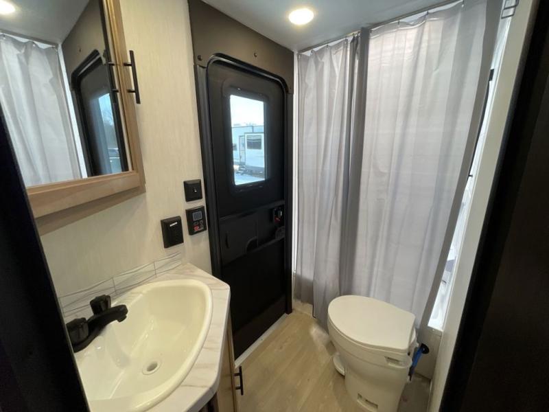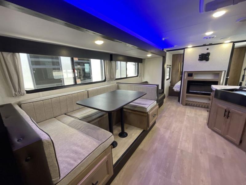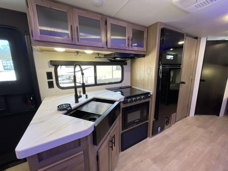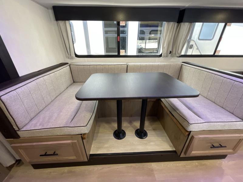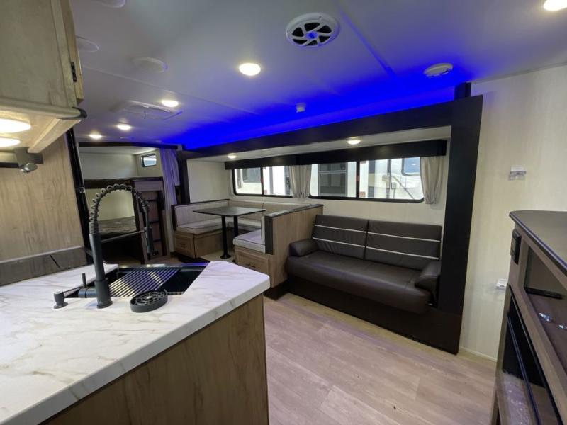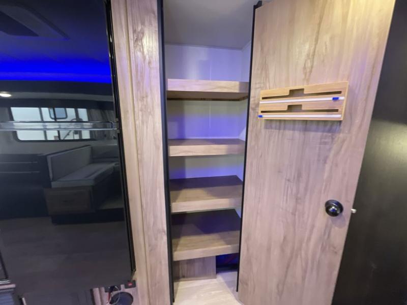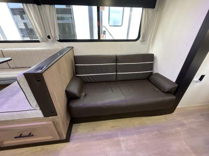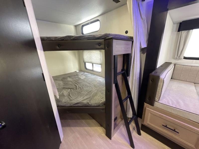 Come on inside this Cherokee Grey Wolf travel trailer and experience the convenience of a smooth flow of traffic in and out with two entry doors. The rear door leads into a full bath which is great for accessibility. Once inside, you will notice the large U-shaped dinette and the sofa which sit on the slide and create a spacious footprint for moving about, as well as great places to play games and socialize with your friends and family. A walk-in pantry provides plenty of storage allowing you to stock up on your favorite snacks and dry goods for your family adventure. At night, there is sleeping space for everyone between the double-size bunks and the RV king bed, plus the furniture.