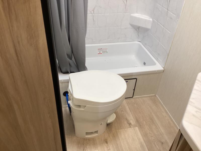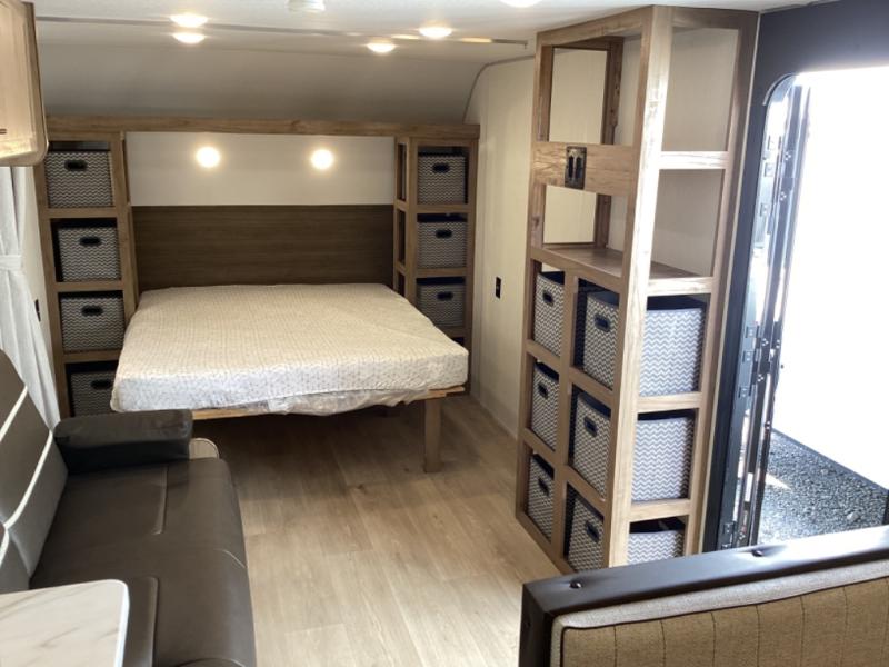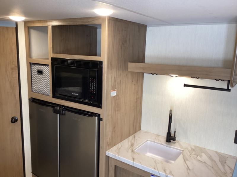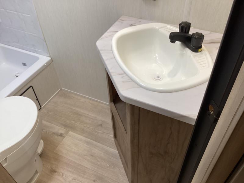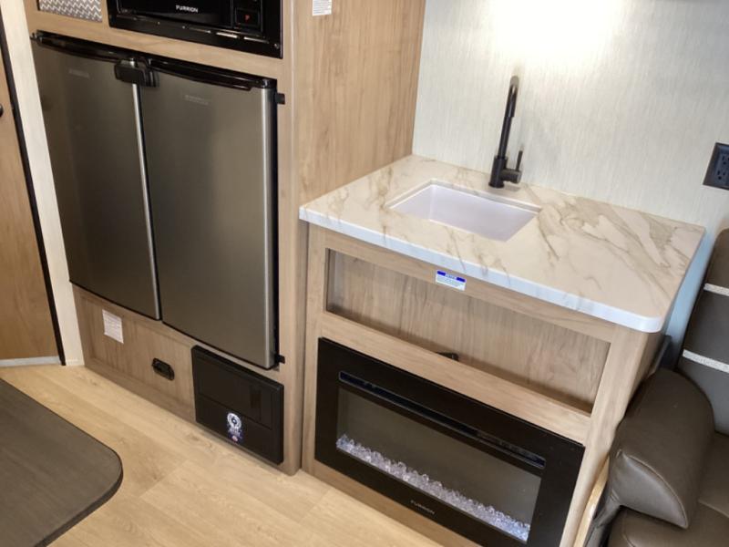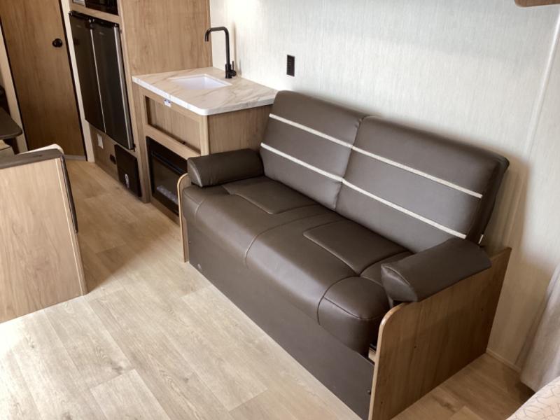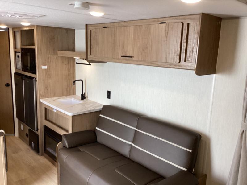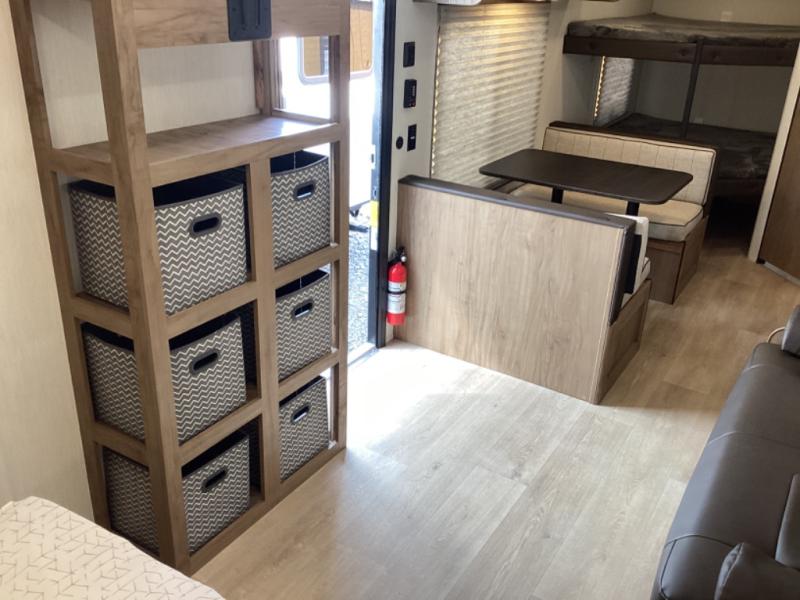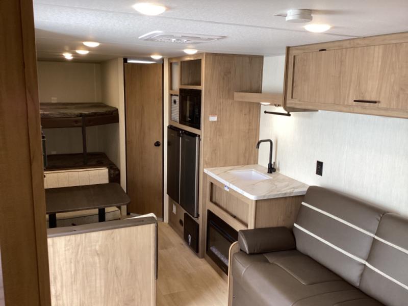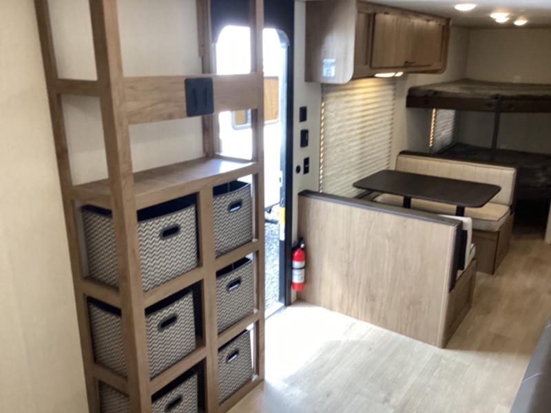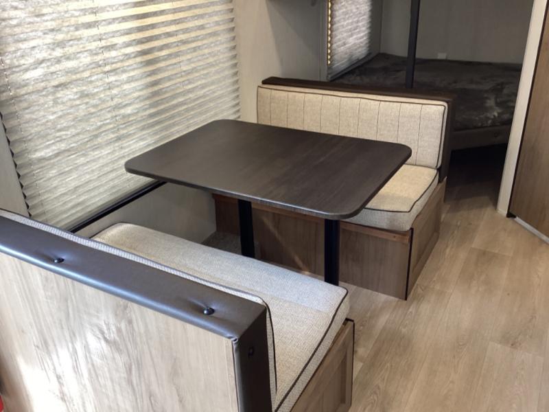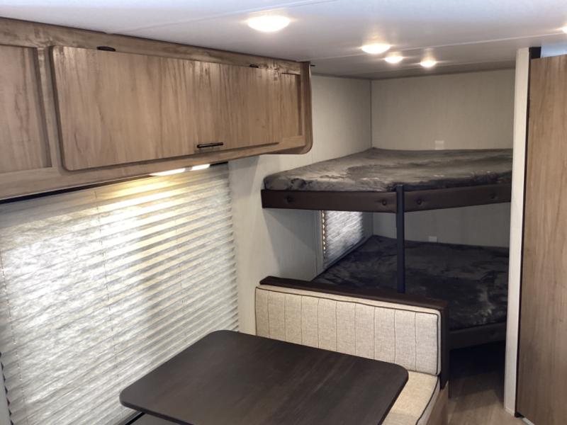 Enjoy family adventures in this bunk model which features sleeping for eight to ten depending on size with a queen bed up front, double-size bunks in the rear curbside corner, and you could even convert the booth dinette and sofa to sleep more. Inside, you will find ample storage with overhead cabinets and a large shelf above the queen bed, plus more shelves next to the entry door, as well as a pantry and storage on either side of the bed. You will appreciate the full bath with tub/shower, toilet, and sink so you can skip the campground facilities. On the outside, you will also find a 12' awning for added outdoor living, and outside storage for your camping gear, plus more!