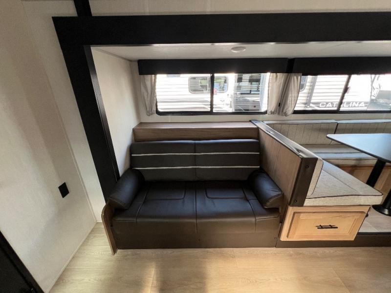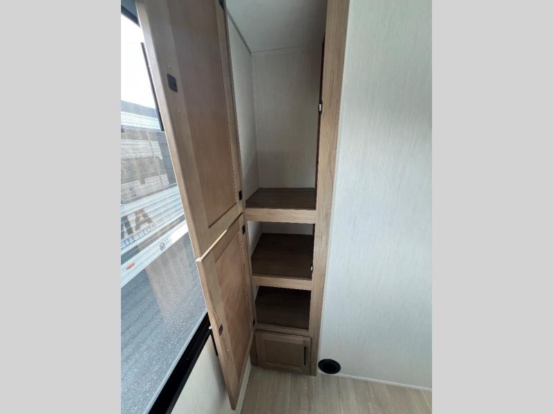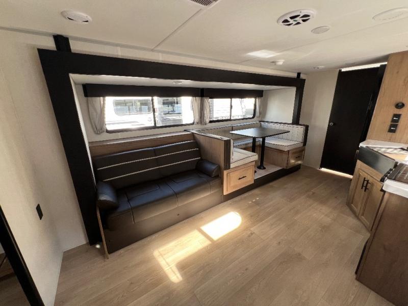You and your spouse will have a fun time camping in this travel trailer! You will find all of the comforts you need with plenty of livable space including a U-shaped dinette slide. There is also a sofa for more seating when company arrives with a shelf above for your books. The spacious full rear bathroom has a shower with a skylight for more head room and natural lighting. You will find ample storage for clothing in the wardrobes that are above handy nightstands for your personal things on either side of the RV king bed in the front private bedroom. There is even an outside kitchen protected by the 15' awning!