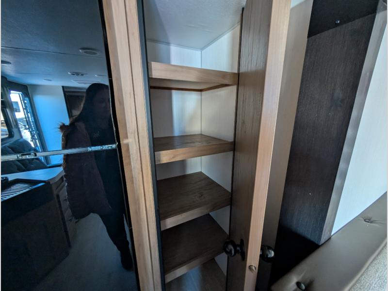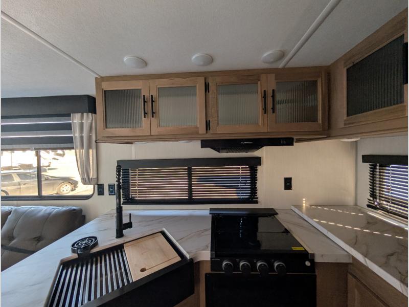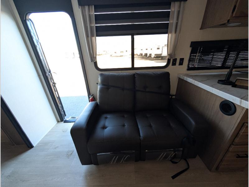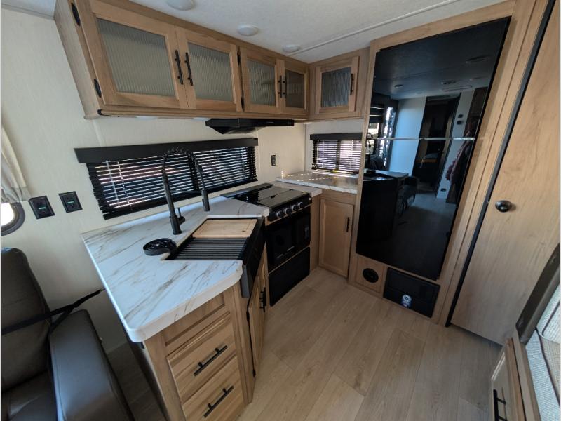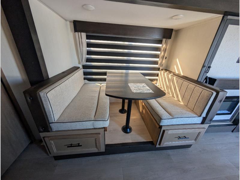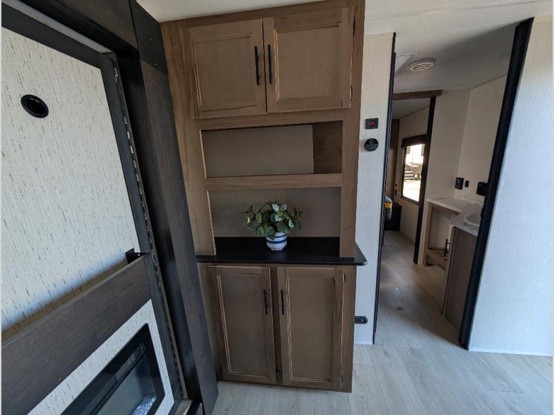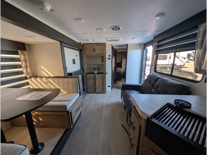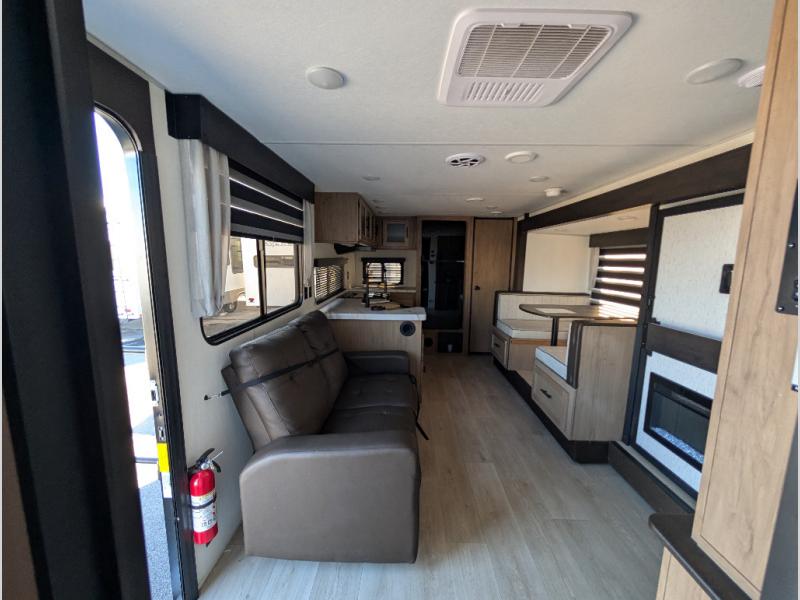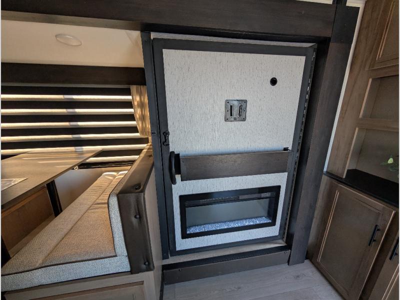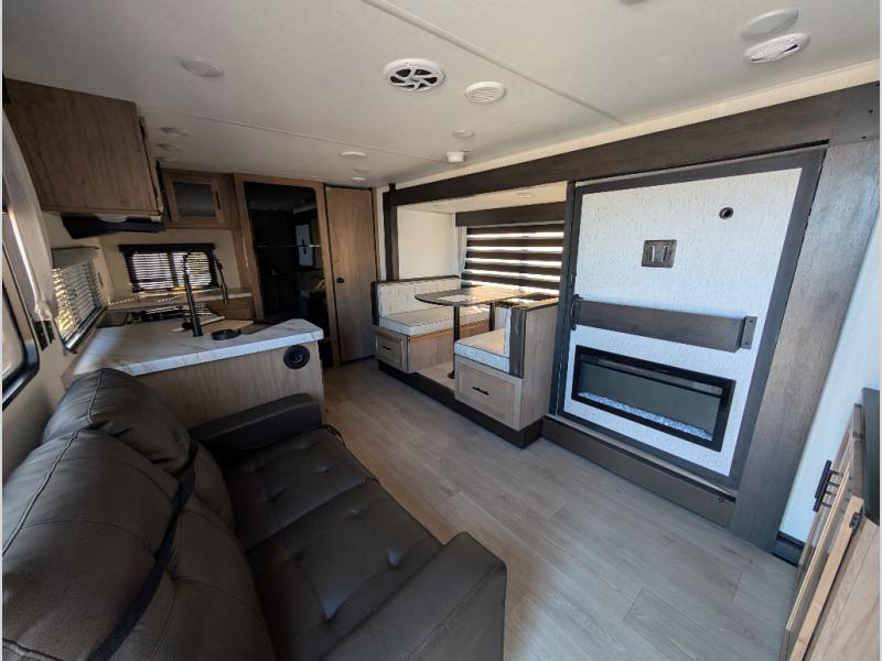You'll love every minute spent in this single slide out travel trailer, whether you're cooking dinner on the outside kitchen or in the rear kitchen, relaxing on the sofa across from the fireplace, or sleeping on the RV king bed in the front master bedroom! There are hidden shelves behind the fireplace for convenient storage, and the booth dinette within the slide provides a place to dine together. The walk-thru bath is spacious, and includes a tub/shower, toilet, and sink with counter space.