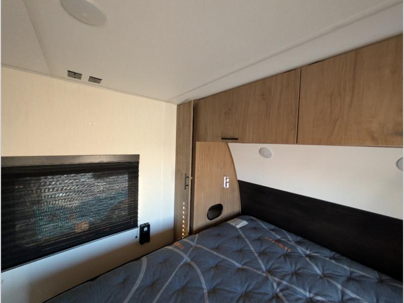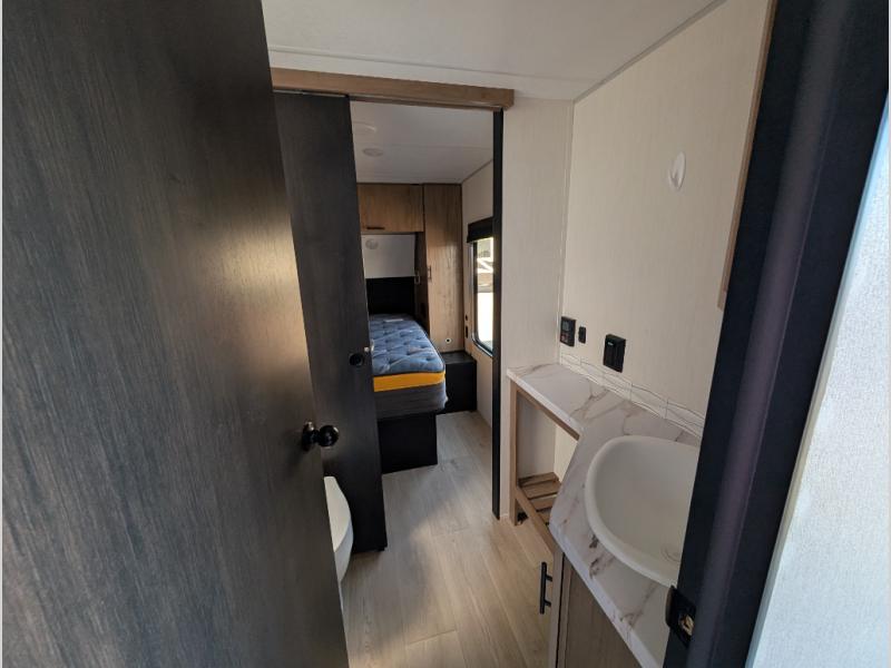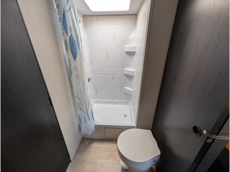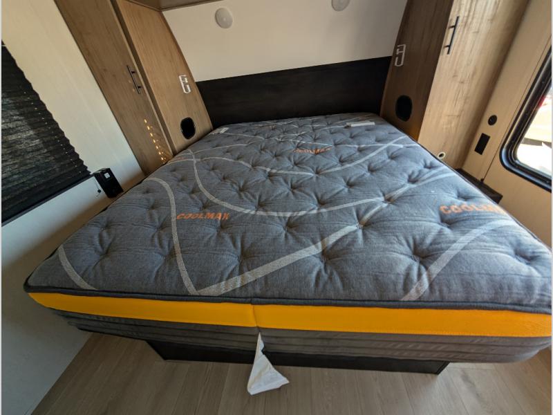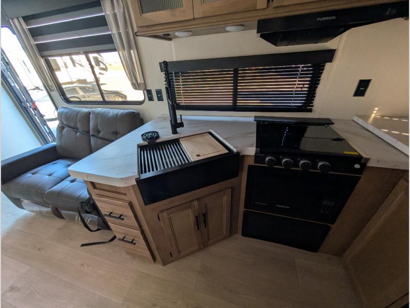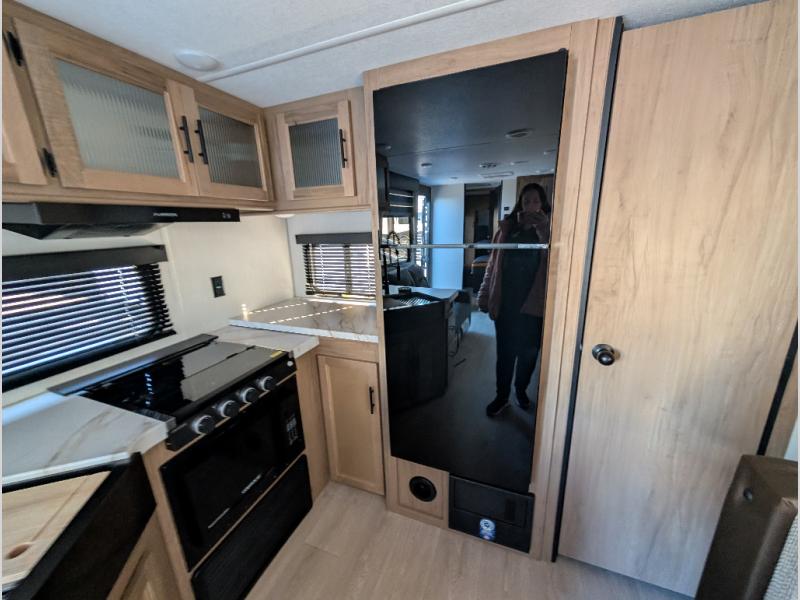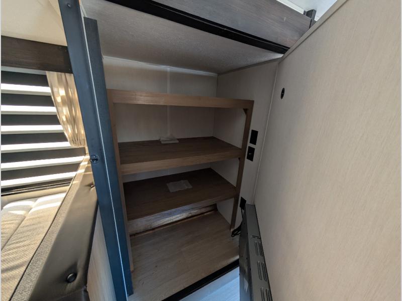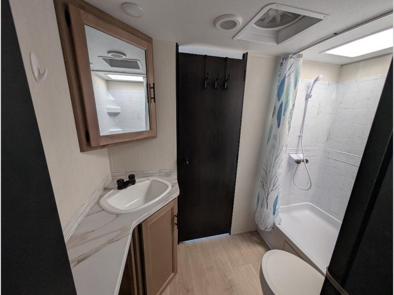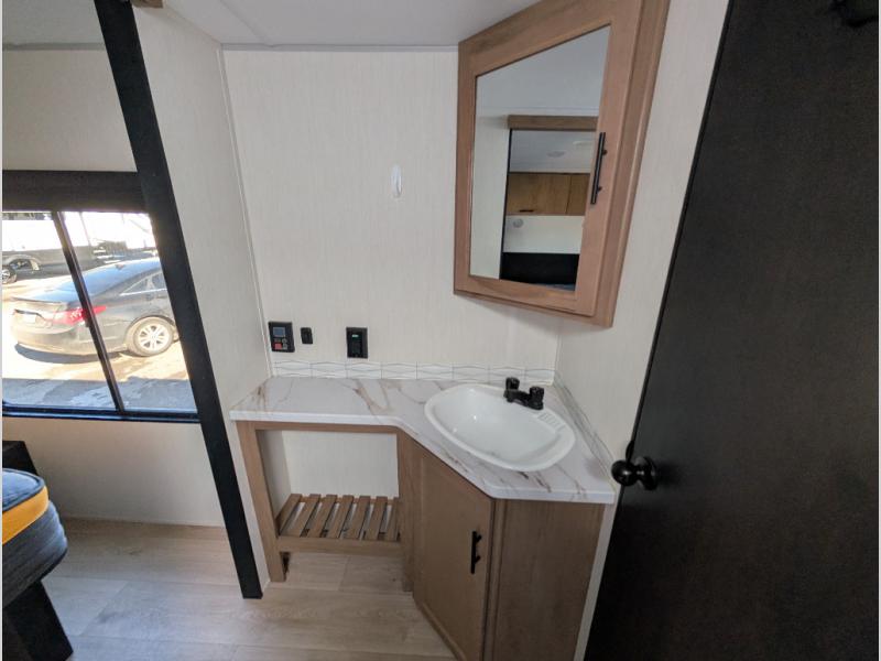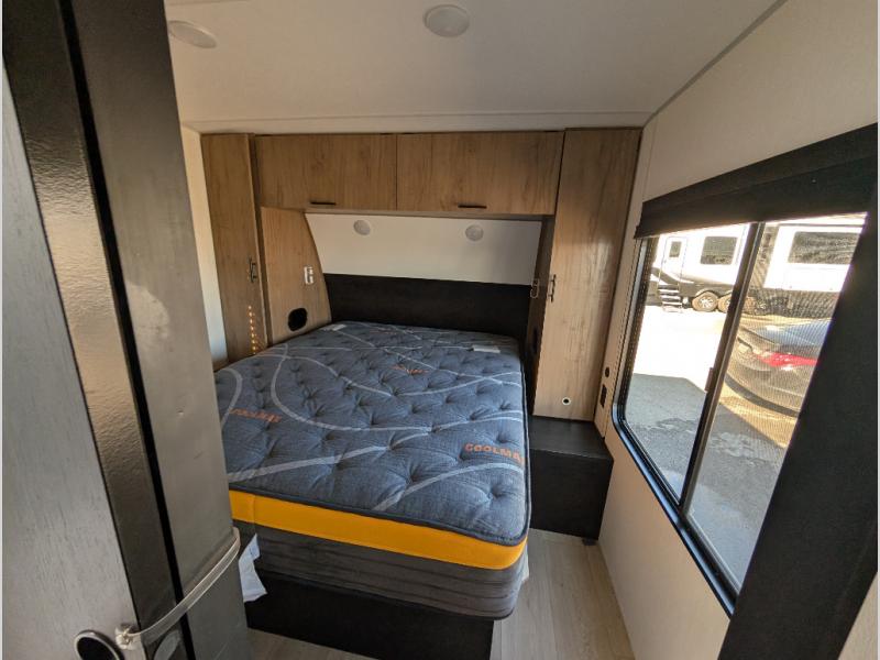 You'll love every minute spent in this single slide out travel trailer, whether you're cooking dinner on the outside kitchen or in the rear kitchen, relaxing on the sofa across from the fireplace, or sleeping on the RV king bed in the front master bedroom! There are hidden shelves behind the fireplace for convenient storage, and the booth dinette within the slide provides a place to dine together. The walk-thru bath is spacious, and includes a tub/shower, toilet, and sink with counter space.