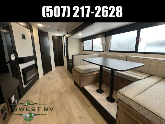 Since this travel trailer features dual entry doors, you can enter in through the rear master bedroom or the front kitchen; how convenient! The kitchen includes ample counter space and all the appliances to prep meals, along with a pantry up front and a hidden pantry behind the fireplace. Your crew can get comfortable on the sofa or play a game at the booth dinette, although you may just find yourselves outdoors since there is an outside kitchen and a power awning with LED lights. The dual entry bath will let you enter in through the main living area, plus it has a private entrance into the bedroom. Here, you'll find an RV king bed, dual wardrobes for your things, and USB ports to keep your electronics charged!