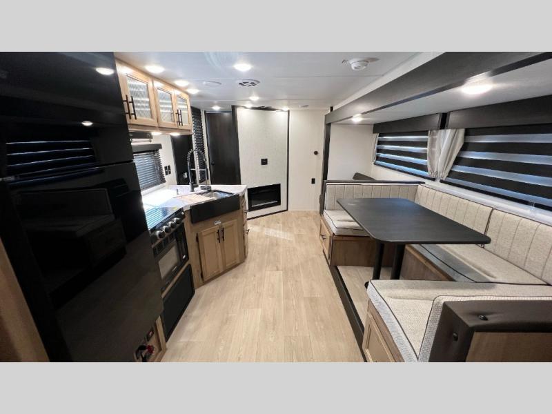 You will love how easy it is to enter/exit this travel trailer with dual entry doors! The rear door leads into the living/kitchen area where you will notice the large U-shaped dinette and the sofa which sit on the slide and create a spacious footprint for moving about, as well as great places to play games and socialize with your friends and family. Plus, there is an entertainment center with a fireplace and a fully equipped kitchen to keep everyone's bellies filled with delicious home cooked meals. At night, there is sleeping space for everyone between the bunks above the sofas with a table in the rear private bunkhouse and the RV king bed in the front private bedroom, plus the furniture can convert into sleeping spaces. The walk-through bathroom leads directly into the bedroom too!