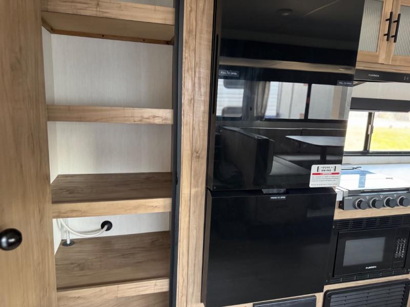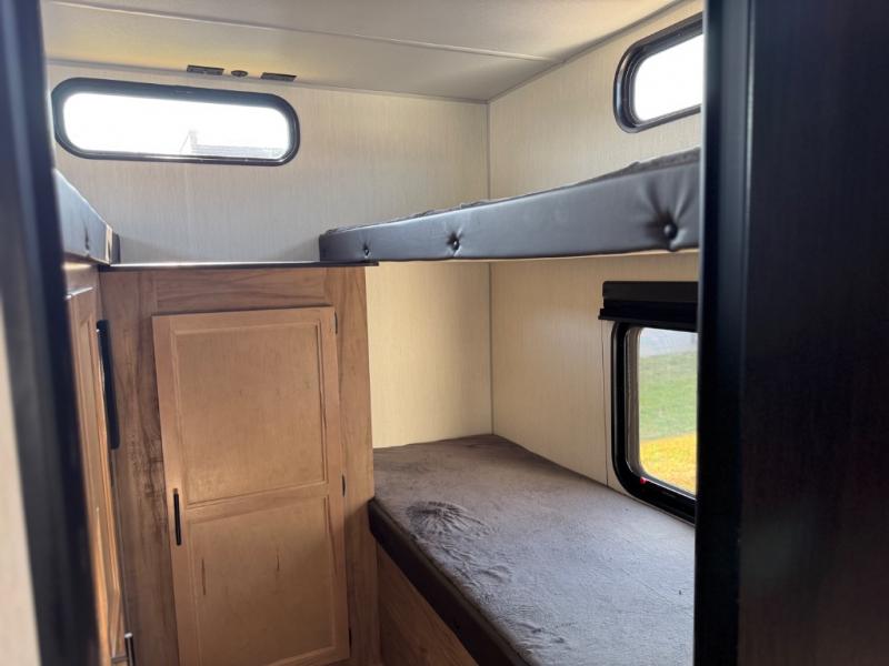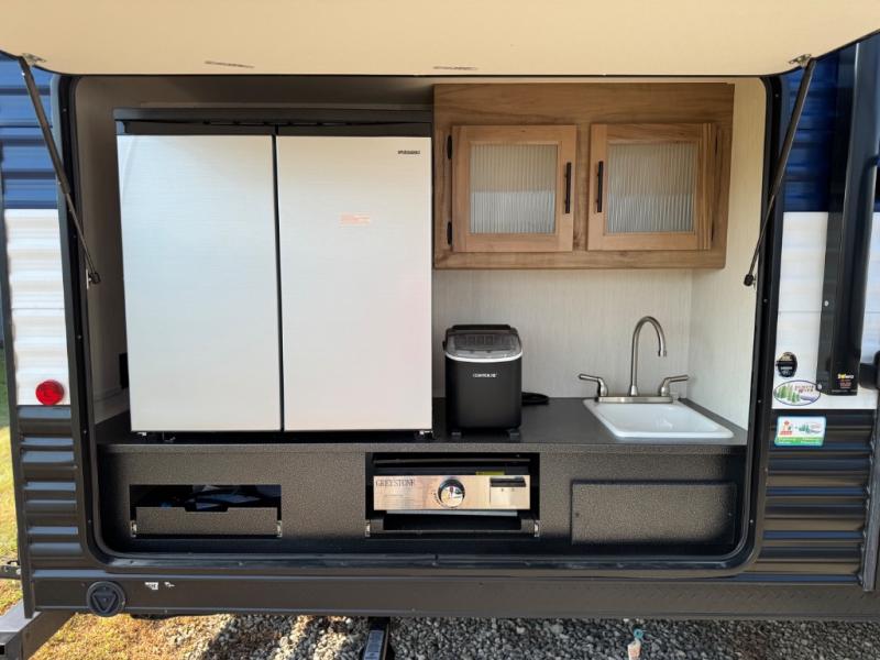 Your larger family will love spending weekends away with this Cherokee Grey Wolf travel trailer as their home away from home. This model offers lots of sleeping space with three bunk beds in the rear private bunkhouse. In the front, there is a master suite with wardrobes and nightstands on either side of the RV king bed, and it even has private access to the dual-entry bath. The two entry doors will make accessing the trailer easy for everyone, and you will appreciate the abundant storage throughout this unit including large overhead cabinets, a spacious pantry, and numerous outside storage compartments for all of your outdoor gear. There's even an outside bar & grill!