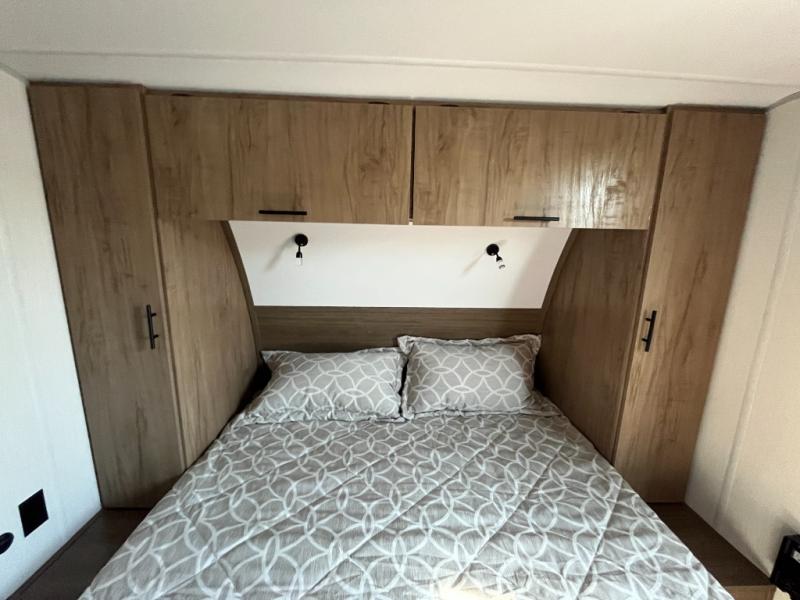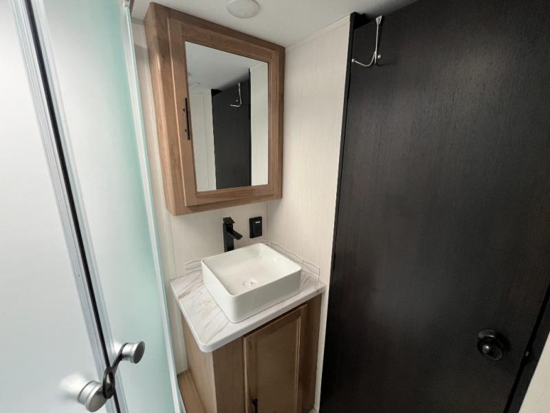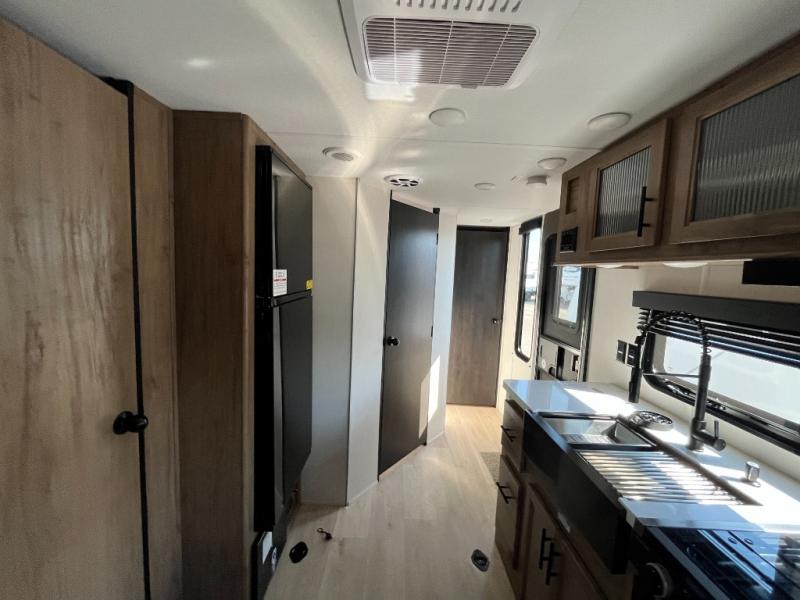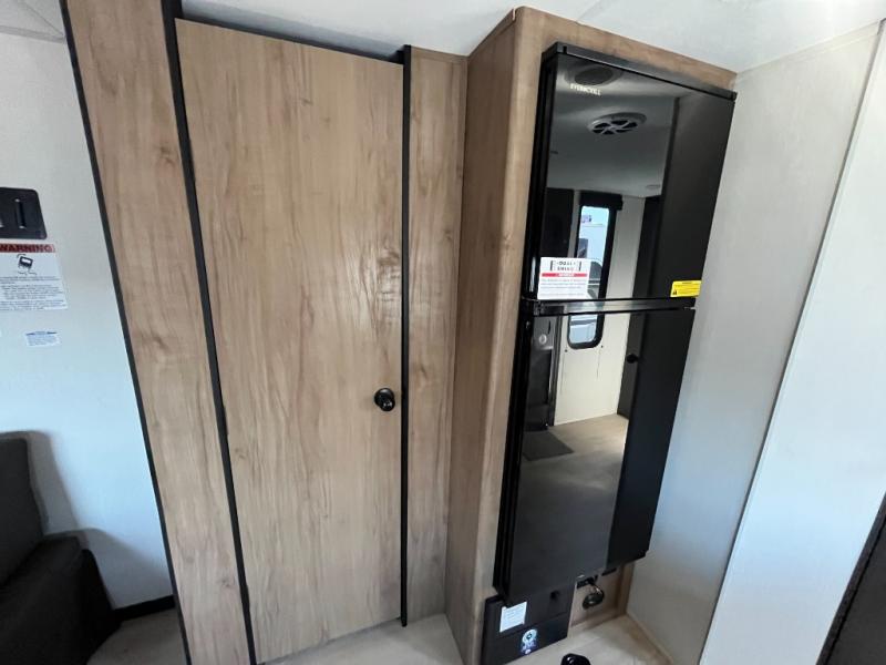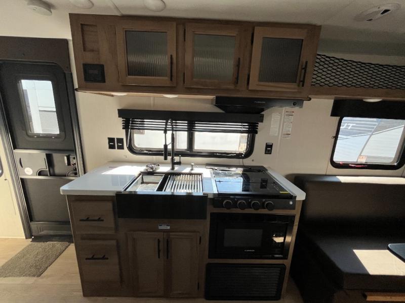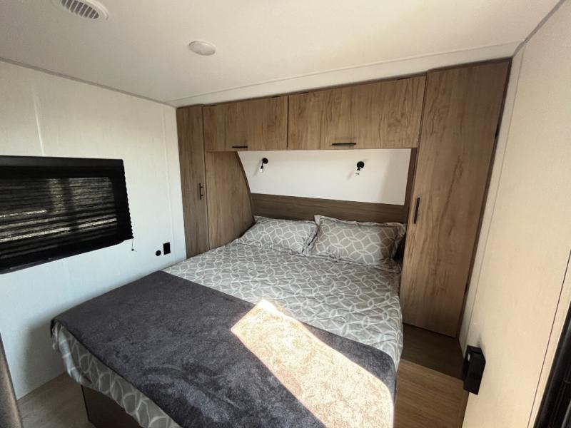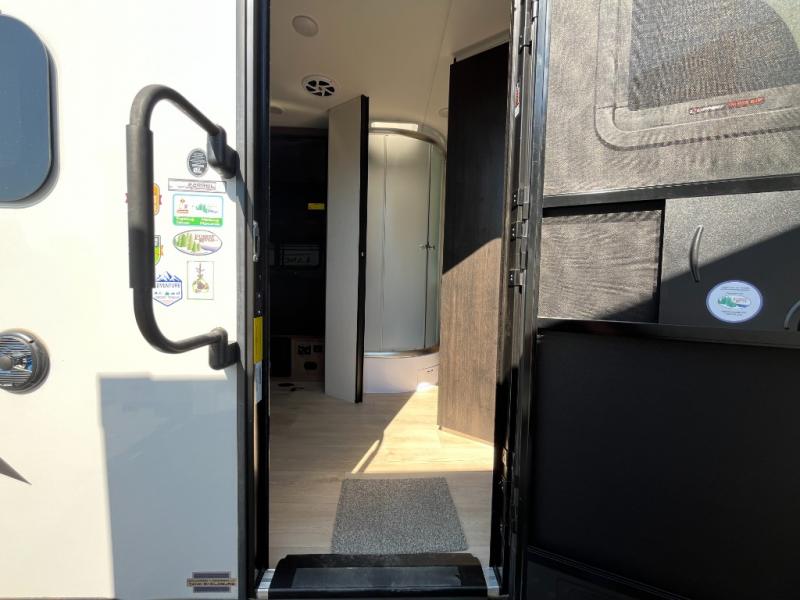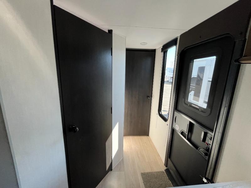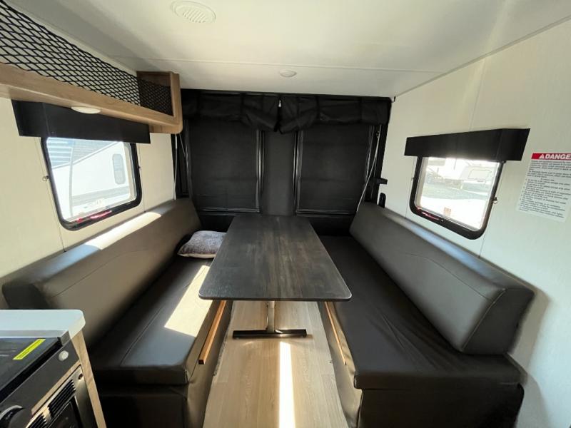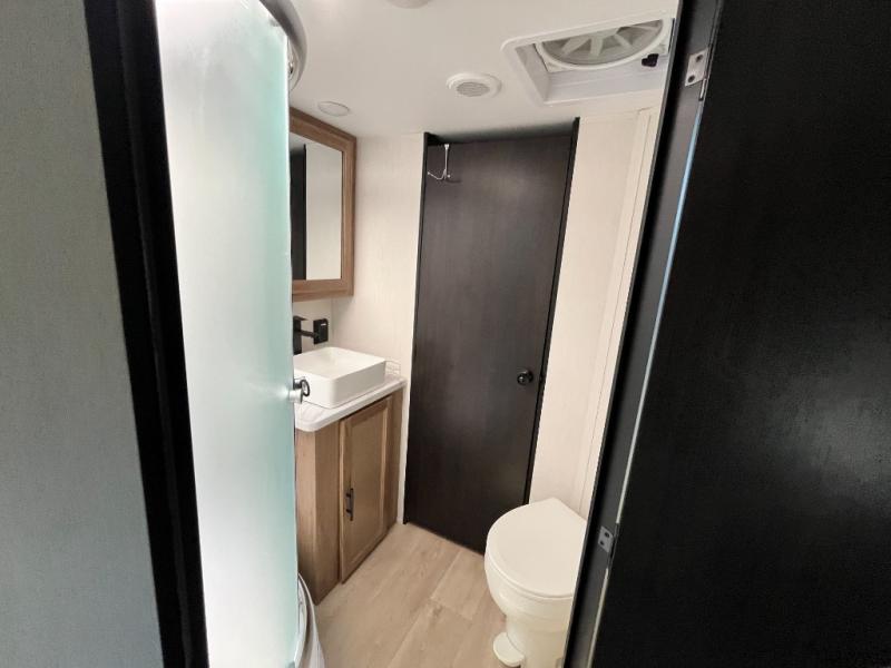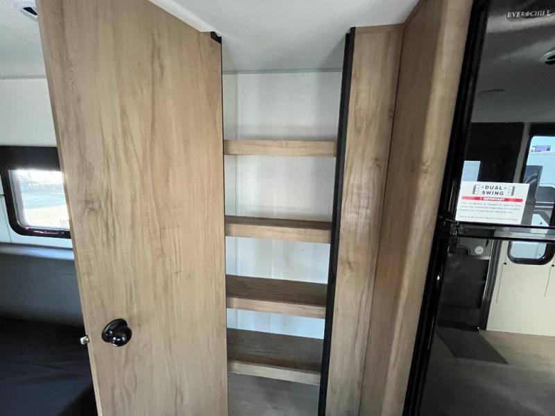 You will love this Cherokee Grey Wolf Black Label toy hauler with a rear ramp door for loading and unloading your toys and gear. If you position the fold-down sofas up against the wall, you will have even more room for extra gear when you are moving down the road. Set up camp and easily create a great dining area with the table between each fold-down sofa. You can also create your best meals in a breeze with the air fryer, and a large pantry allows you to pack all of the snacks and canned goods you need for your adventure. You will appreciate the master suite up front for a great night's rest on the RV king bed along with easy access into the dual-entry bath.