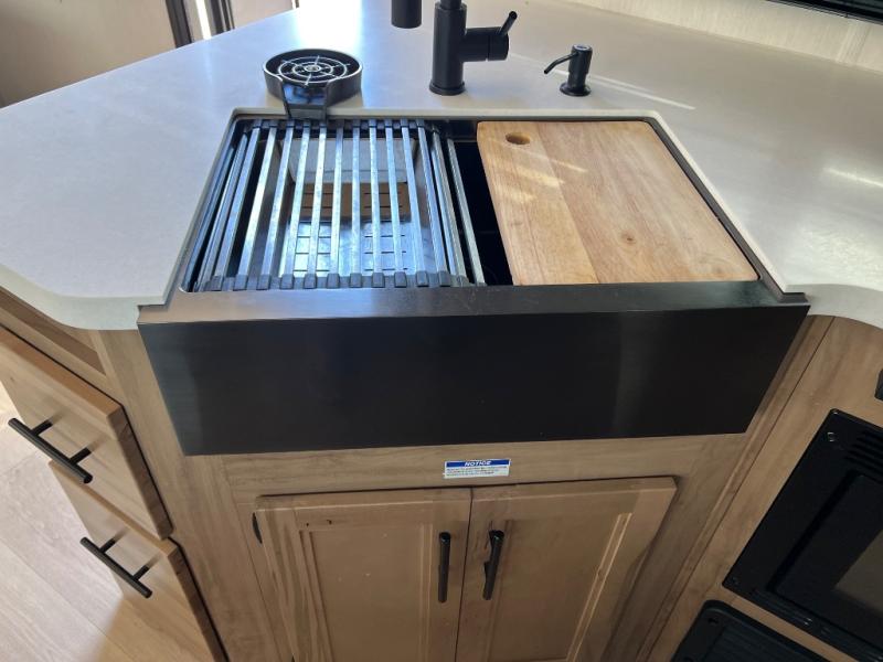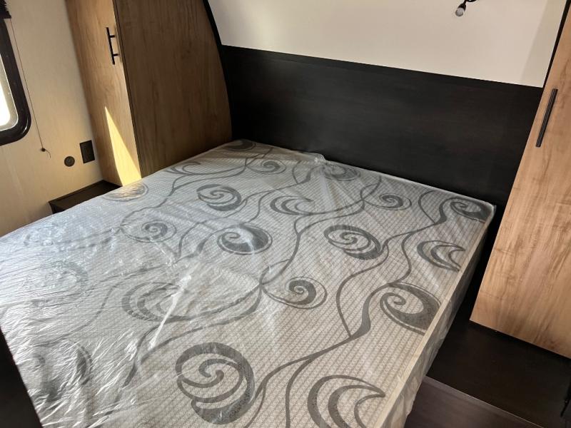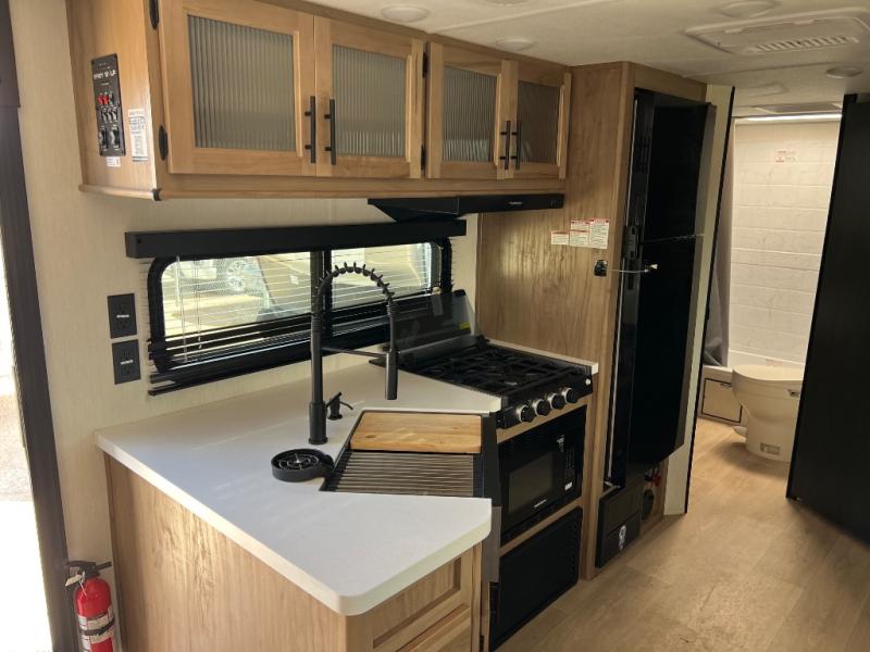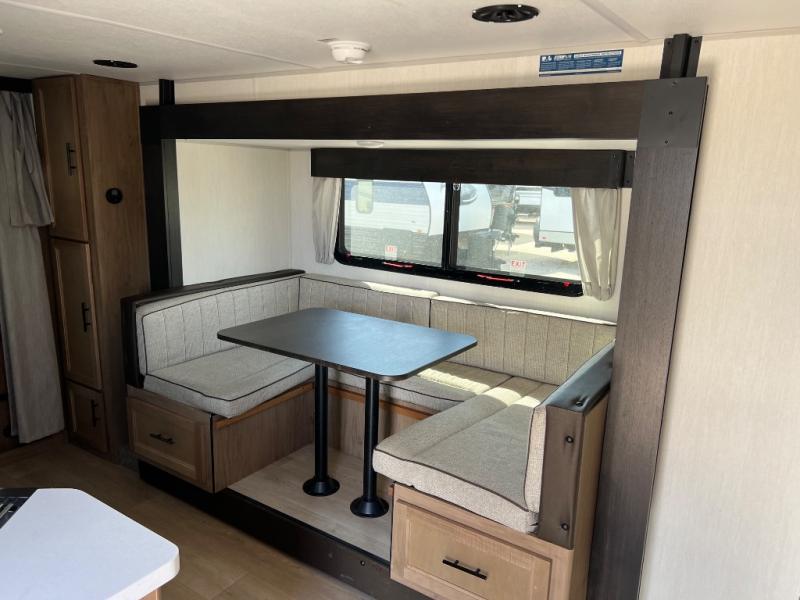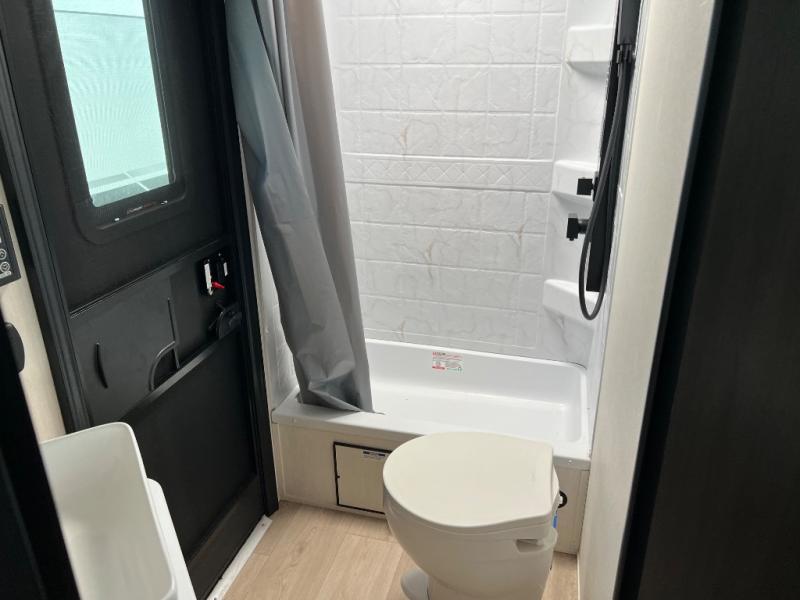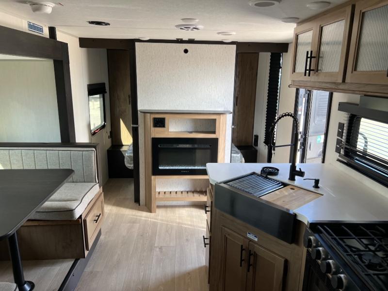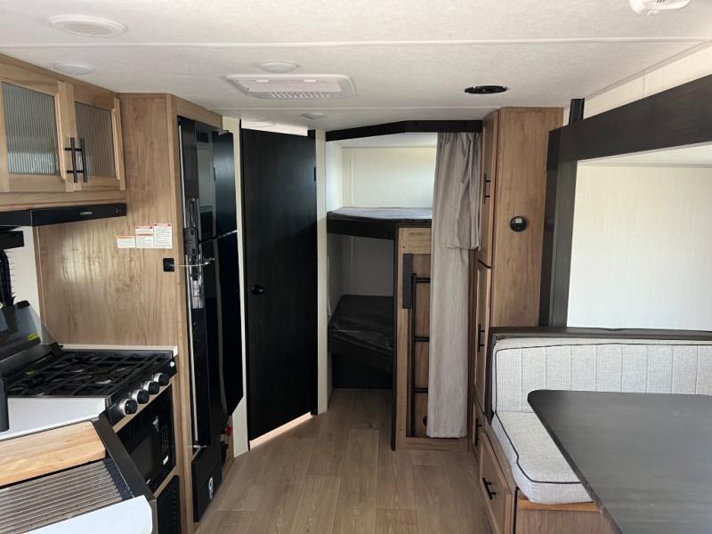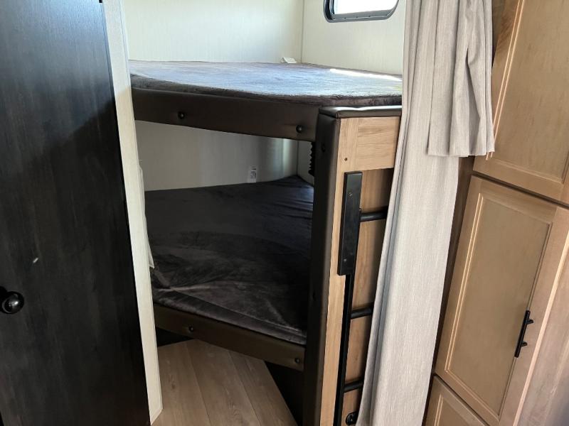 You will love the space provided in this dual entry Cherokee Grey Wolf Black Label travel trailer that has double-size bunks! The rear entry door leads right into the full bath allowing easy access from outside when you need to use the bathroom while you're enjoying the great outdoors. The large U-shaped dinette slide will not only seat everyone comfortably for a meal or a game, but since it also slides out, it opens up the interior even more to give you plenty of space for foot traffic. For all of your outdoor gear, you will find the outside storage compartments handy for stowing away your things when not in use. While the kids enjoy their bunk beds, you will enjoy a good night's rest on the RV king bed with wardrobes on either side up in the front private bedroom!