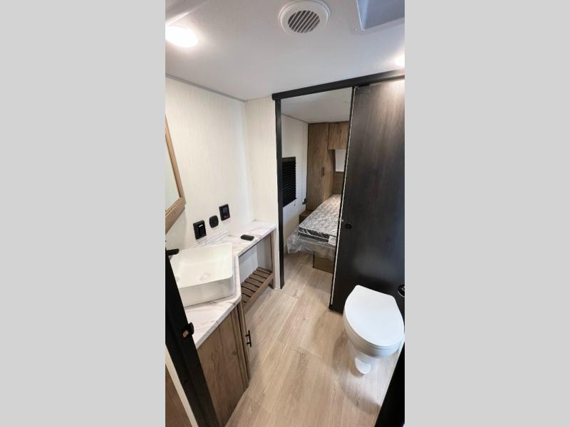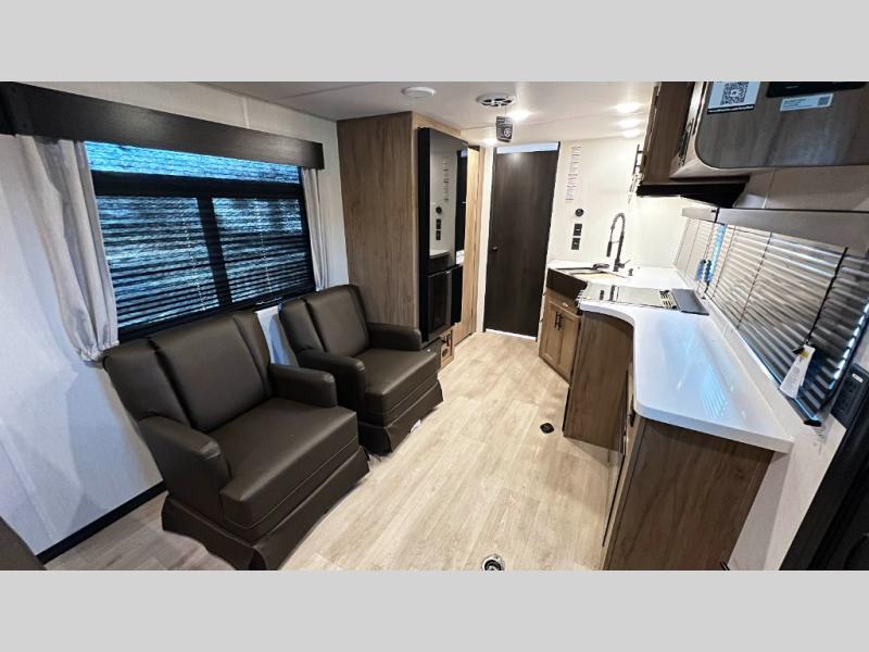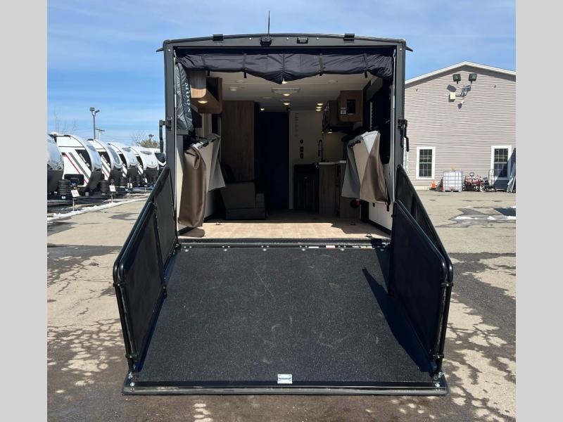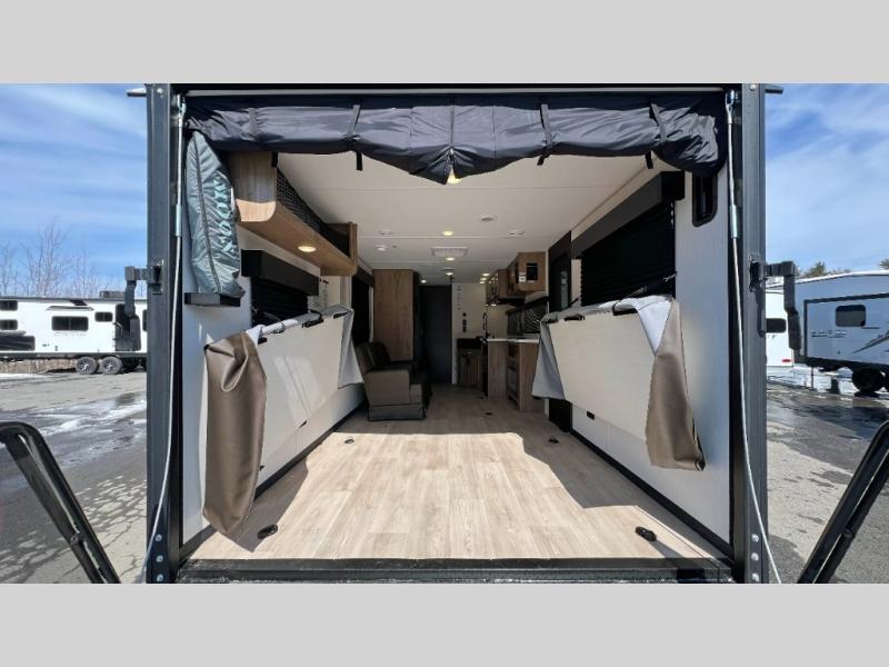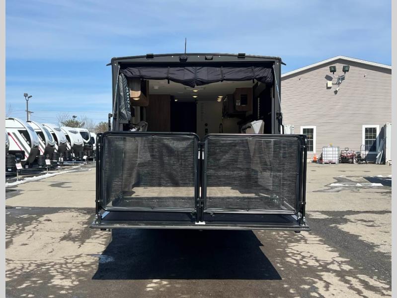 This dual entry toy hauler will allow you to enter in through the main living area or the front master bedroom for convenience! There is a walk-through bath that will be easily accessible for everyone, and there is plenty of storage space for personal belongings. Head to the full kitchen to prepare a home cooked meal, or head outdoors to enjoy the mini kitchen. There is also an outside TV mount if you brought a TV along, and a 15' power awning to provide shade. You can easily unload your toys using the ramp door, then relax on the fold-down sofas with a removable tale.