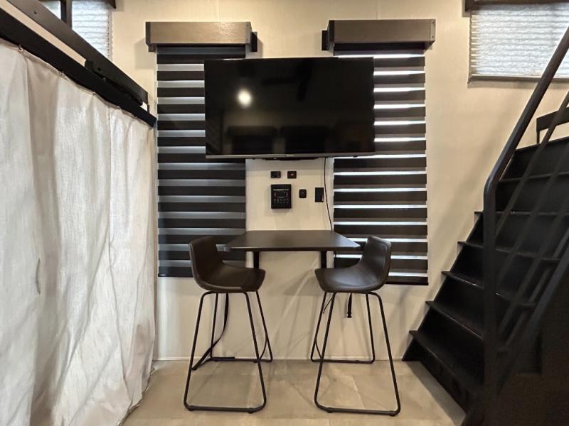 This model is similar to 16ML but larger! A bigger bathroom, king bed in the lower master, and a queen bed plus a twin bunk mat in the front loft. There is an 18 cu. ft. refrigerator so you can stock up for a week long vacation, a hide-a-bed sofa that can transform into added sleeping for guests, and a high top table with two stools to dine at. A ladder allows access into the upper front loft that is over the covered patio. The bathroom below is split with a shower on one side, and a private toilet area and sink opposite. And the view is amazing from just about anywhere inside.