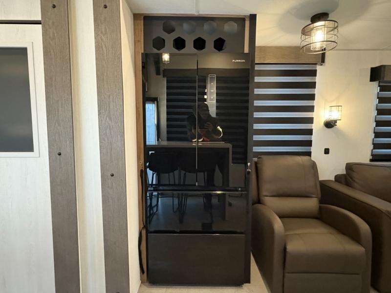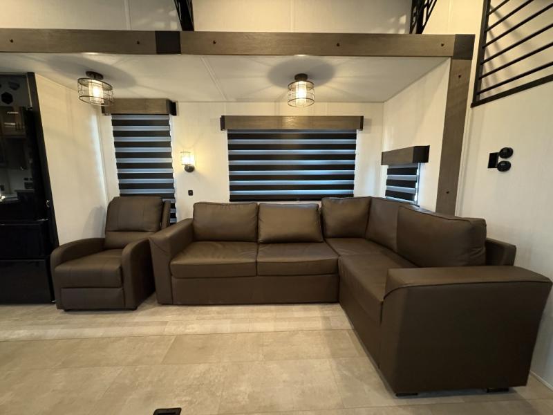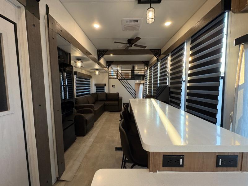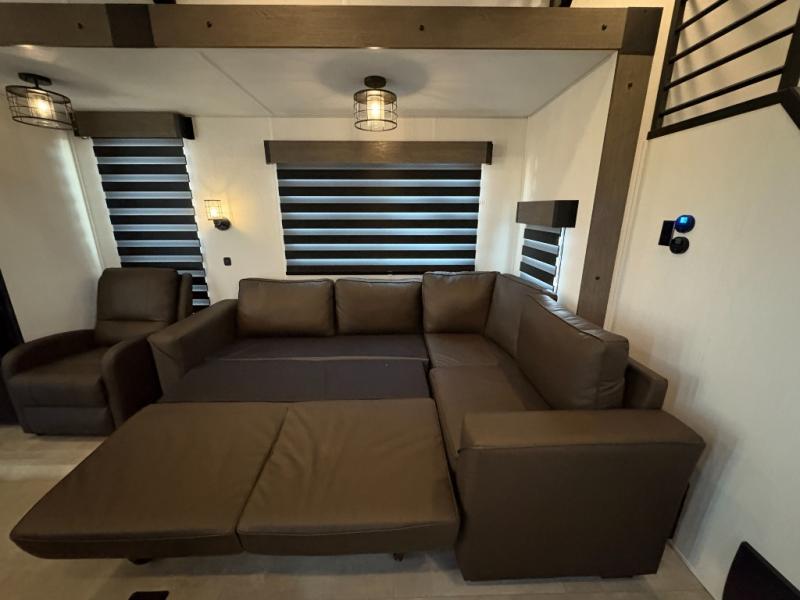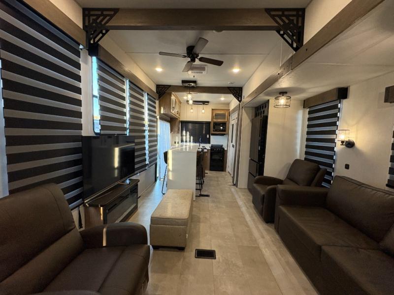 Time spent in this destination trailer will be time well spent! You will appreciate dual entry doors for maximum convenience, plus a spacious full bath that is close by the front private bedroom! Your crew can relax in the middle living area on the L-shaped sofa, and there are two lounge chairs for even more seating spaces. The rear kitchen will be any chef's dream with its island with six stools and all the appliances to create meals each day. This model also features triple slides so you can enjoy more space to relax!