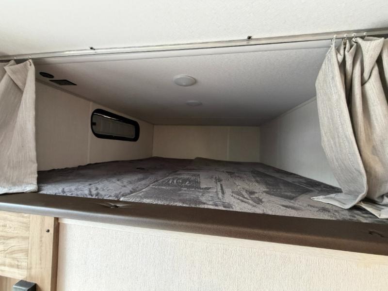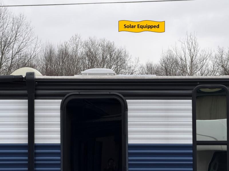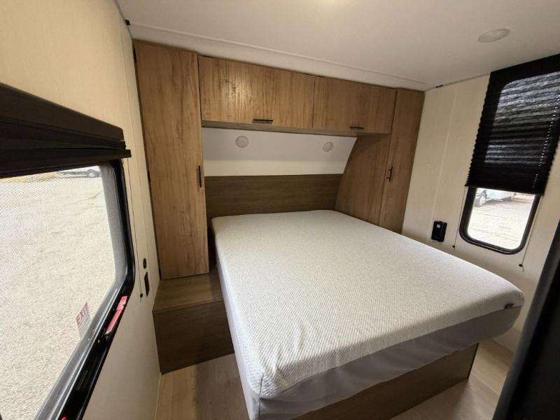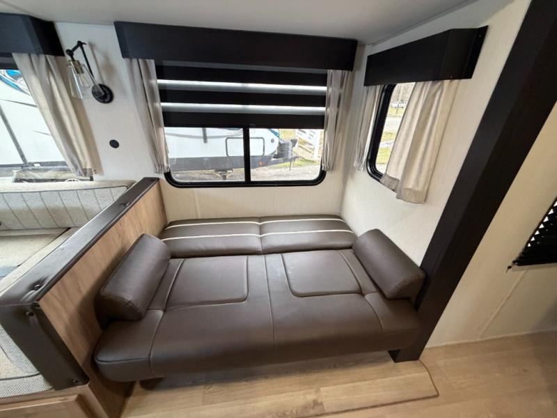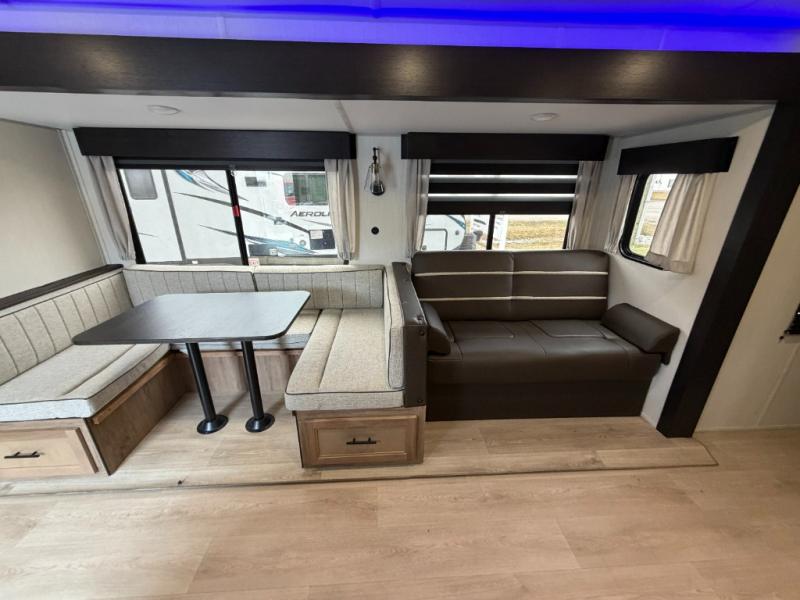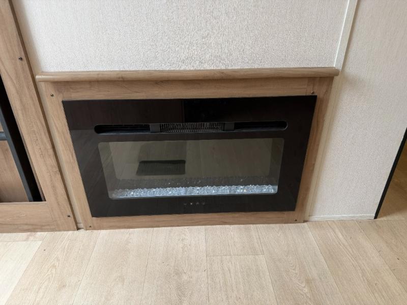 Escape your ordinary life with this innovative travel trailer! It features 64" top bunk bed above a 36" bottom bunk with wardrobes on either side of them, plus there is a wall at the foot of the beds with a fireplace on the other side. You will have your own privacy with the front private bedroom that has a walk-around bed (queen bed currently in the picture, king will fit) with wardrobes on either side and an entrance into the dual entry bathroom which has a neo-angled shower to freshen up in each morning plus one of the dual entry doors to the unit. The sofa and U-shaped dinette can also transform into extra sleeping spaces when you aren't using them to enjoy a meal or relax in front of the TV mount. The outdoor bar and grill comes with a 5.6 cu. ft. outdoor refrigerator and everything you need to prepare delicious meals outdoors. You even have a rear storage rack and outside storage areas to store your outdoor gear!
