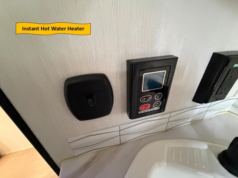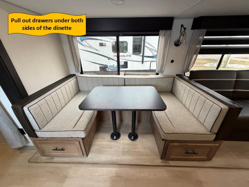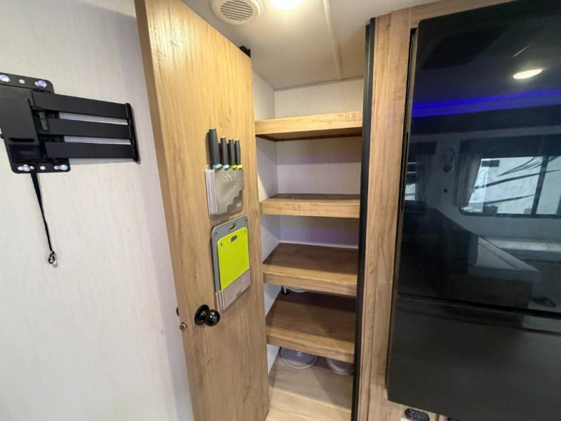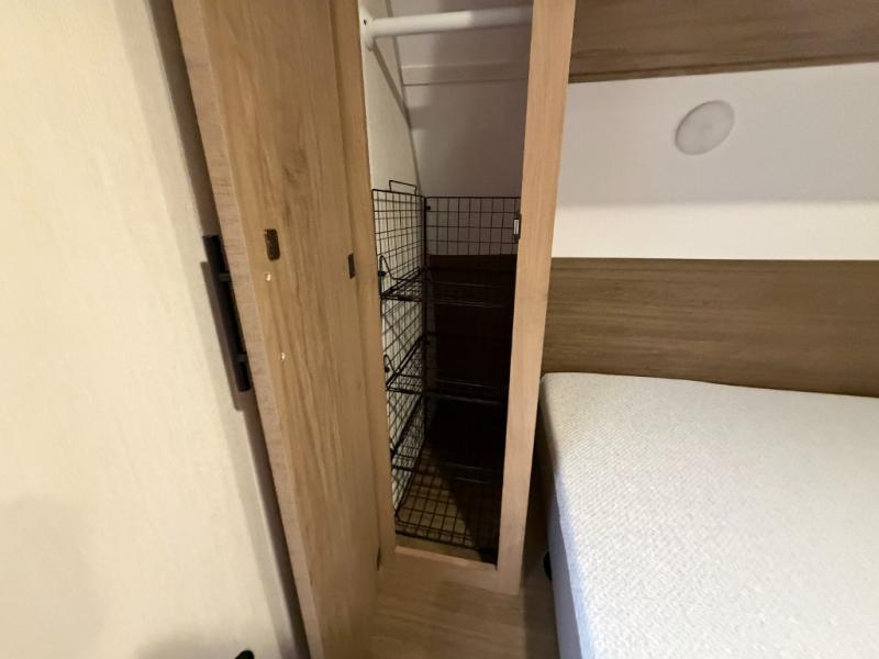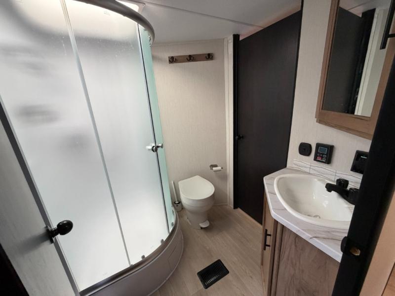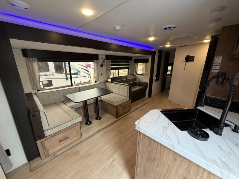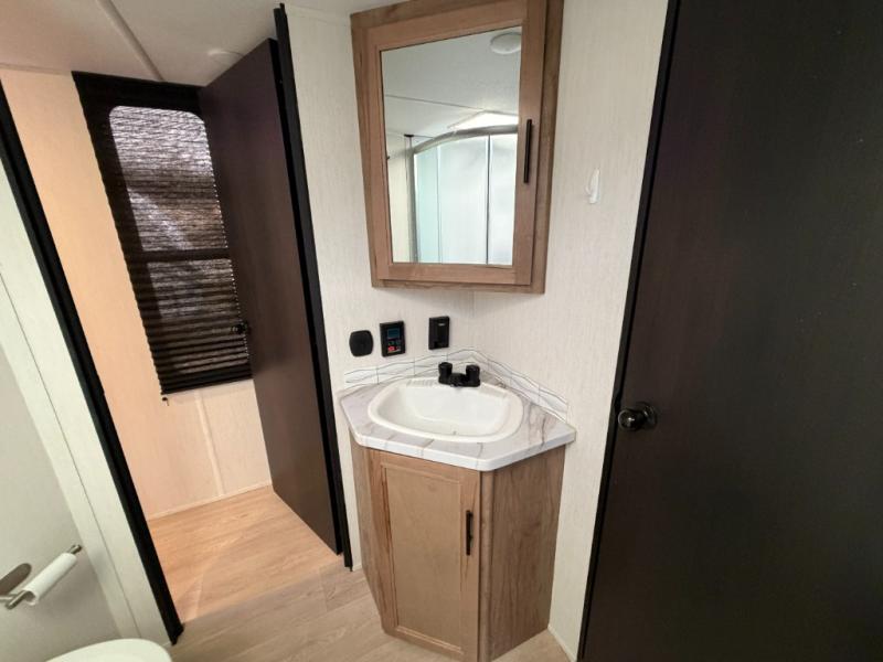 Escape your ordinary life with this innovative travel trailer! It features 64" top bunk bed above a 36" bottom bunk with wardrobes on either side of them, plus there is a wall at the foot of the beds with a fireplace on the other side. You will have your own privacy with the front private bedroom that has a walk-around bed (queen bed currently in the picture, king will fit) with wardrobes on either side and an entrance into the dual entry bathroom which has a neo-angled shower to freshen up in each morning plus one of the dual entry doors to the unit. The sofa and U-shaped dinette can also transform into extra sleeping spaces when you aren't using them to enjoy a meal or relax in front of the TV mount. The outdoor bar and grill comes with a 5.6 cu. ft. outdoor refrigerator and everything you need to prepare delicious meals outdoors. You even have a rear storage rack and outside storage areas to store your outdoor gear!