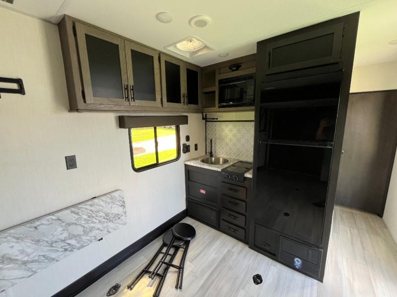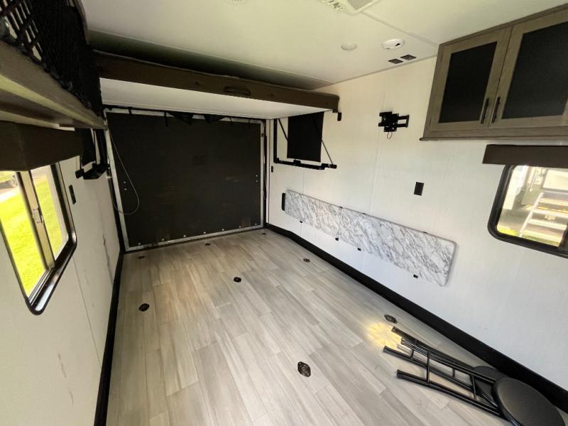 You'll love every minute spent in this spacious toy hauler! Since there is 14' of total garage space, you can plan to bring along kayaks, bikes, and hiking gear galore. This model includes a flip-up counter with stools, glass patio doors, and full kitchen amenities so you can whip up your best meals each day. The full bath will let you freshen up at night, and the king bed in the front bedroom is sure to bring comfort!