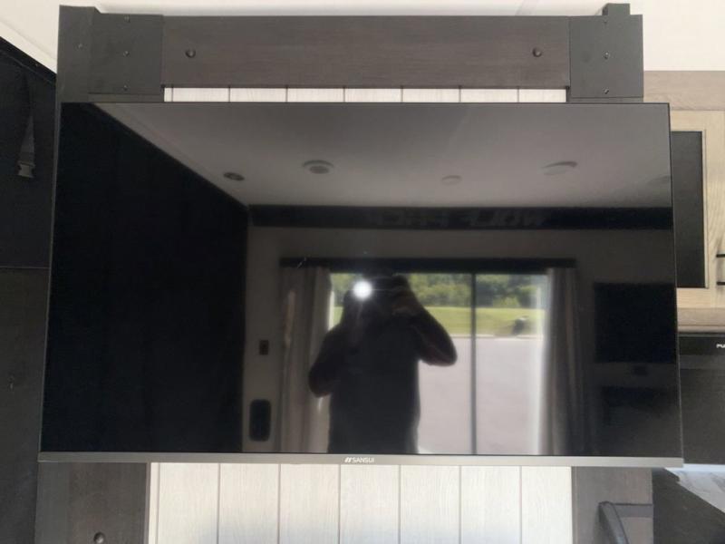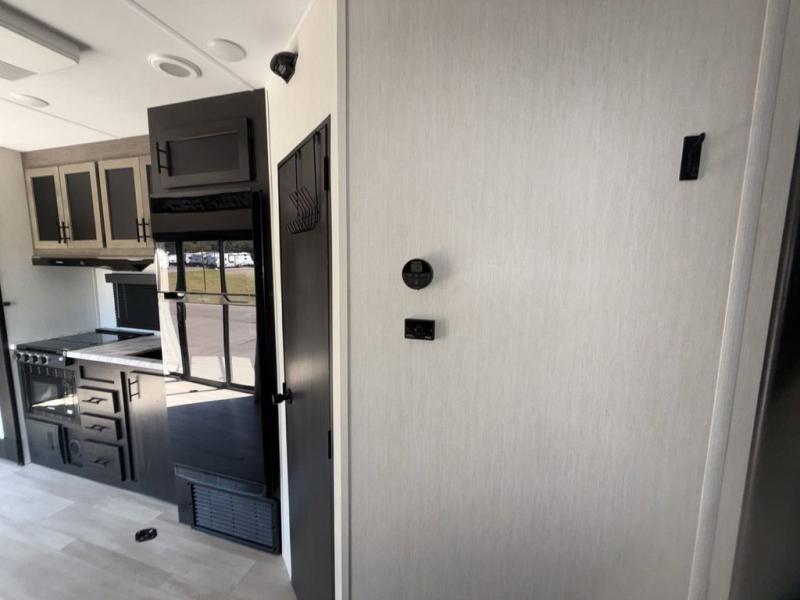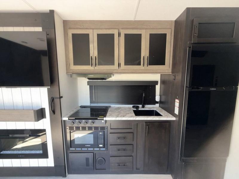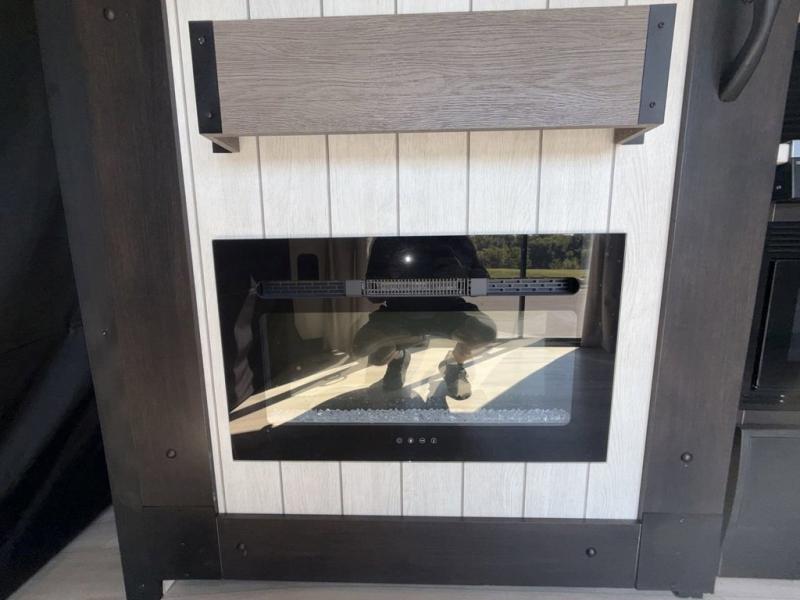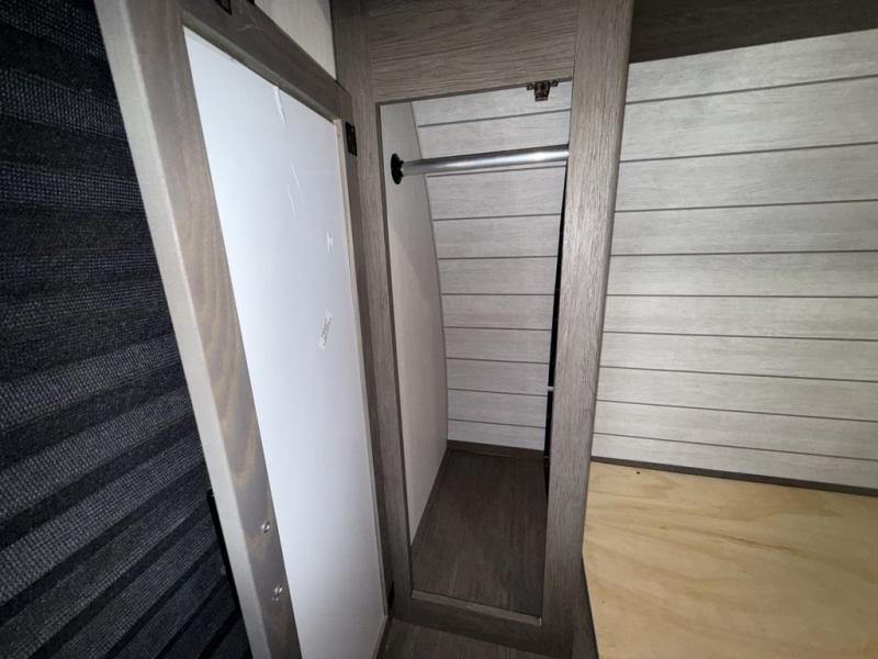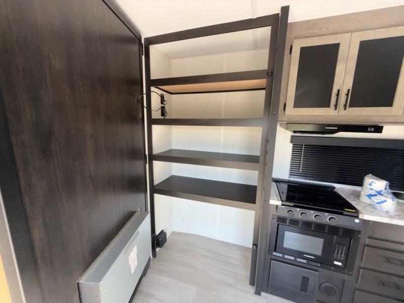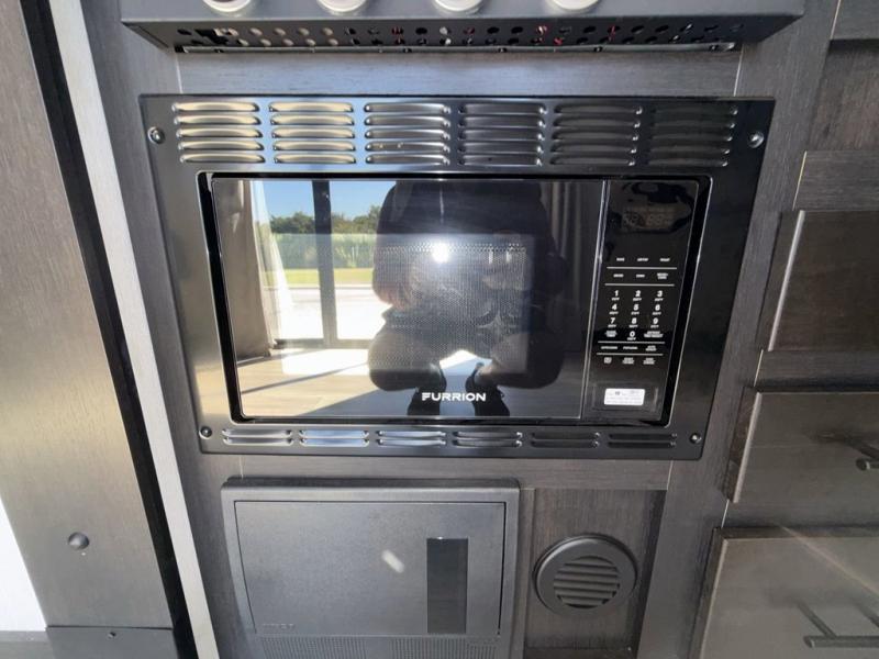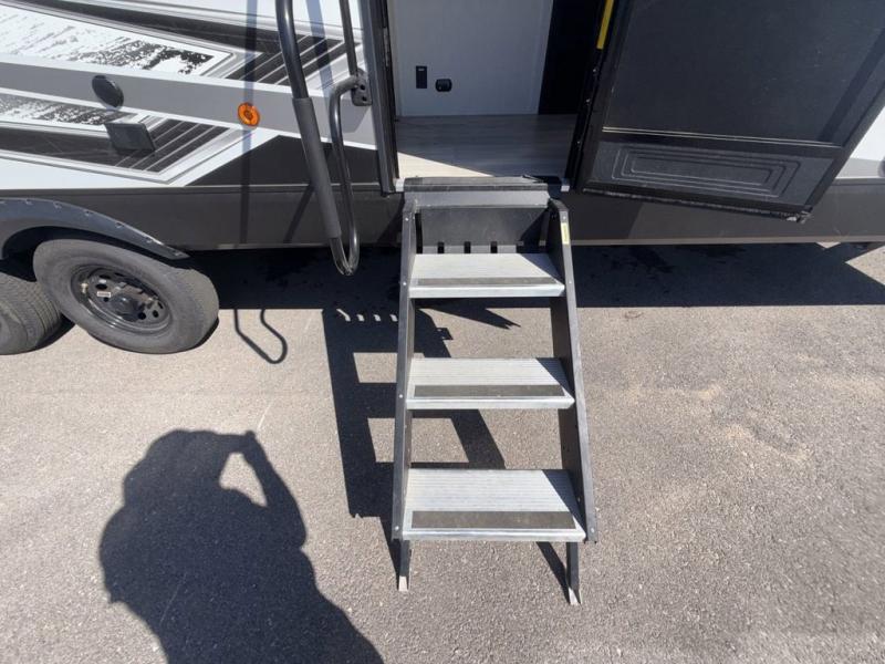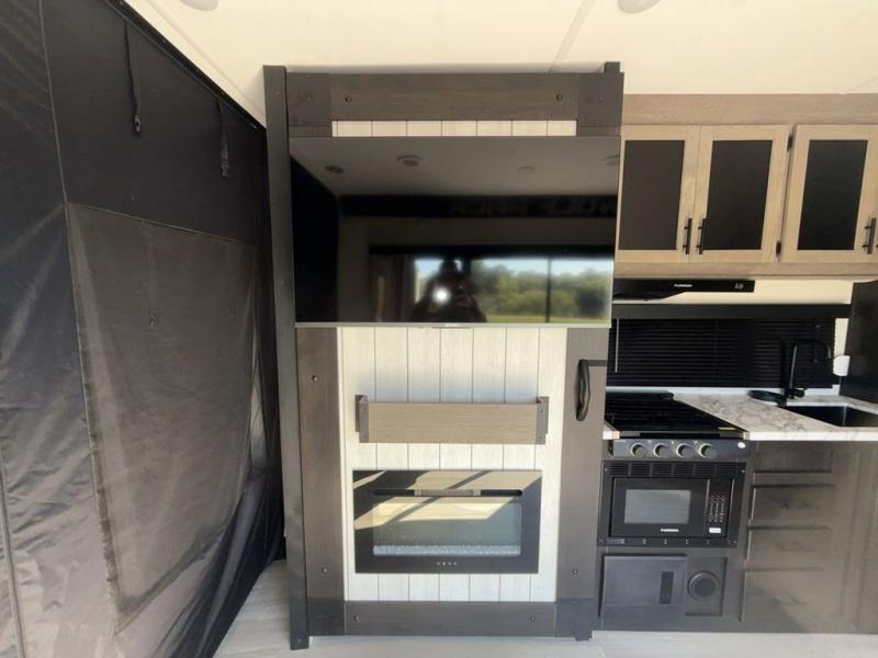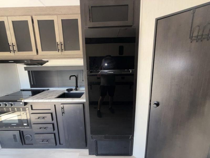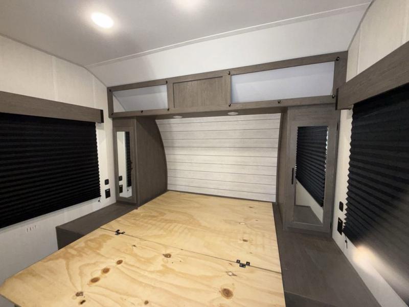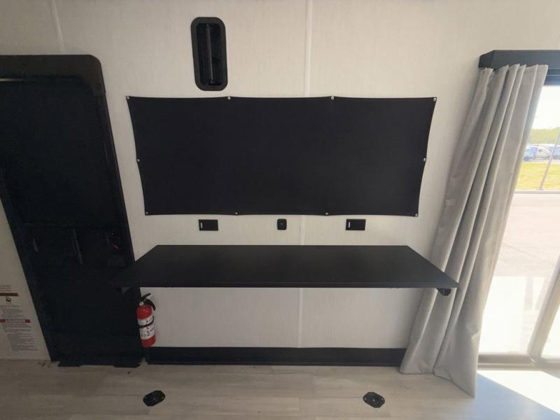 This toy hauler features 22' of total cargo space when you utilize the floor all the way up to the RV king bed. There is a flip-up counter with stools which will allow you to easily pack in gear when it's time to go home, and the ramp door makes for easy unloading. You can whip up meals each day with the full kitchen amenities, and the mid-coach full bath will let you freshen up after trail riding. This unit features ample storage space, including dual bedroom wardrobes, a hidden XL pantry behind the entertainment center, plus pass-through storage outside for fishing poles and more!