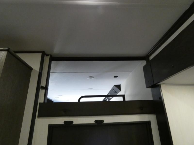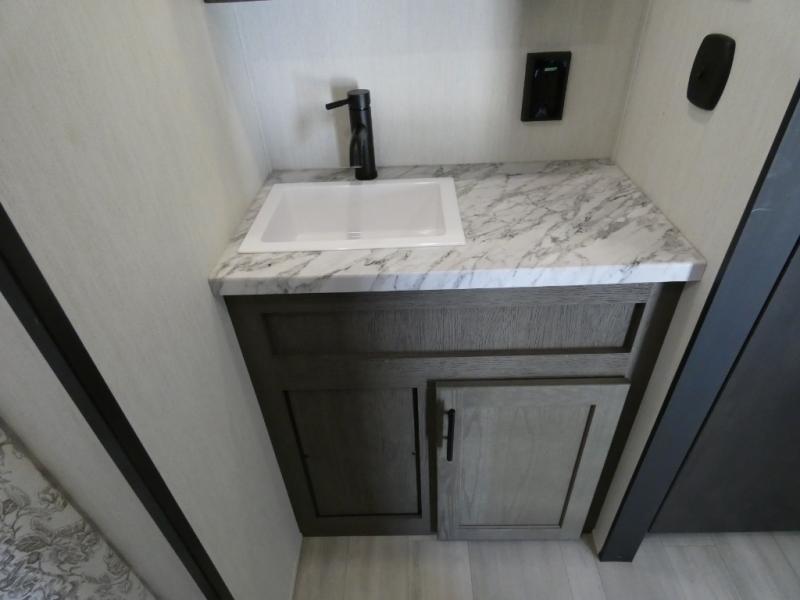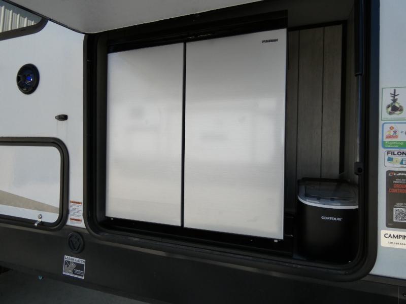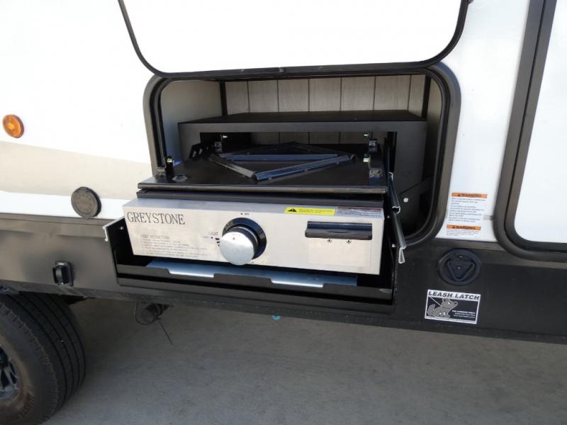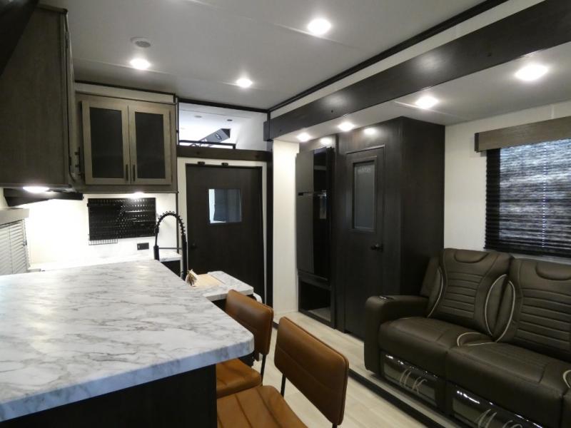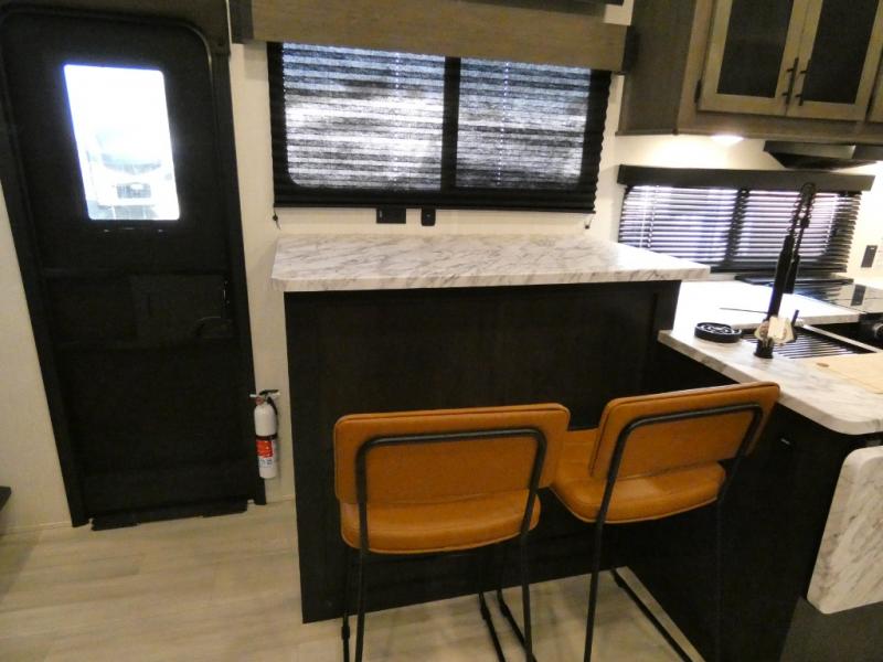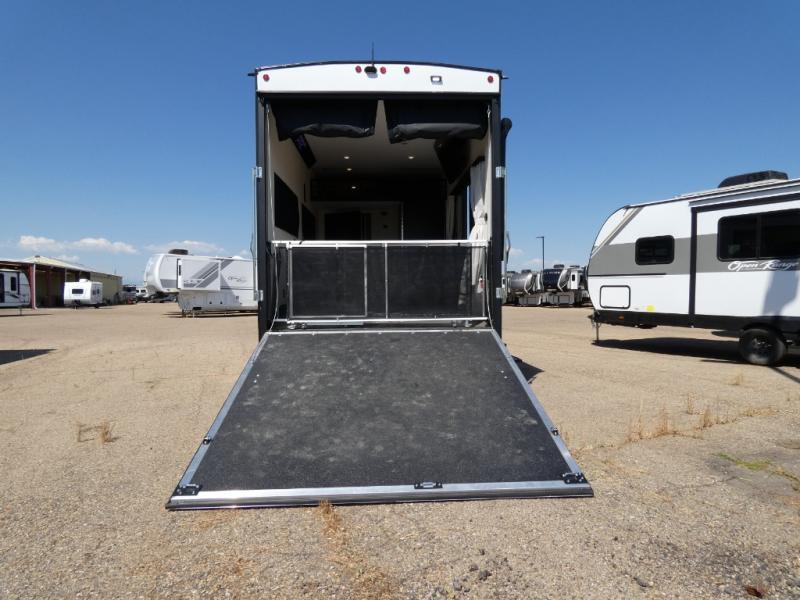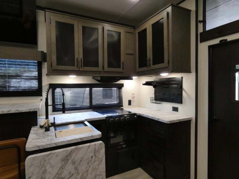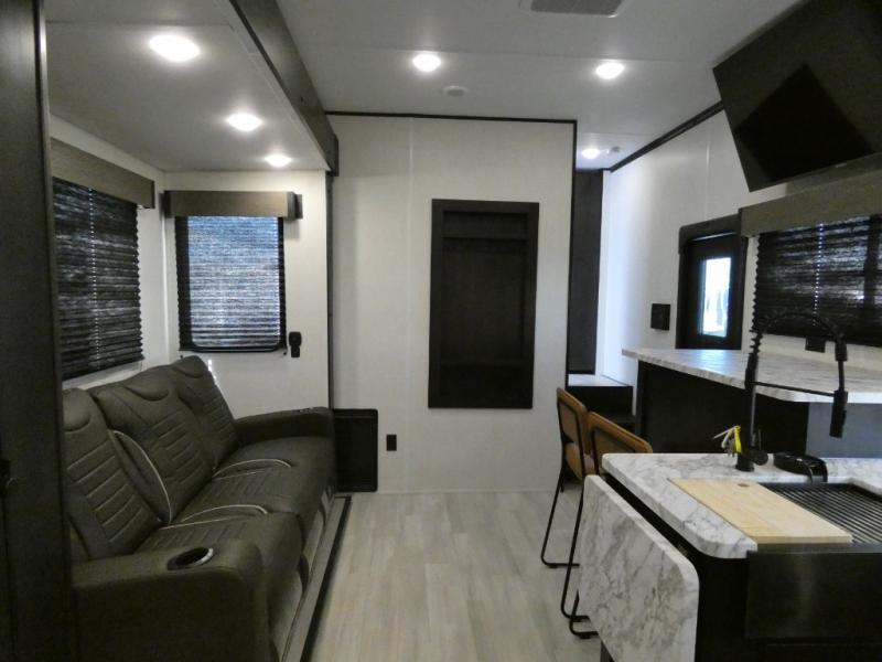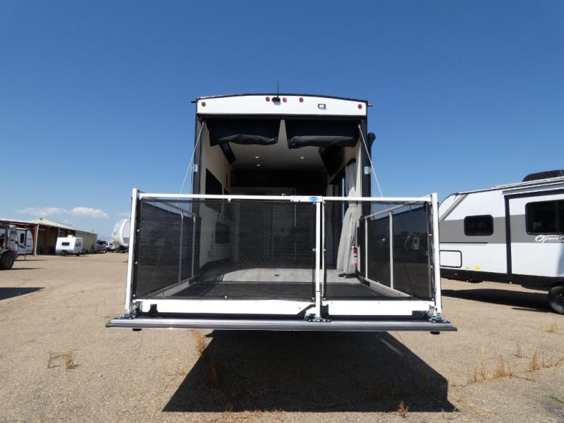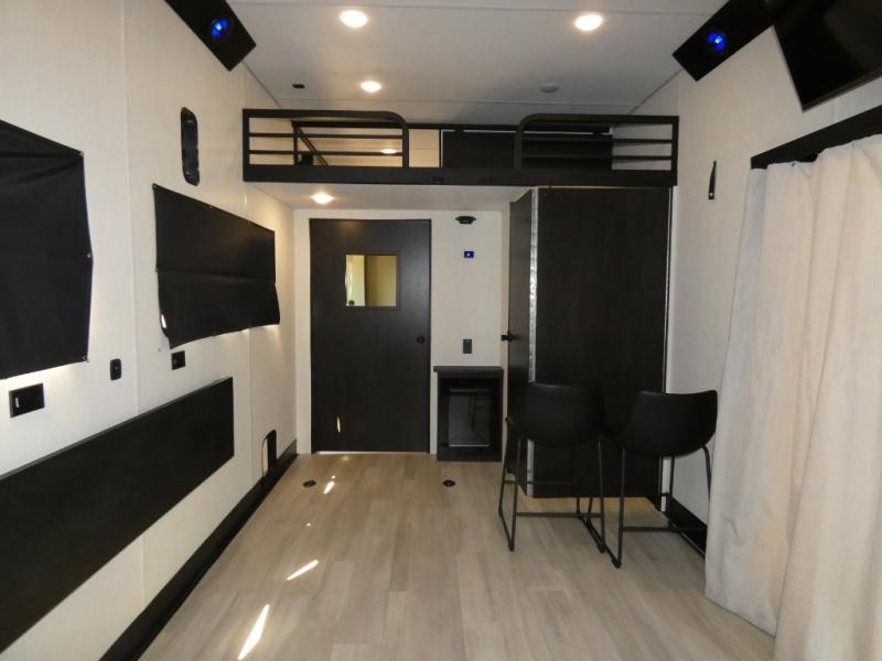 Fun at the campground begins with this dual entry toy hauler in tow! There is a 15' 6" separate garage with glass patio doors, a loft above for guests, a half bath with folding walls and a flip-down recessed bath sink. The combined kitchen and living room features a U-shaped kitchen with a flip-up countertop, a sofa slide out, and a bartop with two stools. There is even an outdoor kitchen on the other side of this counter so you can make breakfast as the sun comes up. A full bath lets you freshen up after a trail ride, and the front private bedroom gives you your own space at night. This unit also features washer and dryer prep in the bedroom so you can add those appliances if you wish!
