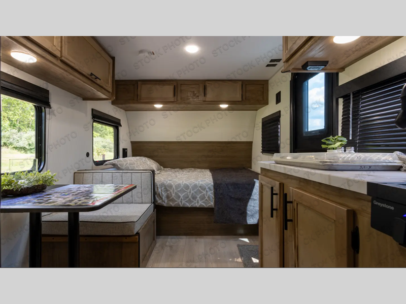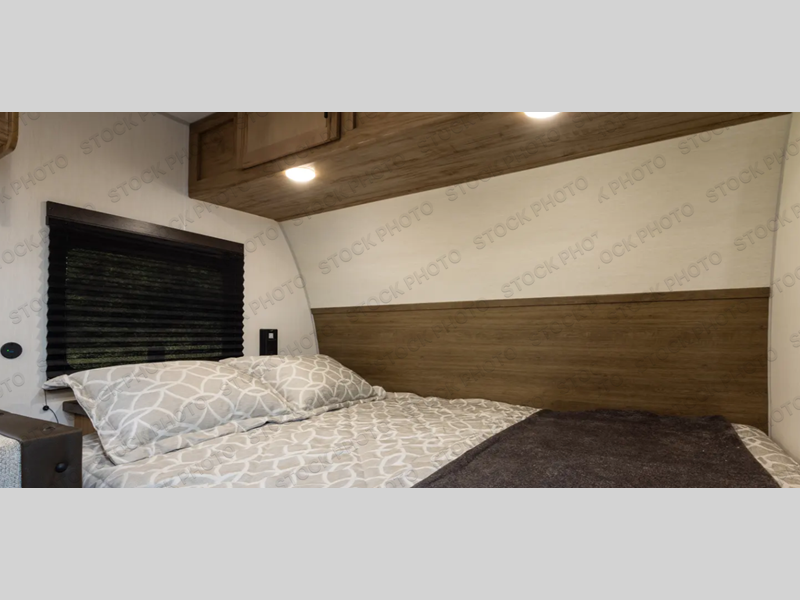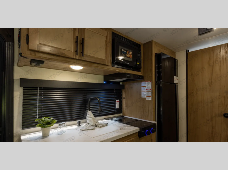 The whole family can sleep comfortably in this travel trailer! It has a set of bunk beds for the kids to sleep on, and you can sleep comfortably on the front queen bed with overhead cabinets and a shelf. There is even an exterior storage plus door that accesses the storage space under the bottom bunk. The chef will enjoy preparing their best home cooked meals either indoors with the high output cooktop or at the outside mini kitchen while staying protected by the 12' power awning!