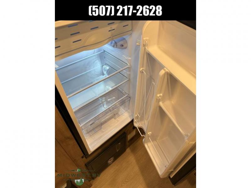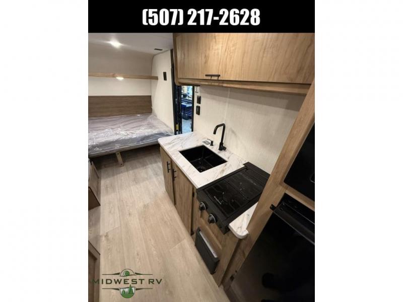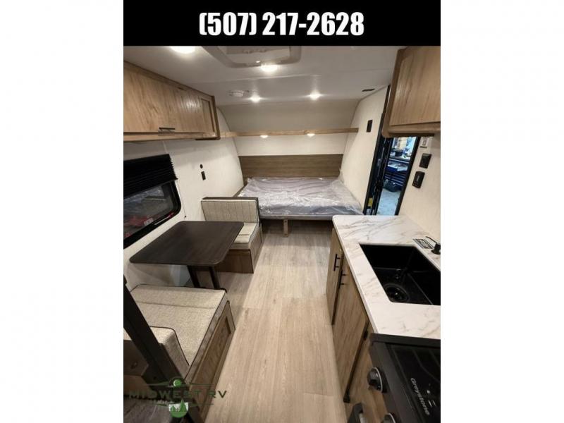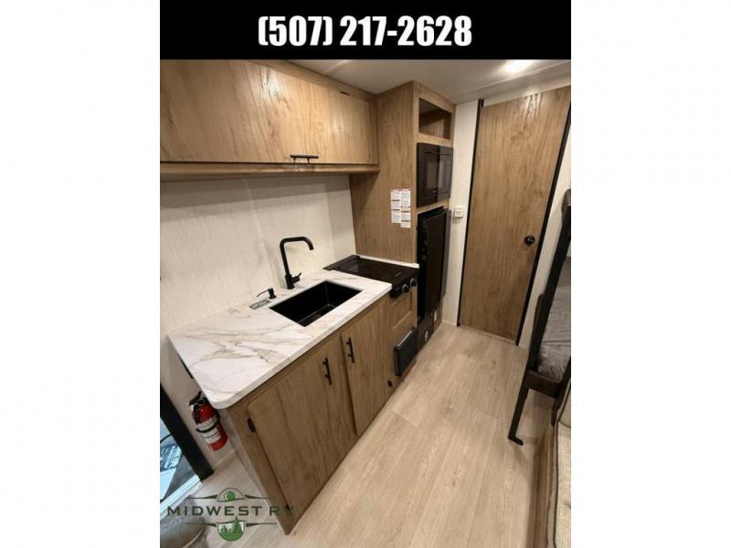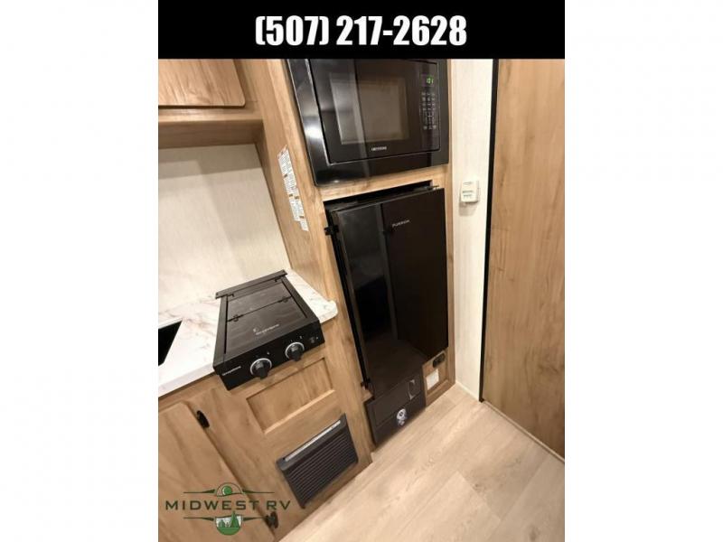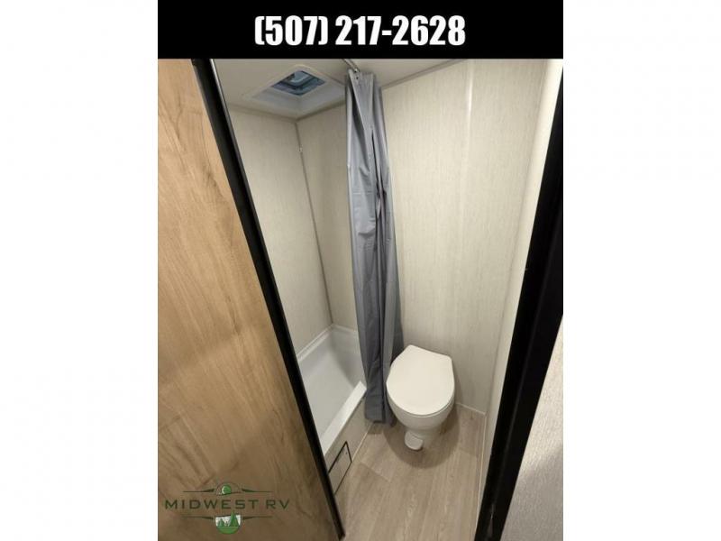 The whole family can sleep comfortably in this travel trailer! It has a set of bunk beds for the kids to sleep on, and you can sleep comfortably on the front queen bed with overhead cabinets and a shelf. The chef will enjoy preparing their best home cooked meals with the high output cooktop, and you can dine at the booth dinette. And the private bath onboard means you won't have to leave your camper in the middle of the night!