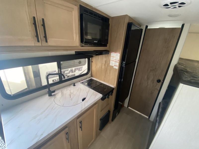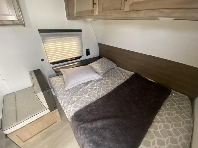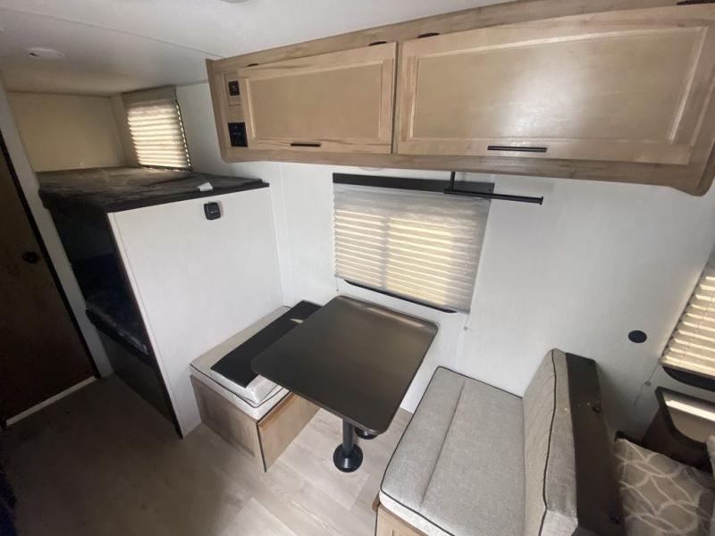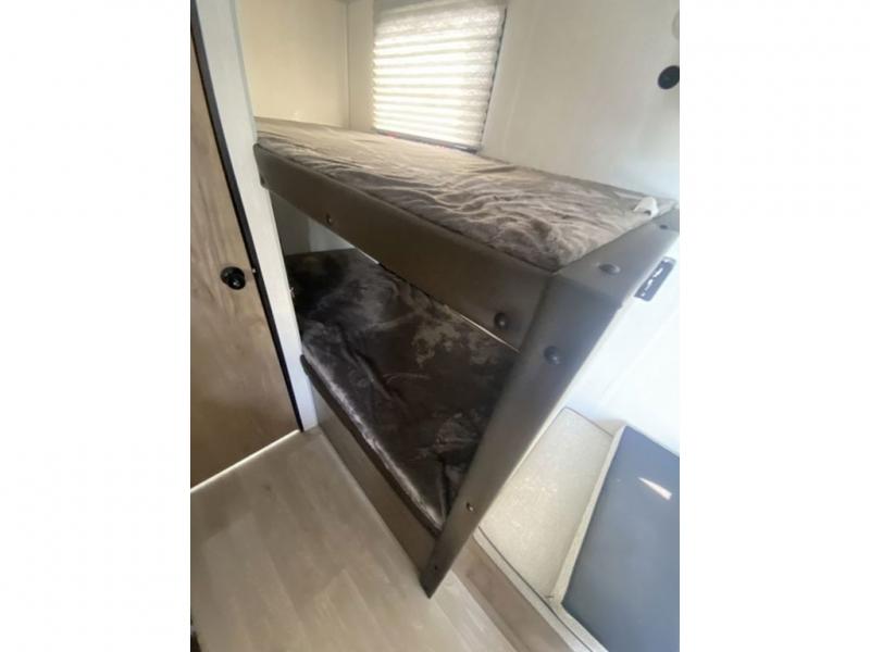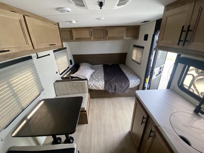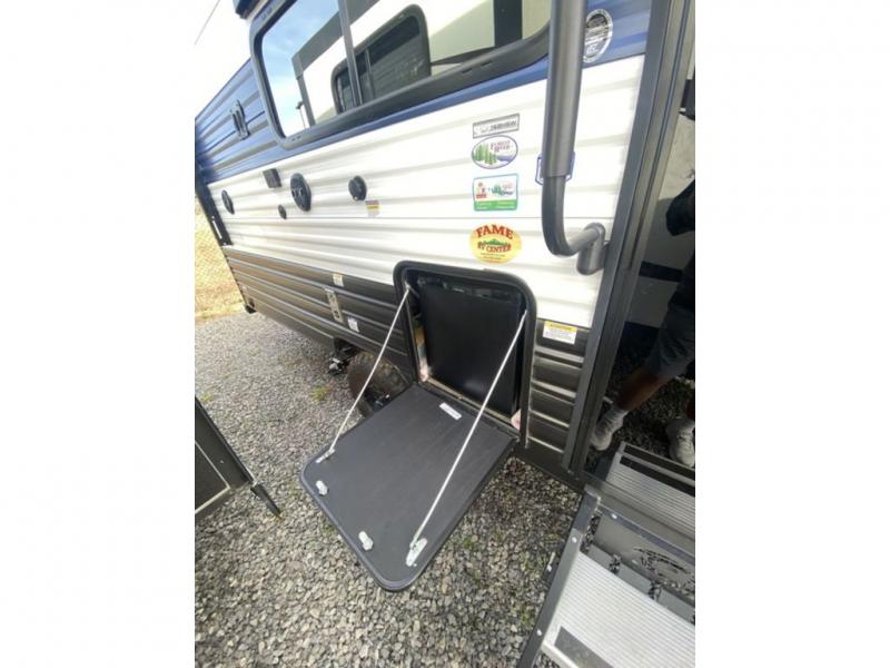 The whole family can sleep comfortably in this travel trailer! It has a set of bunk beds for the kids or guests to sleep on, and you can sleep comfortably on the front queen bed with overhead cabinets and a shelf. There is even an exterior storage plus door that accesses the storage space under the bottom bunk. The chef will enjoy preparing their best home cooked meals either indoors with the high output cooktop or at the outside mini kitchen while staying protected by the 12' power awning!