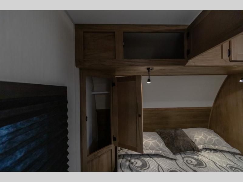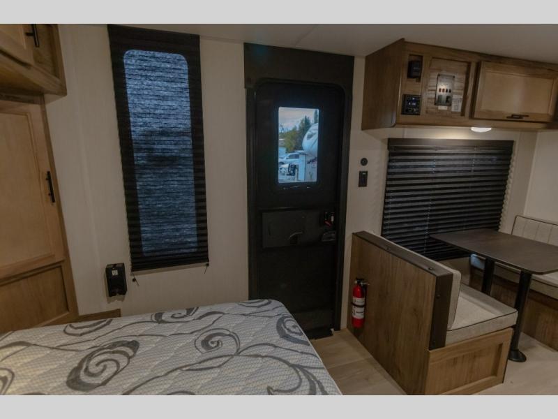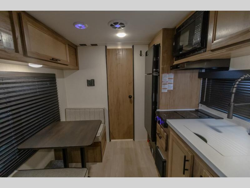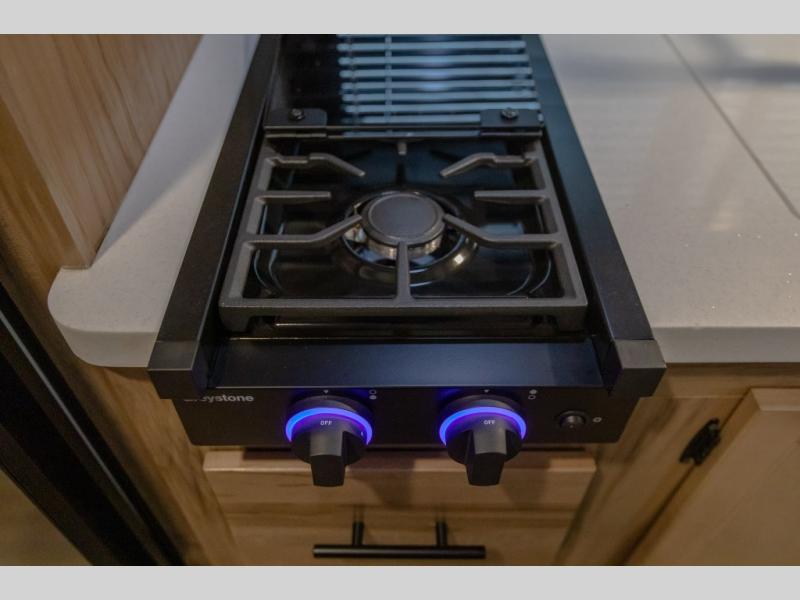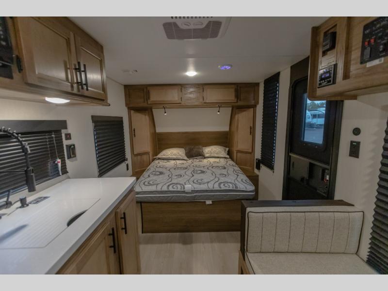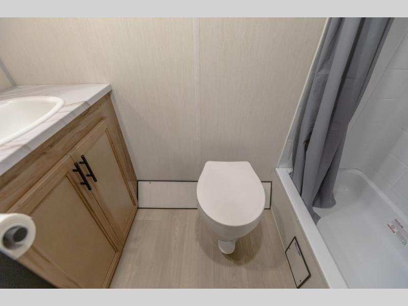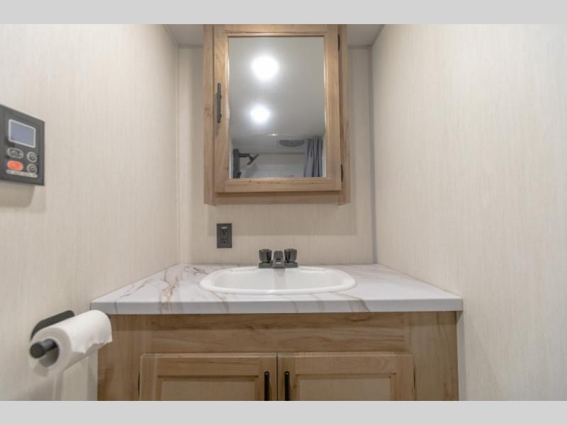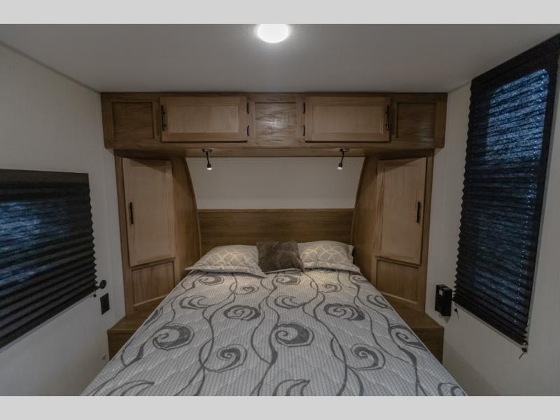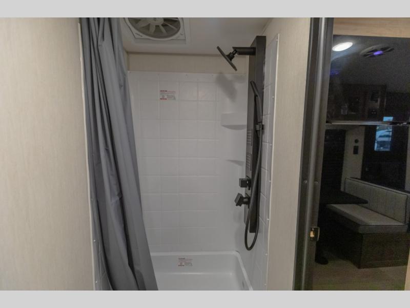 You will love camping in this travel trailer with your own queen bed up front! Freshen up each morning in the full rear bathroom with the tub/shower, toilet, and sink. Fill your bellies with the perishables stored in the 12V high efficiency refrigerator and cook them on the high output cooktop. You could even prepare a meal while breathing in some fresh air at the outside mini kitchen while staying protected by the 12' power awning. Easily store all of your outdoor gear in the outside storage area too!