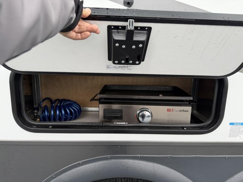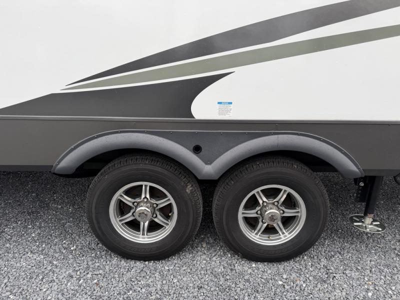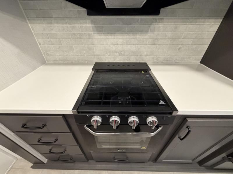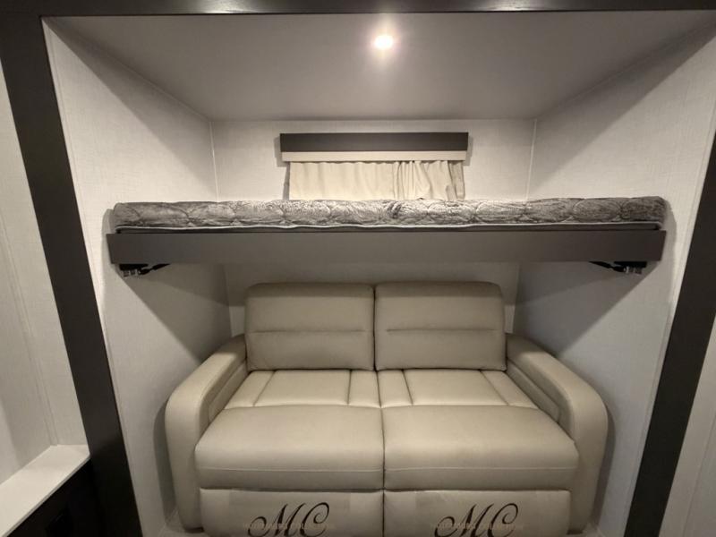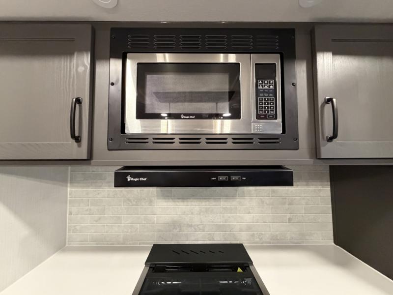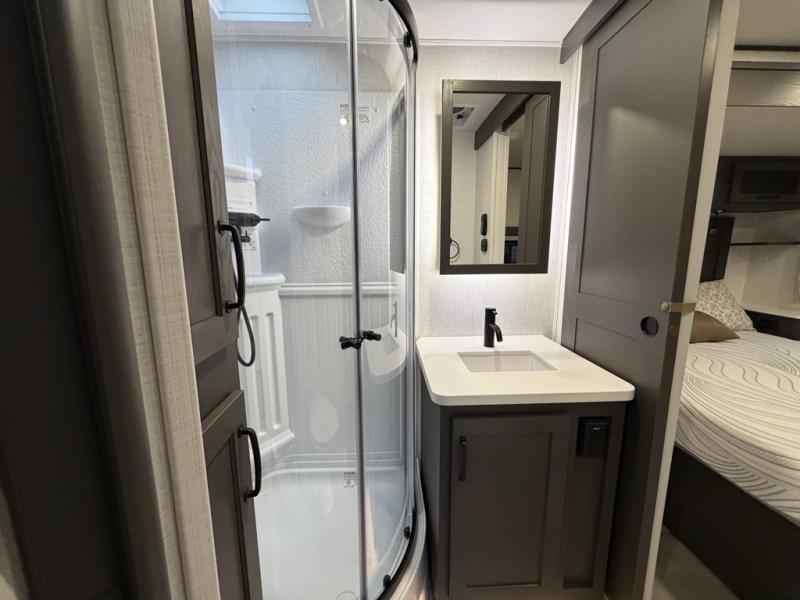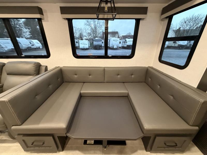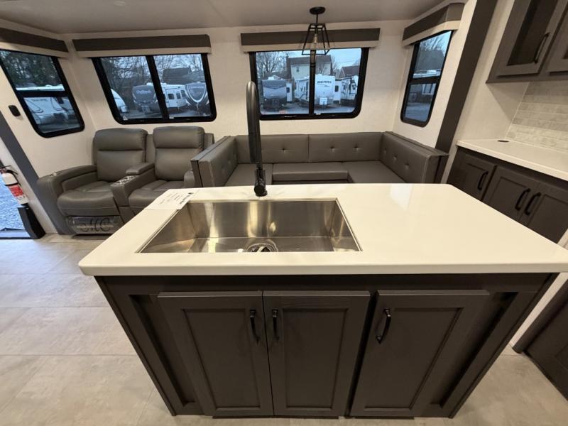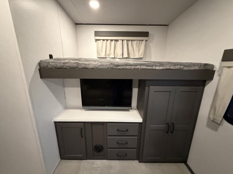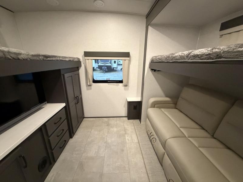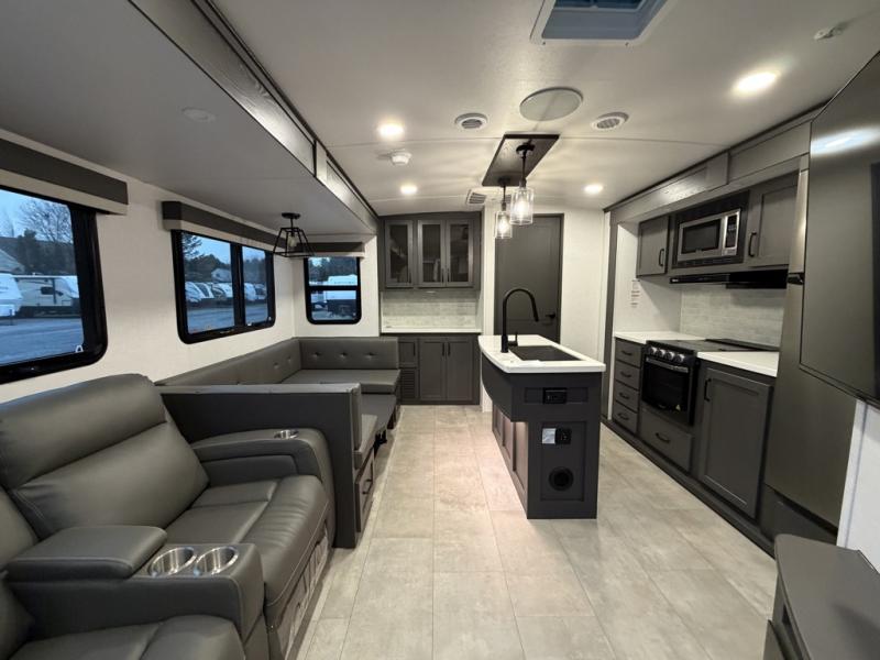 The whole family will love camping in this travel trailer! The kids have their own privacy within the rear bunkhouse that features a 42" x 72" upper bunk with a TV option below it along the curbside, and a flip-up bunk with a 68" pull-out sofa below it along the roadside. After you have prepared a delicious home-cooked meal with the three-burner cooktop and kitchen island, you can head to the 44" x 81" U-shaped dinette where everyone can gather around. You could even prepare dinner at the outside kitchen, set up a table and chairs, and eat underneath the 11' power awning. The 60" hide-a-bed sofa is the perfect place to sit while enjoying the fireplace or watching your favorite movie on the LED TV. A dual-entry bathroom makes it easy for everyone to access especially those staying in the front private bedroom!