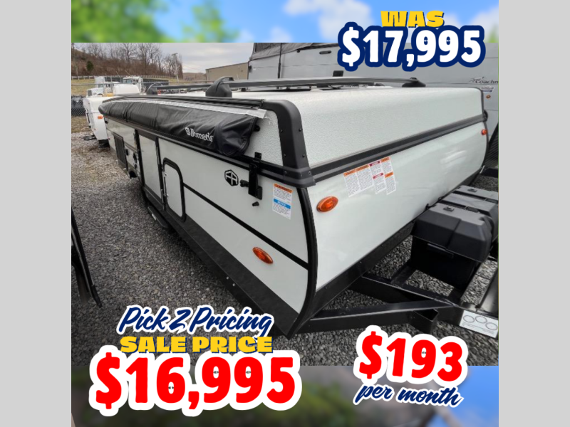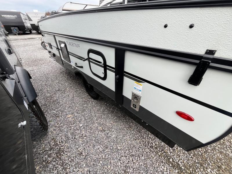 You'll be pleasantly surprised by the amount of comfort in these Flagstaff MAC Series folding pop-up campers by Forest River. Each one is built with a fiberglass laminated roof for added durability and a power roof lift for easy set up. There is also a clay exterior with an alloy band, solar panel prep on the frame, and four stabilizer jacks with sand pads to keep your camper secure. The interior features wood plank flooring, heated mattresses on the bunk ends, USB charging ports, and stylish Andover Sable wood.