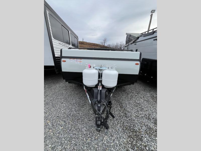 You can't go wrong in this camper with a slide out for more space! You can dine at the booth dinette, relax on the gaucho bed, and enjoy the under bunk A/C. There is also a 70" x 80" front tent end bed and a 60" x 80" rear tent end bed for comfortable sleeping spaces at night. In the morning you can whip up breakfast on the three burner range, put the eggs back in the 12V refrigerator, and easily clean up with the sink!